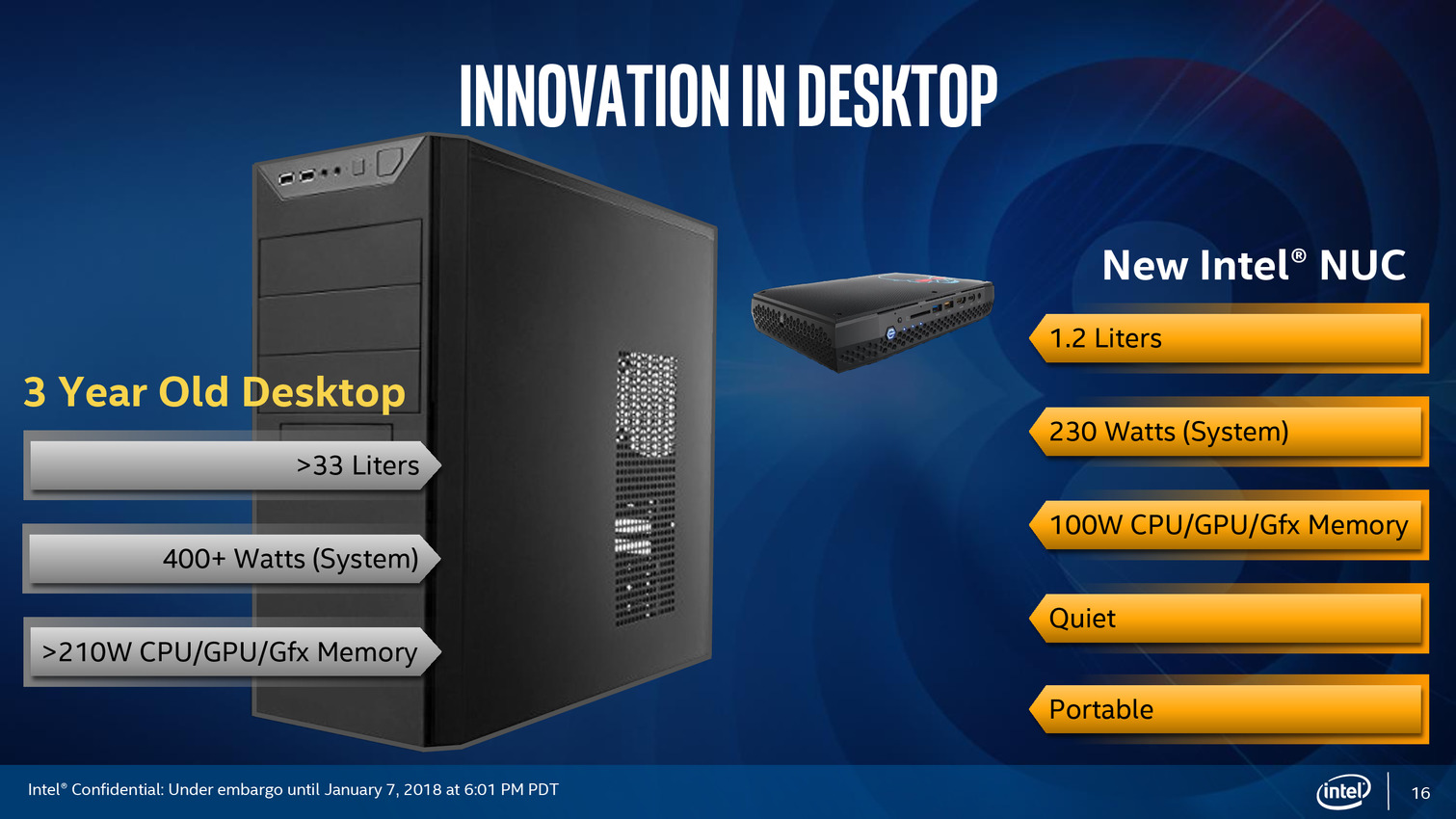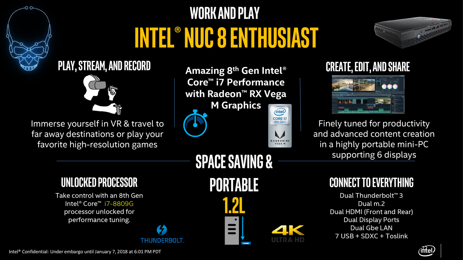 En plus de portables qui seront annoncés demain, Intel annonce aujourd'hui qu'il proposera deux NUC, utilisant respectivement un modèle GH (Core i7-8809G) et un modèle GL (Core i7-8705G) de Vega M. Question disponibilité, il faudra attendre encore un peu, elle est attendue courant du premier trimestre.