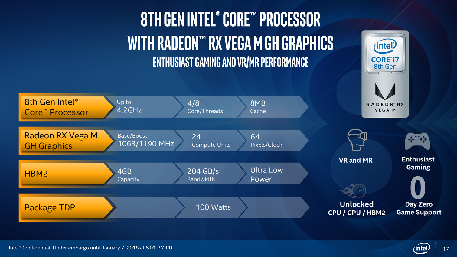 • Core i7-8809G : 4C/8T à 3.1-4.1 GHz, 24 CUs à 1190 MHz, 4 Go de HBM2 à 800 MHz