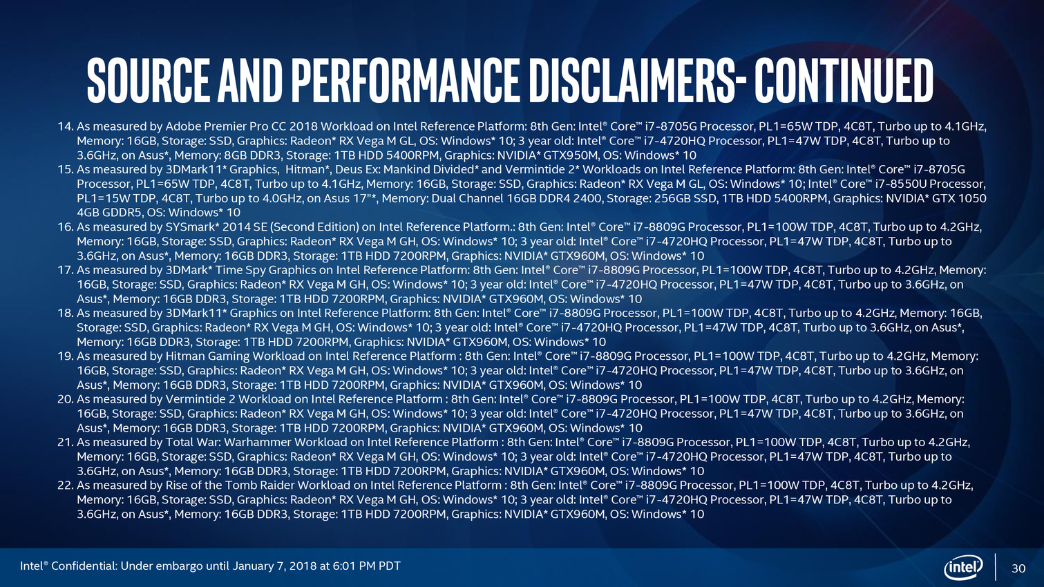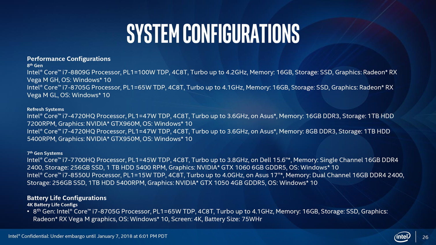 • Core i7-8705G : 4C/8T à 3.1-4.1 GHz, 24 CUs à 1000 MHz, 4 Go de HBM2 à 700 MHz