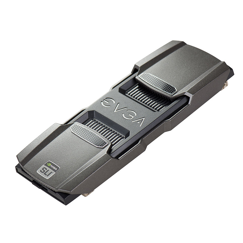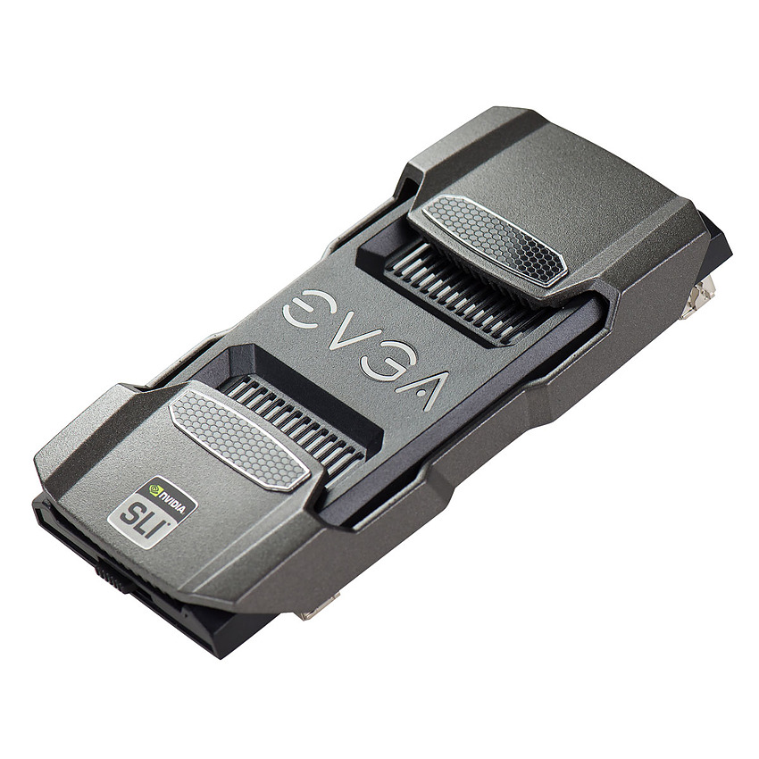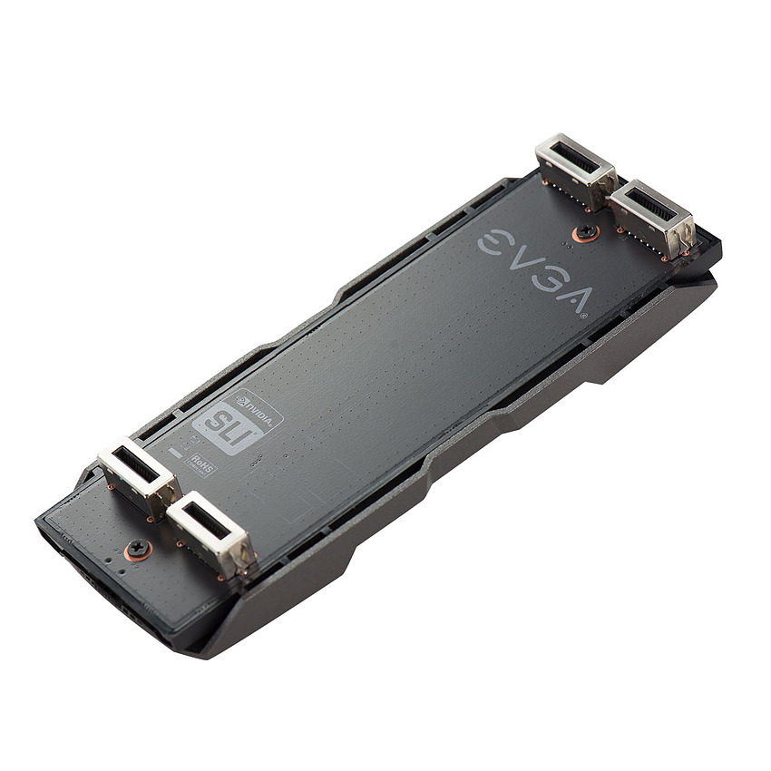 Pour ceux qui vont au-delà et ont besoin de deux liens à 650 MHz, il faut un nouveau type de pont SLI dit "HB". EVGA est le premier à lancer ce type de pont sur le marché, en 4 versions selon l'espacement entre les cartes : 40, 60, 80 ou 120mm (soit 0, 1, 2 ou 4 slots d'écarts entre des cartes dual slot). Seules les versions 60 et 120mm sont disponibles pour le moment au tarif de 40$. C'est un peu cher le petit bout de PCB, mais à ce prix le logo EVGA peut s'illuminer au choix en rouge, vert, bleu ou blanc...