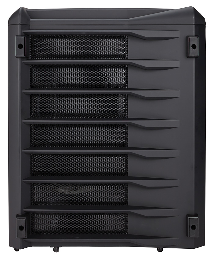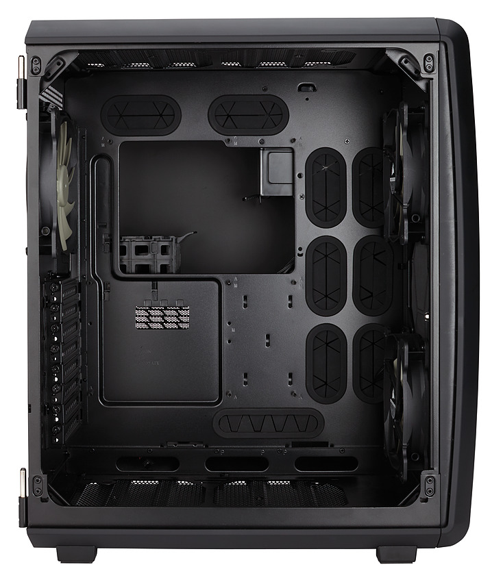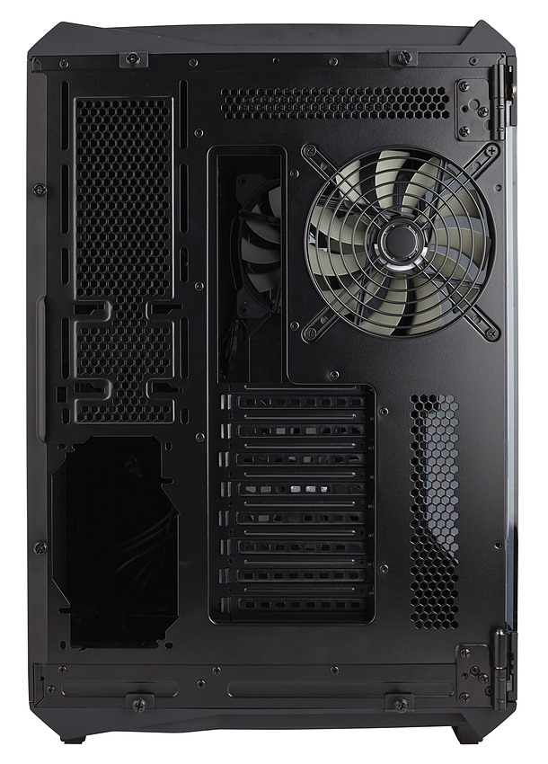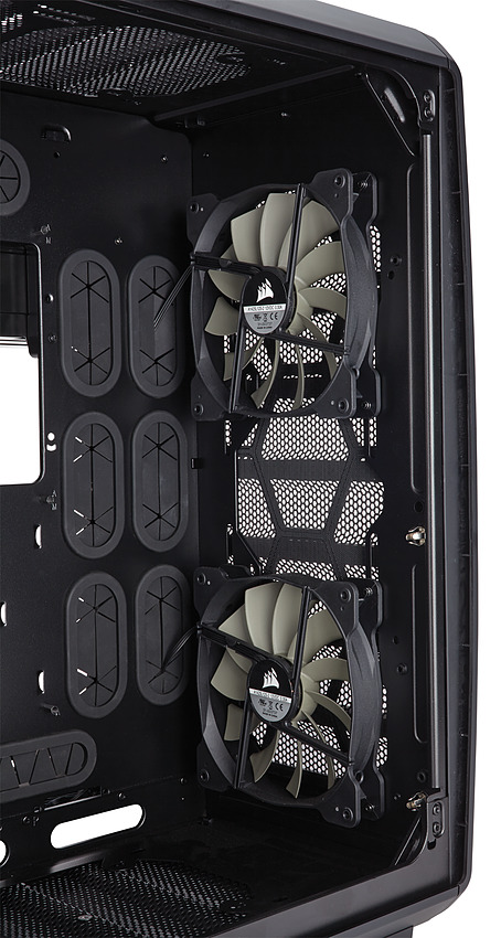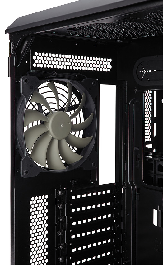 Côté refroidissement, trois ventilateurs 140mm sont inclus, deux en façade et un à l'arrière tous placés dans le compartiment gauche. On pourra si on le préfère mettre trois 120mm en façade, et ajouter deux 120/140mm en haut et en bas du boîtier. Pour ce qui est des radiateurs water cooling on pourra aller jusque 360mm en façade.