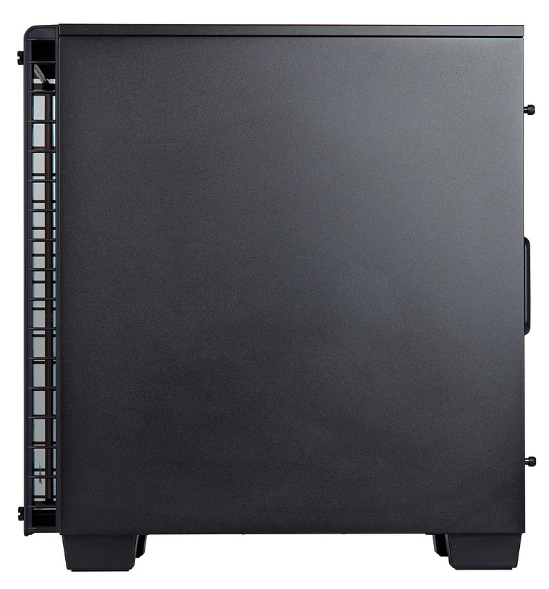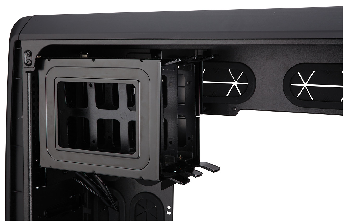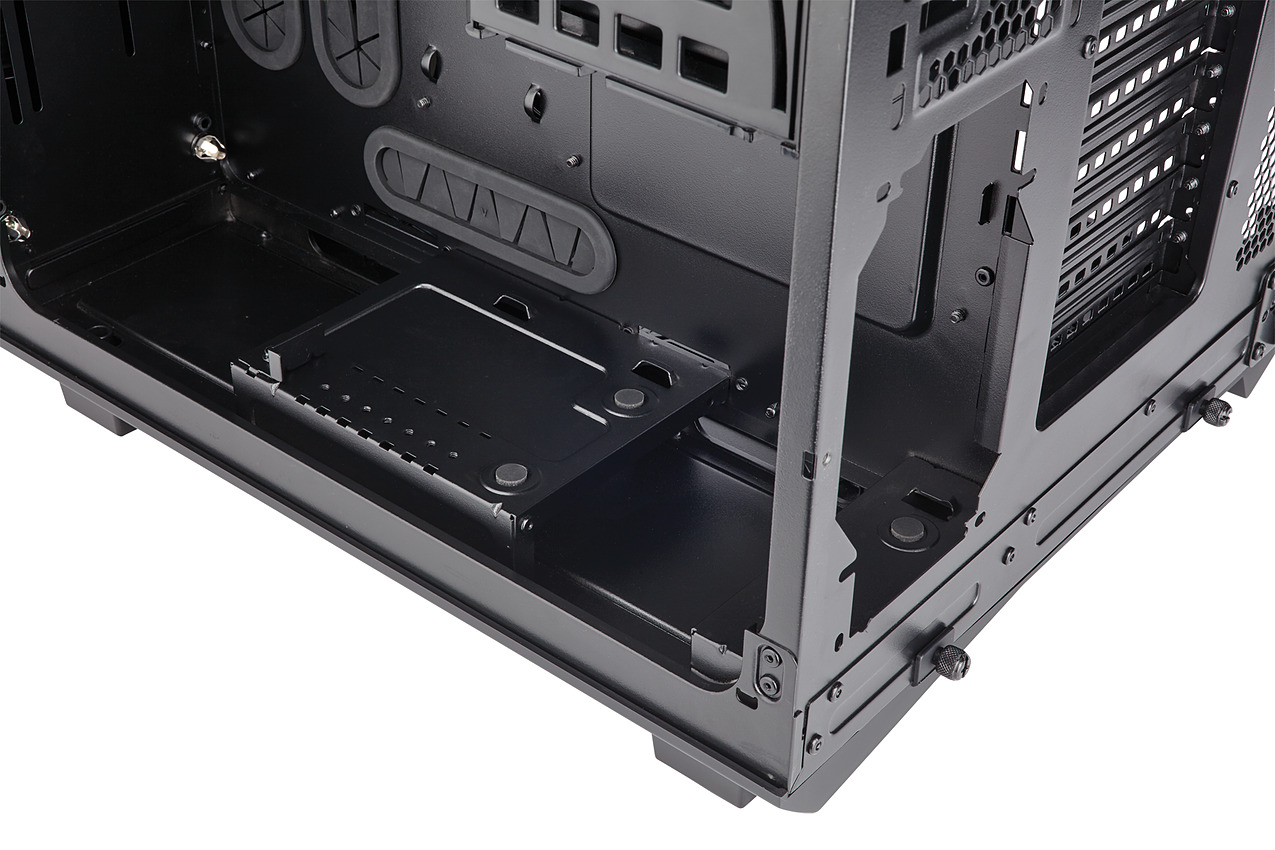 De l'autre côté, on placera l'alimentation, avec une longueur maximale de 22.5 cm et l'on trouvera trois baies pour disques 3.5 pouces, et quatre 2.5. Originalité du design, il n'y a pas d'emplacement pour un éventuel disque optique en 5.25 pouces.