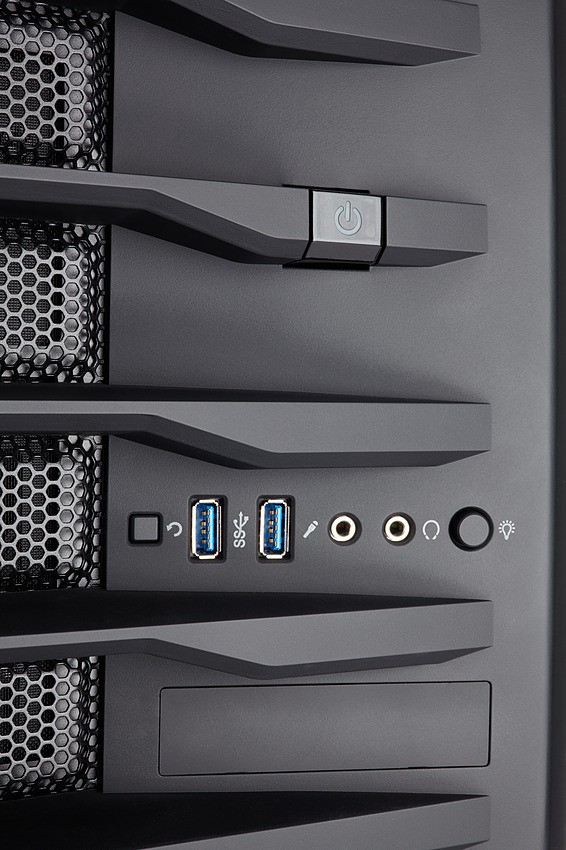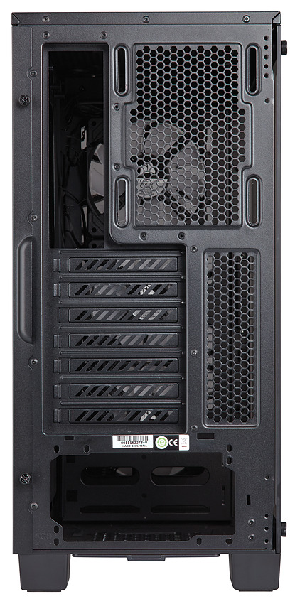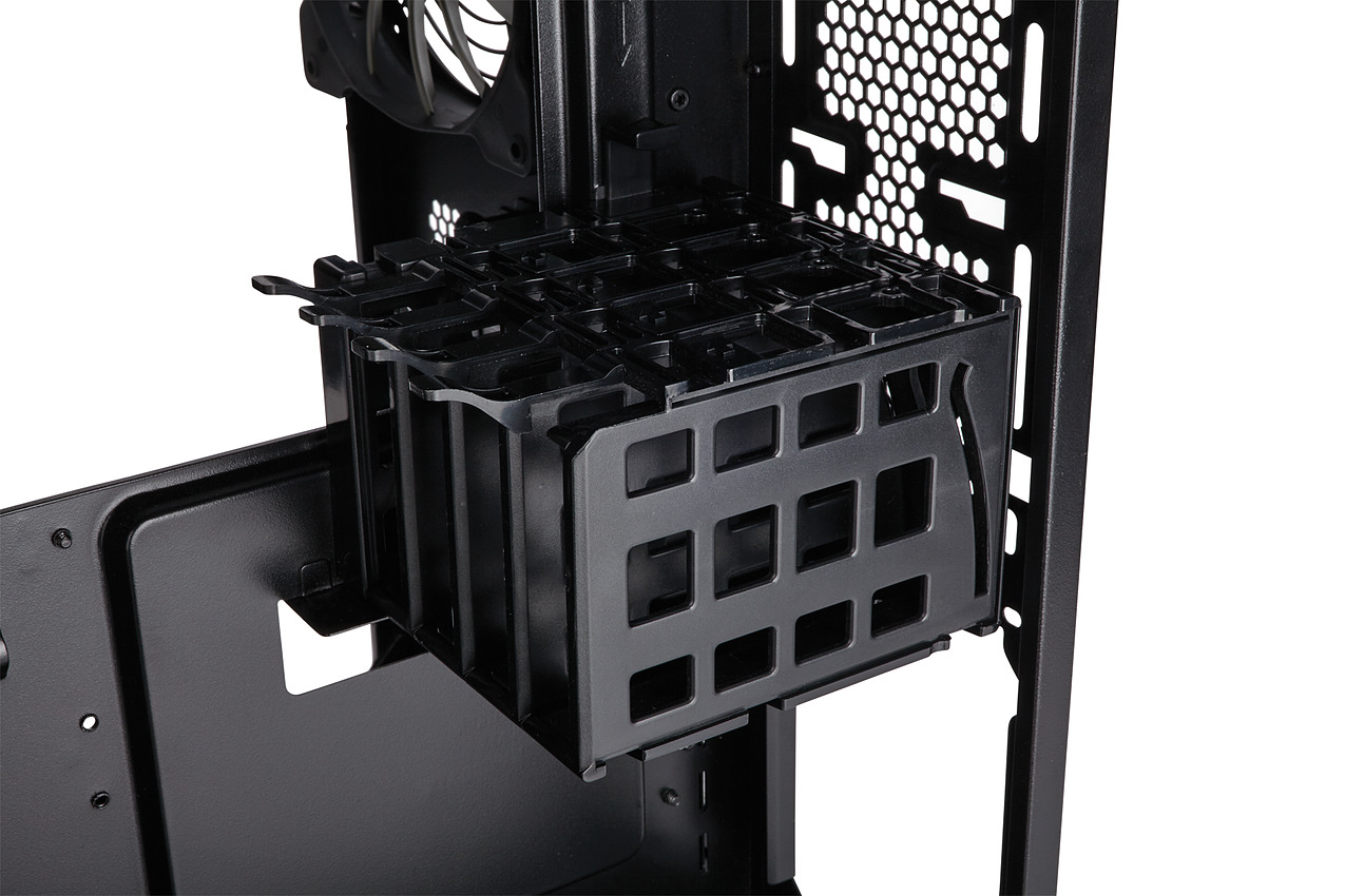 Côté stockage, une cage pour deux disques 3.5 pouces est placée en bas du boîtier, recouverte par un cache. Trois emplacement 2.5 pour SSD sont disponibles à l'arrière de la carte mère. Façade en verre oblige, une fois de plus on ne pourra pas placer de lecteur optique 5.25 dans ce boîtier.