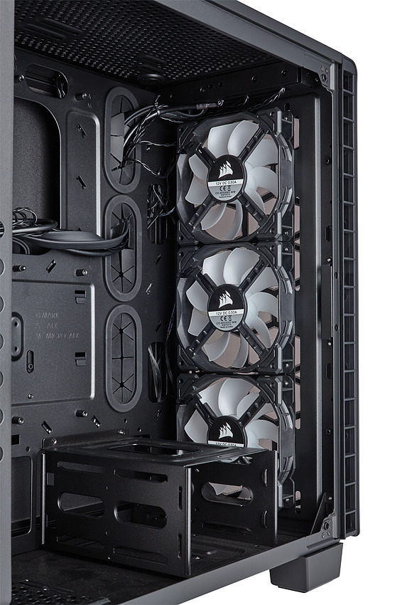 Le Crystal 460X est livré, dans sa version "RGB", avec trois ventilateurs SP120 RGB du constructeur, des ventilateurs équipés de LEDs dont on peut choisir la couleur. Aucun ventilateur n'est fourni à l'arrière, on pourra y placer un 120 mm, et également deux 120/140mm en haut du boîtier.