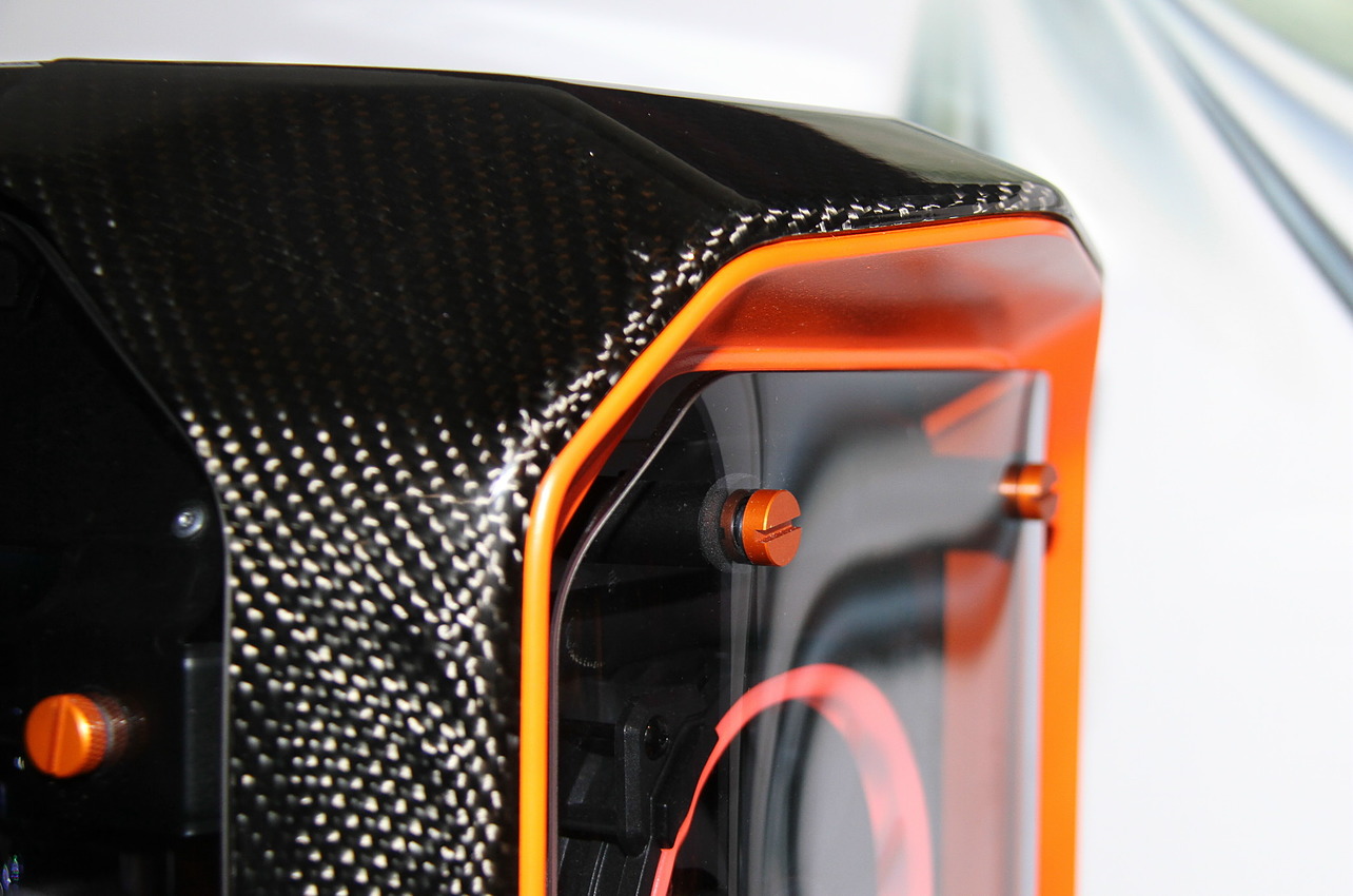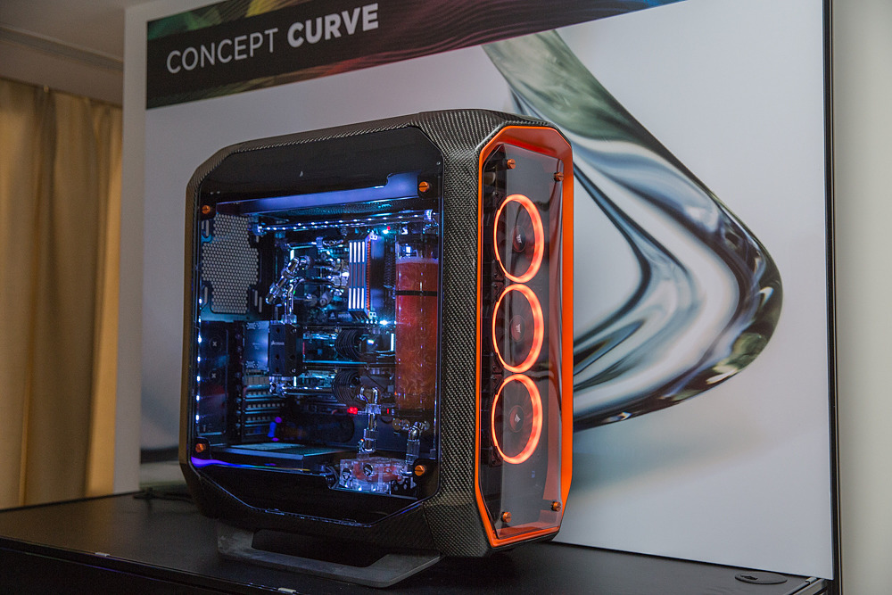 Moins extrême, le Concept Curve est une version haut de gamme du Graphite 780T. La structure externe du boîtier est recouverte de fibre de carbone et des parois en verre trempé sont exploitées sur les côtés et sur l'avant. Si nous ne sommes pas spécialement fans de la fibre de carbone, le verre trempé courbé apporte une touche très sympathique au design. Si Corsair n'est pas encore sûr de tout ce qui sera conservé quand ces concepts passeront en production, ce dernier point devrait rester de la partie.