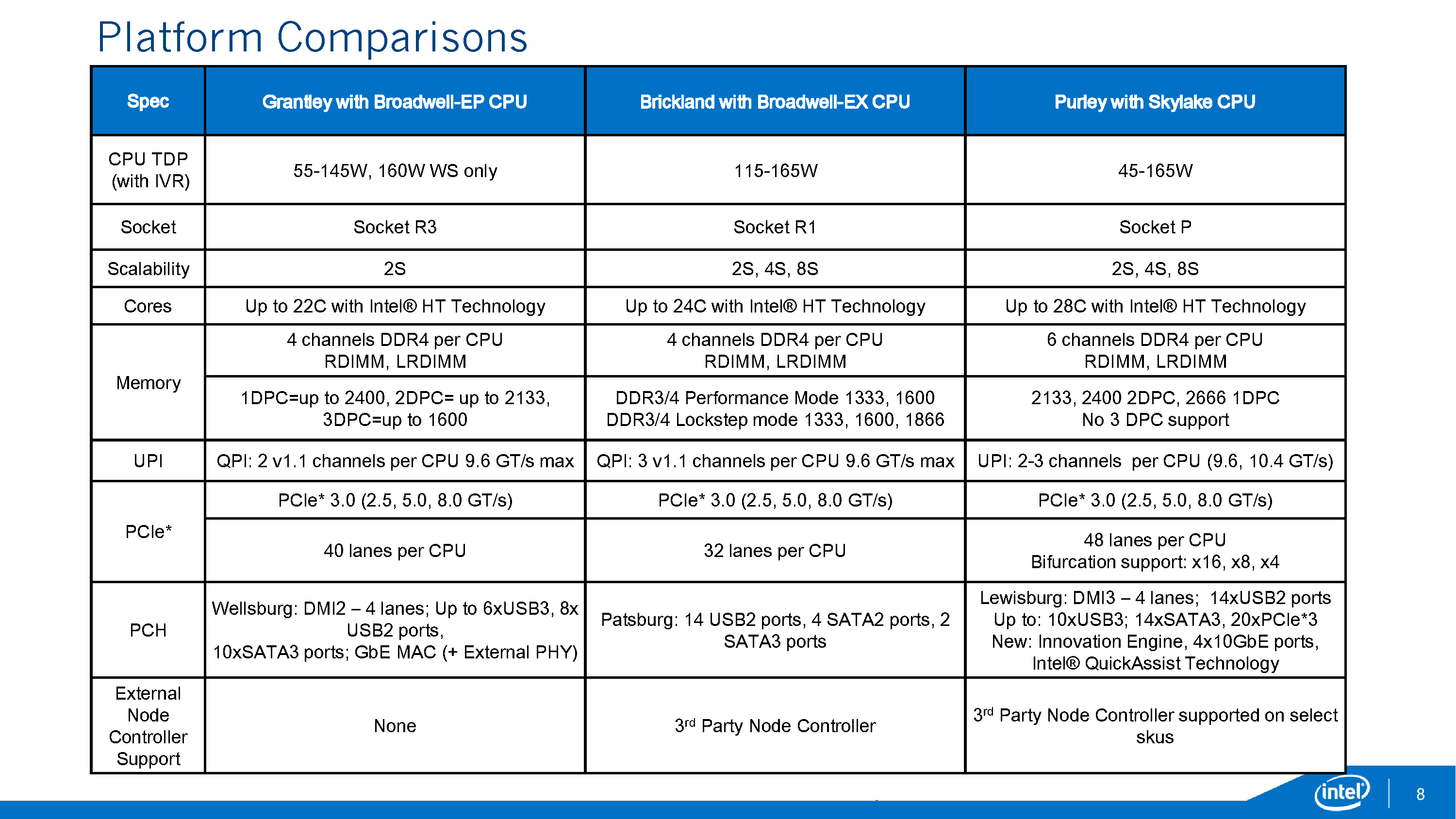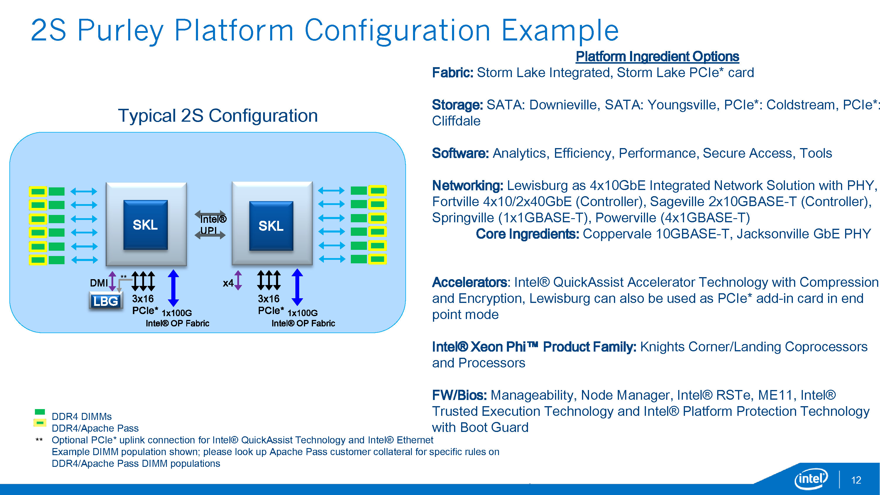 Il n'est bizarrement pas fait mention du PCIe Gen4, par contre on passera à 48 lignes PCIe par processeur ce qui permet d'avoir 3 ports x16. Il est question d'un nouveau chipset Lewisburg qui intégrera un lien DMI3 avec le CPU et permettra de gérer jusqu'au 10 USB 3, 14 SATA 3 ou 20 PCIe, une partie des lignes étant probablement partagées. 4 ports Ethernet 10 GbE sont également gérés. Cette plate-forme supportera en sus l'Intel OmniPath 100G qui permet de disposer de liens optiques pour interconnecter les puces au sein d'un supercalculateur.
