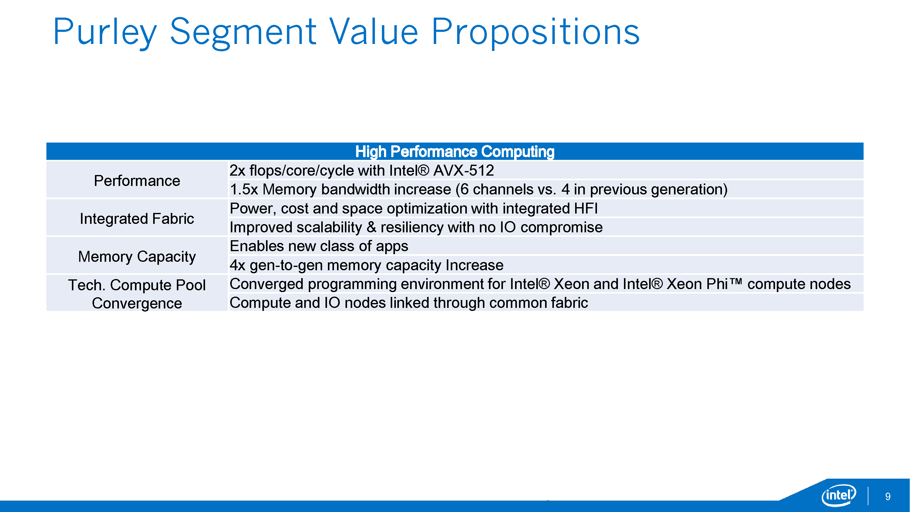 D'autres points sont plus flous, Intel met ainsi en avant une nouvelle architecture mémoire offrant à la fois une persistance de donnée, une vitesse 500 fois supérieure à la NAND, une capacité 4x supérieures ainsi qu'un coût inférieur à la DRAM. Intel met également en avant la possibilité de disposer d'accélérateurs spécifiques, tels que le QuickAssist pour le chiffrement et la décompression mais il est également question d'une association avec un FPGA (sous quelle forme ?) ainsi que de l'iGPU de Cannonlake. Nous aurons certainement des détails plus précis d'ici le lancement de Purley en 2017. Les futurs i7 haut de gamme seront pour leur part très probablement communs avec ceux de la plate-forme Basin Falls pour laquelle la présentation ne donne pas de détails.