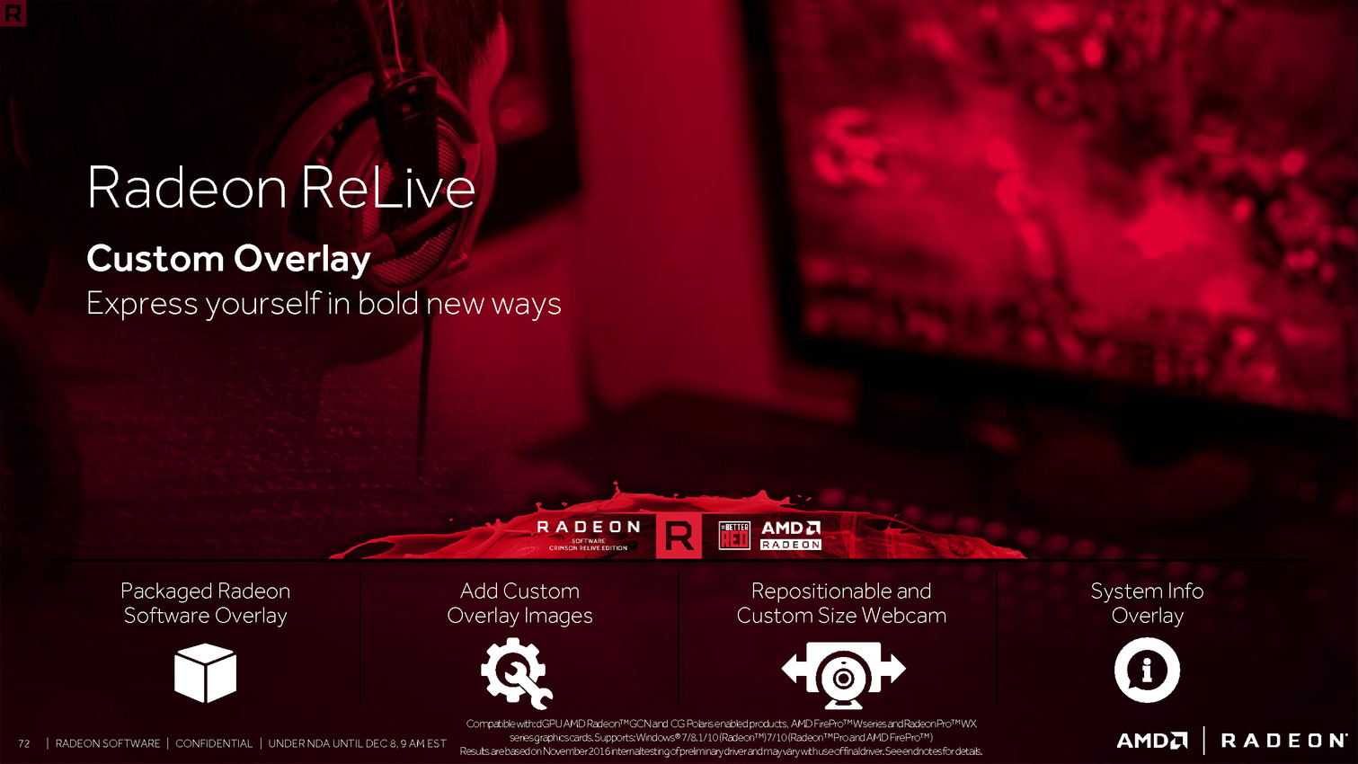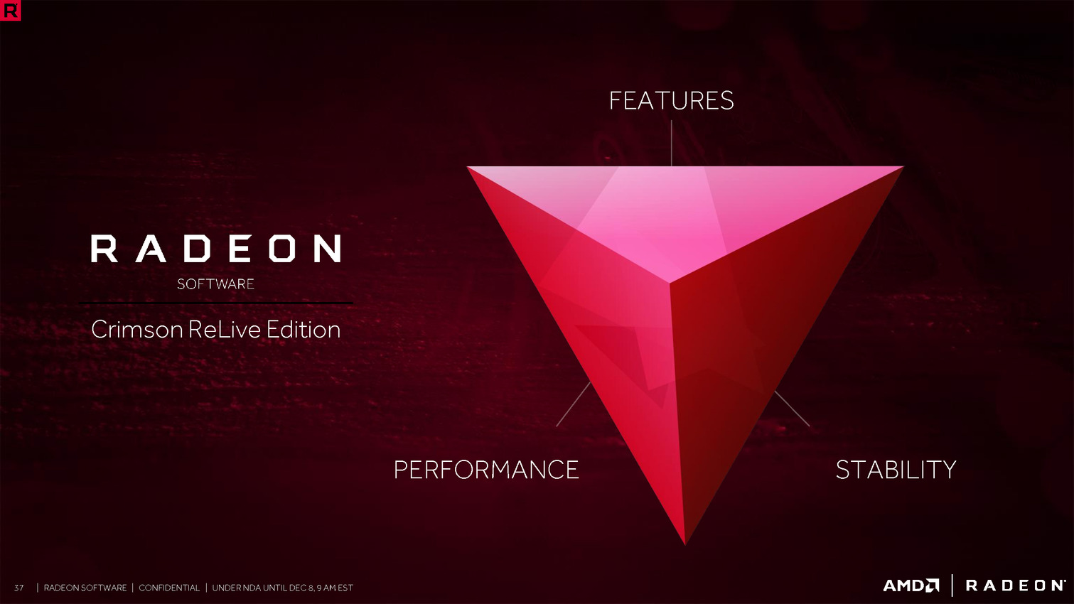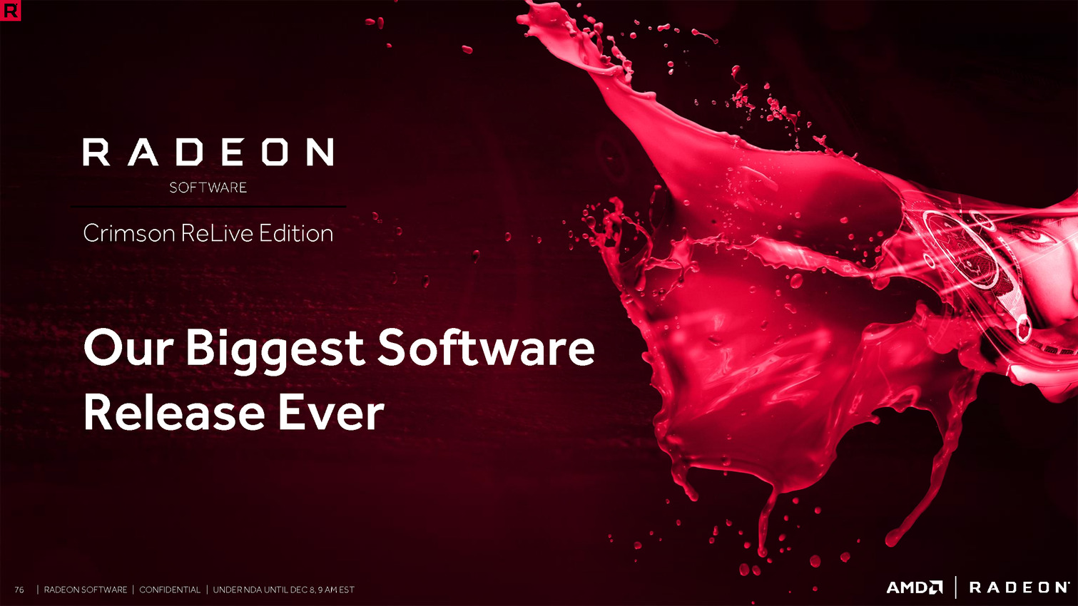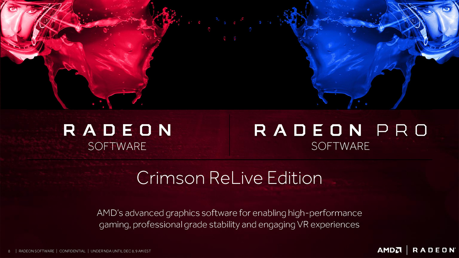 Comme en 2014 et en 2015, AMD profite de la fin de l'année pour proposer une évolution majeure de ses pilotes baptisée Radeon Software Crimson ReLive Edition en référence à l'une des nouvelles fonctionnalités phares dédiée au streaming en temps réel.
