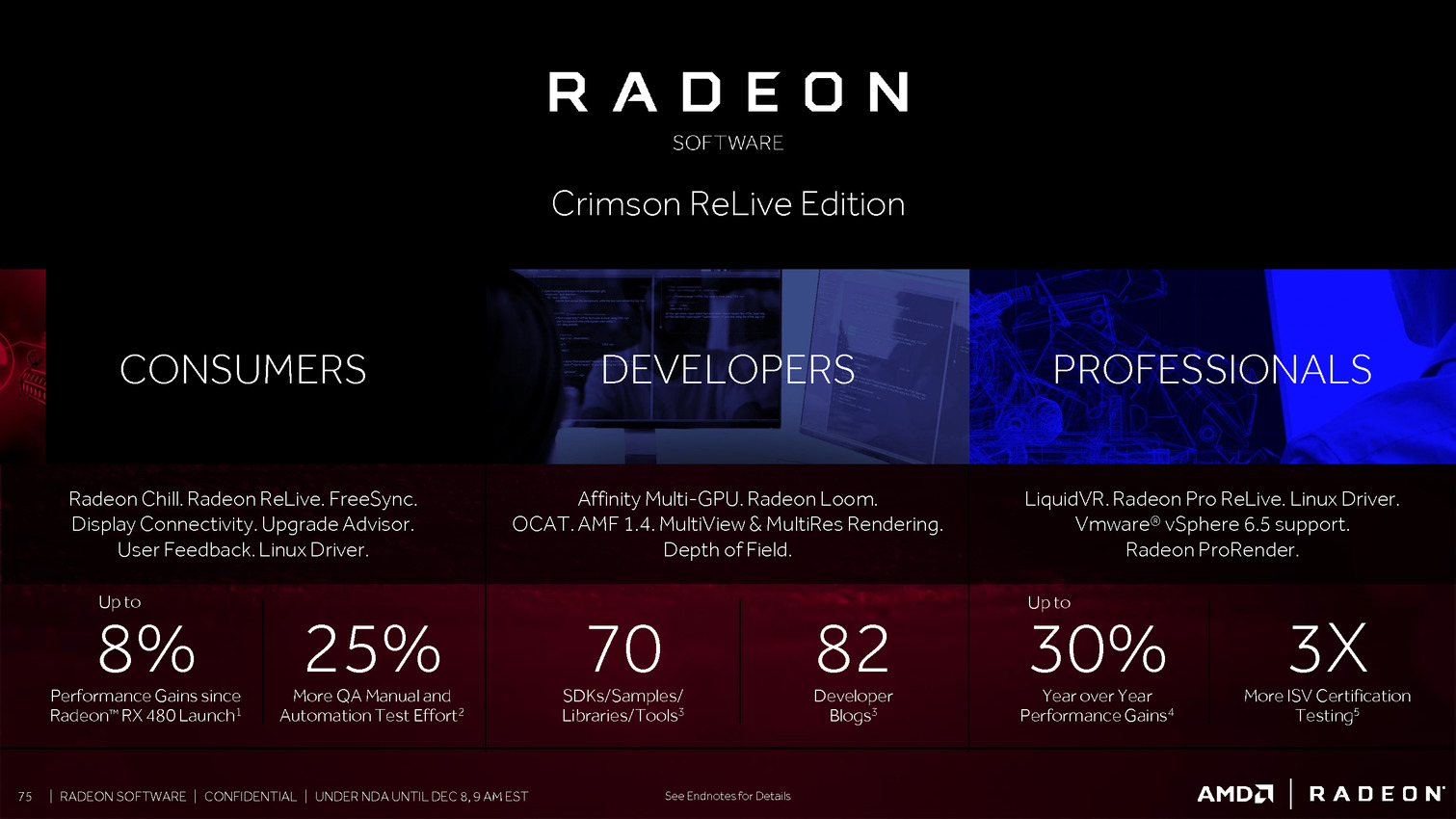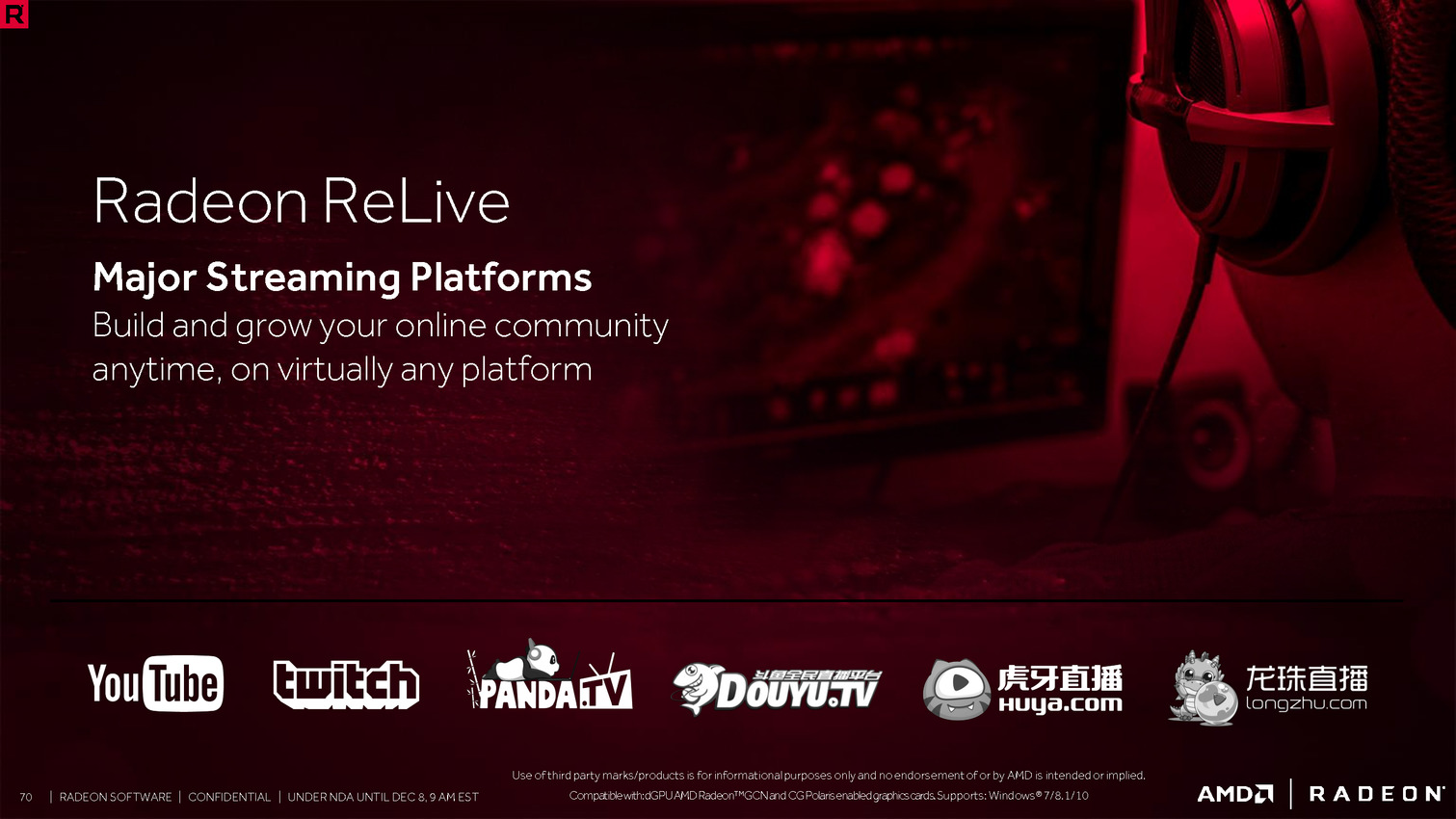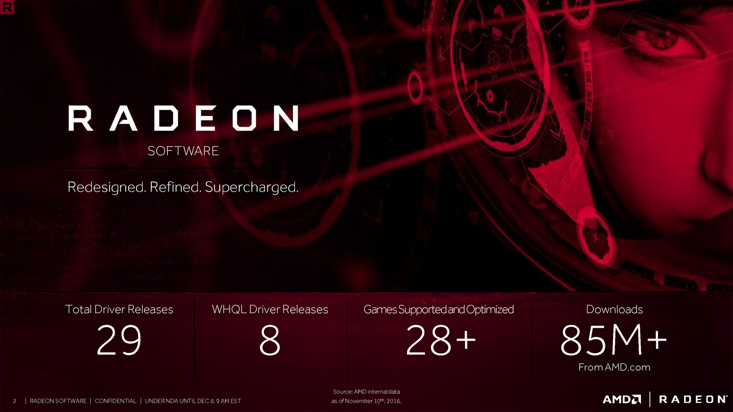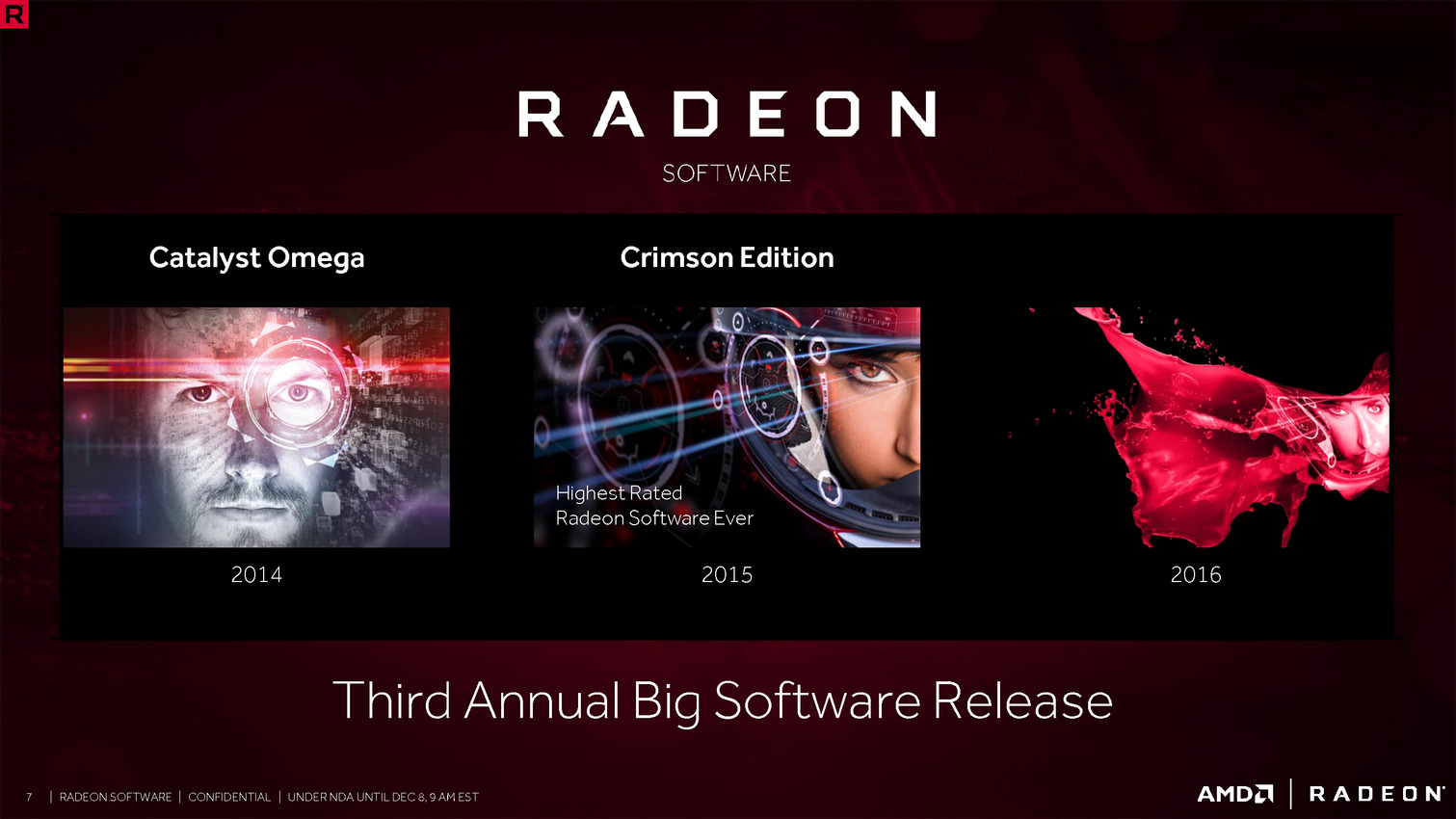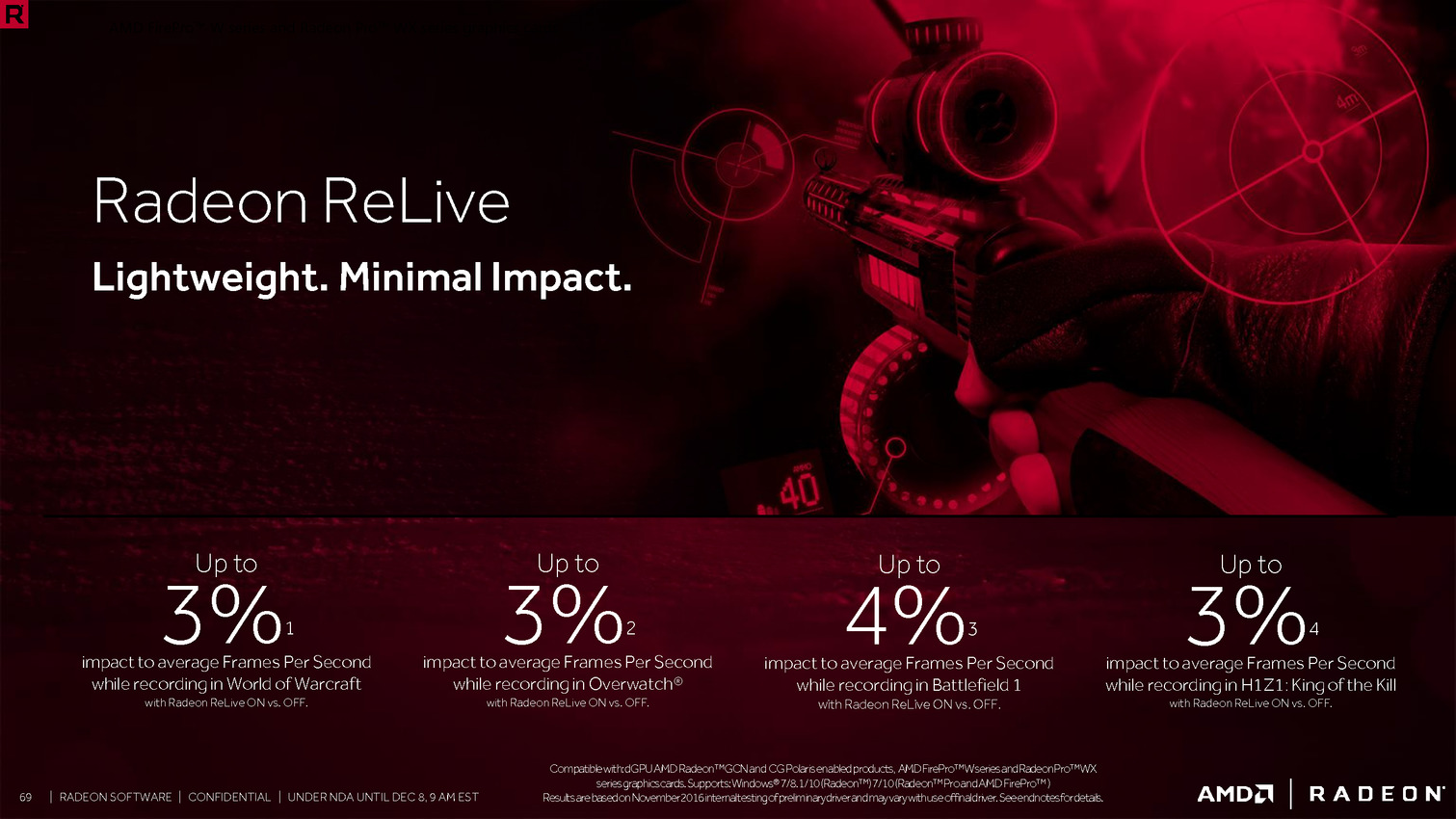 Comme en 2014 et en 2015, AMD profite de la fin de l'année pour proposer une évolution majeure de ses pilotes baptisée Radeon Software Crimson ReLive Edition en référence à l'une des nouvelles fonctionnalités phares dédiée au streaming en temps réel.