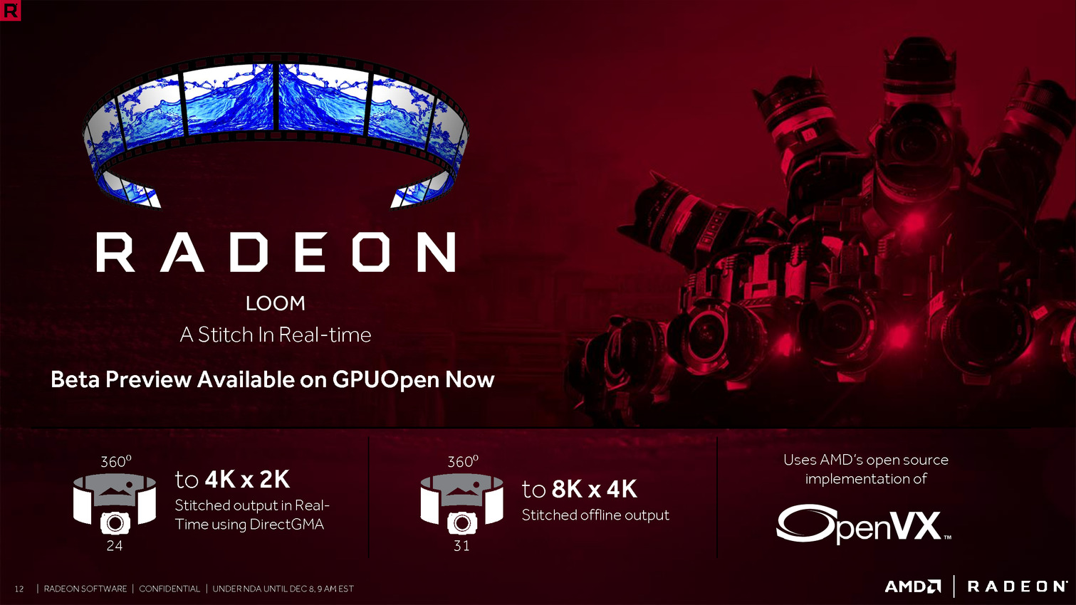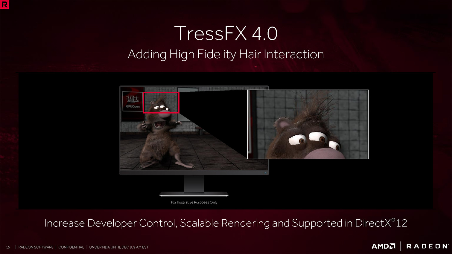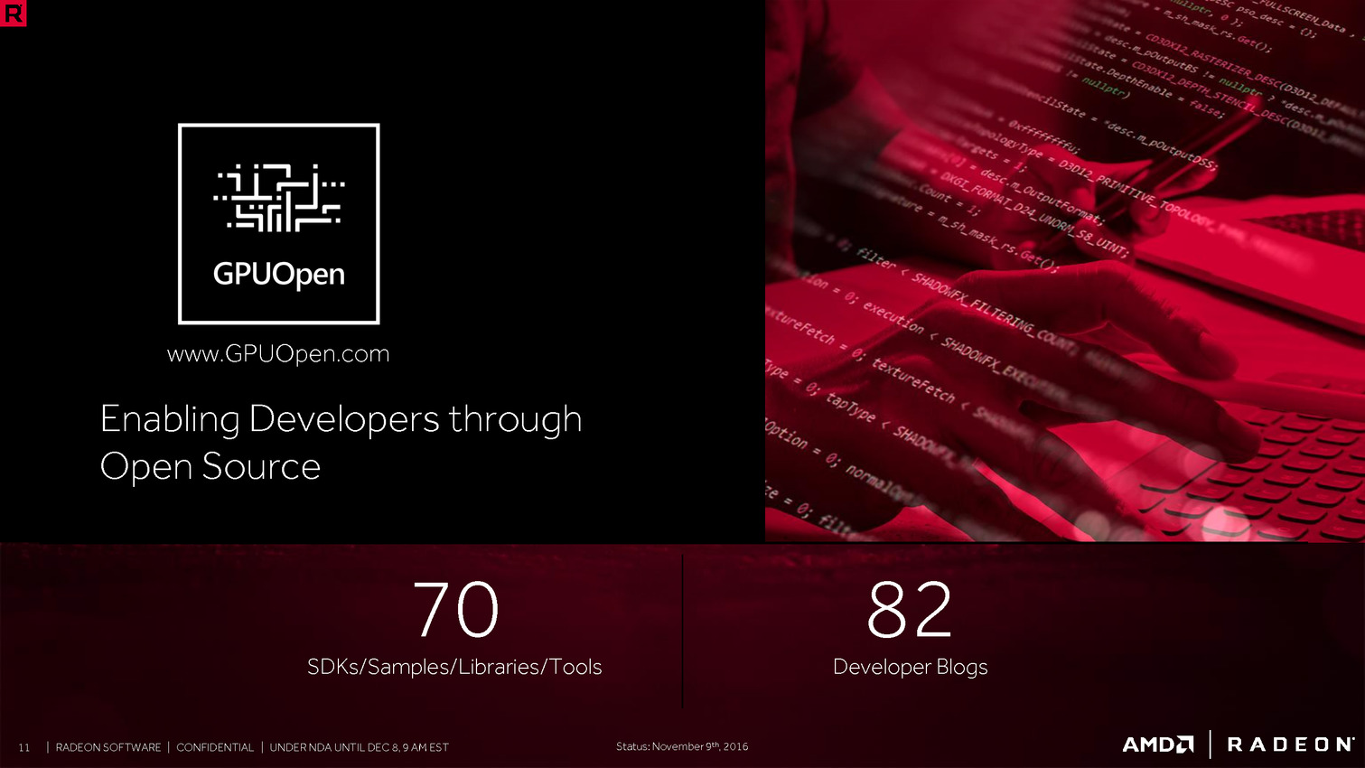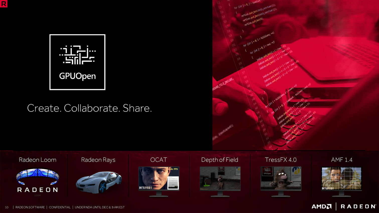 Enfin, AMD insiste sur la poursuite de ses initiatives auprès des développeurs à travers la plateforme GPUOpen. Parmi les additions récentes, il est question de Loom pour le traitement des vidéo à 360°, de contributions pour le développement d'un nouvel outil de mesure des performances (OCAT), d'un nouveau module de Depth of Field, de TressFX 4.0, de l'ajout du H.265 à l'Advanced Media Frramework et de la finalisation de plus de composantes de LiquidVR telles que les rendus MultiView et Multi-Res.