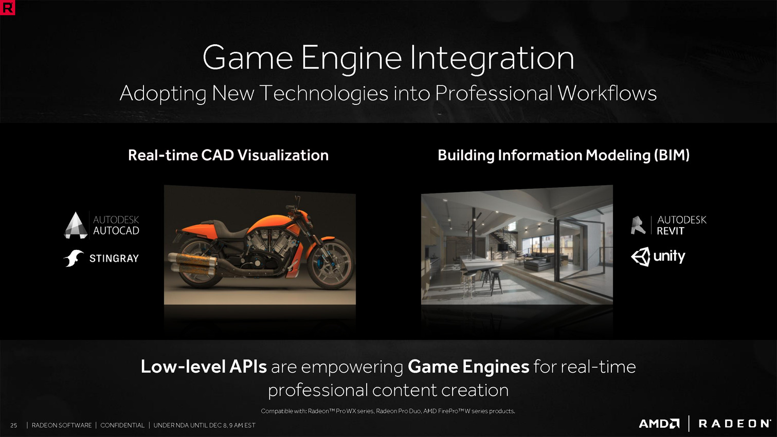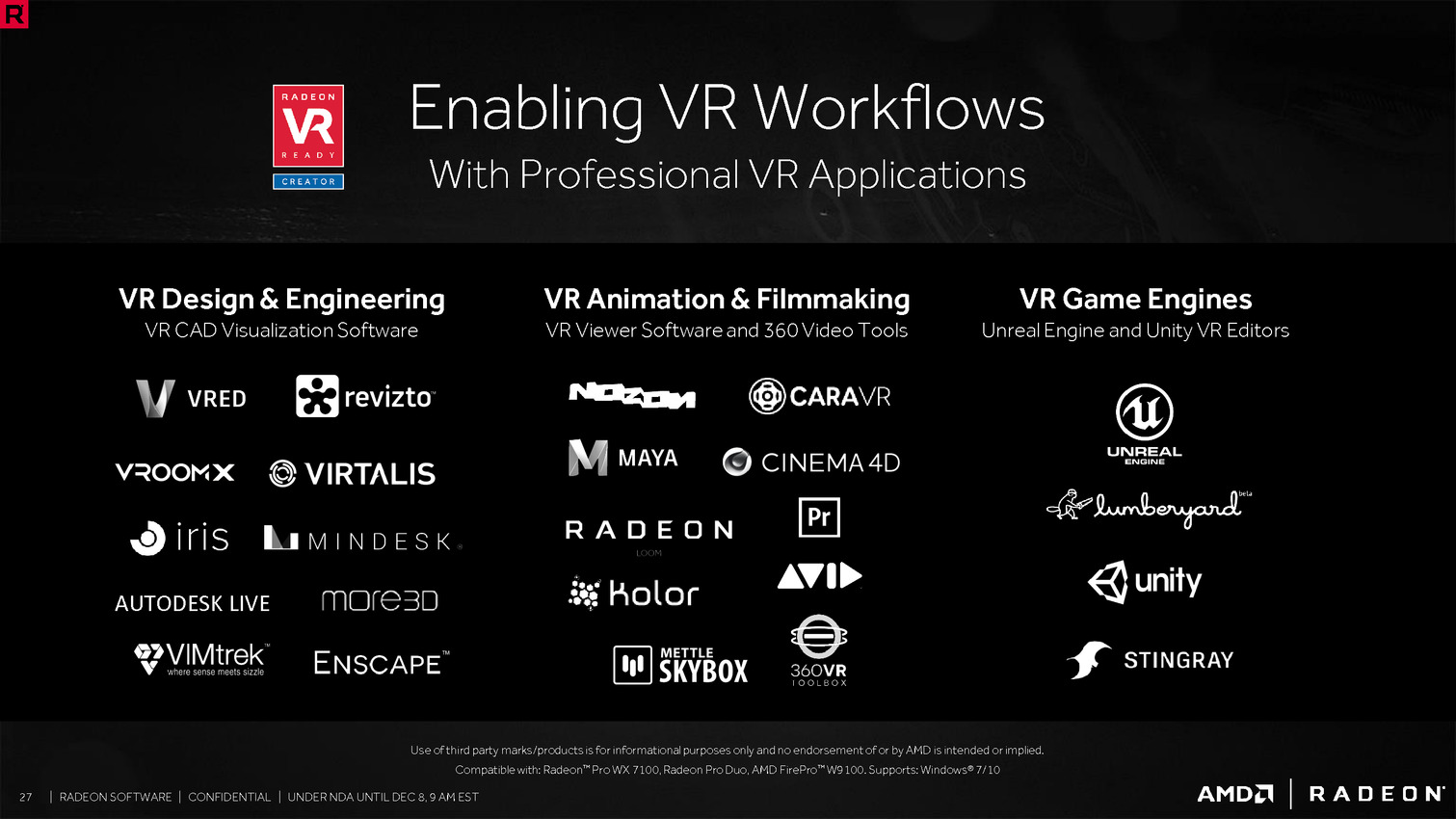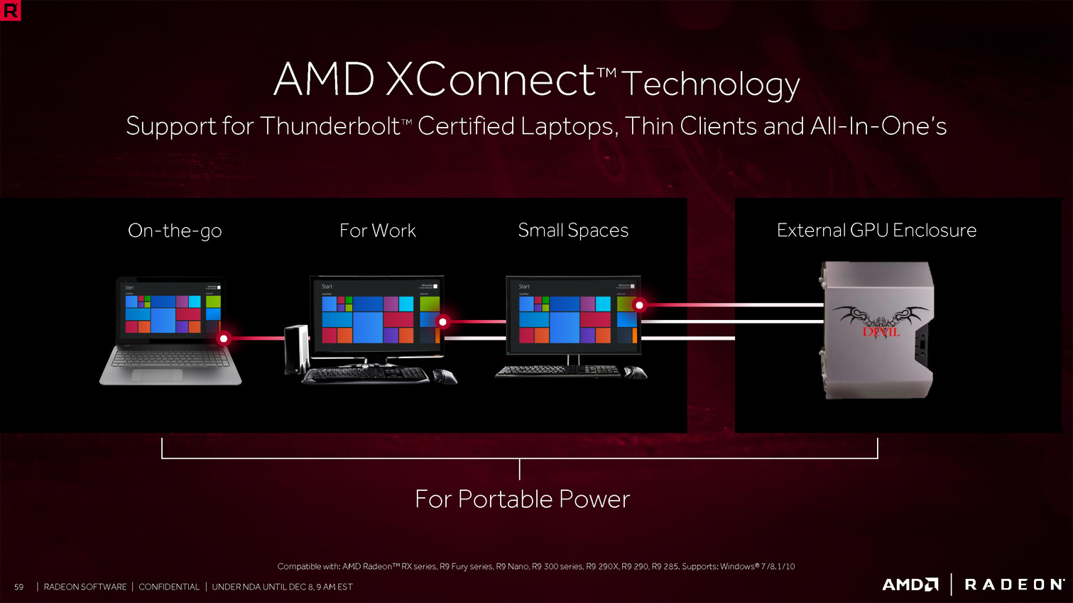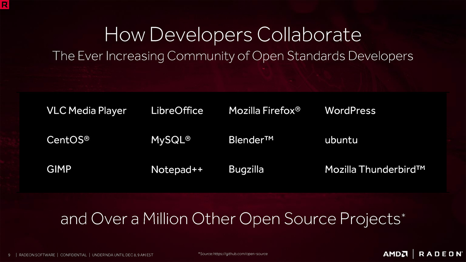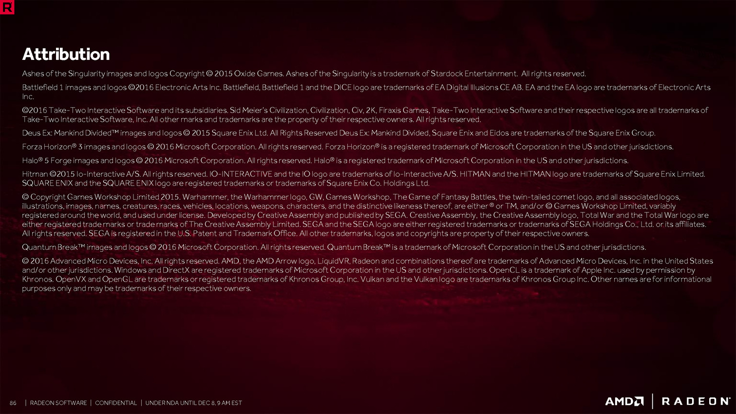 Enfin, AMD insiste sur la poursuite de ses initiatives auprès des développeurs à travers la plateforme GPUOpen. Parmi les additions récentes, il est question de Loom pour le traitement des vidéo à 360°, de contributions pour le développement d'un nouvel outil de mesure des performances (OCAT), d'un nouveau module de Depth of Field, de TressFX 4.0, de l'ajout du H.265 à l'Advanced Media Frramework et de la finalisation de plus de composantes de LiquidVR telles que les rendus MultiView et Multi-Res.
