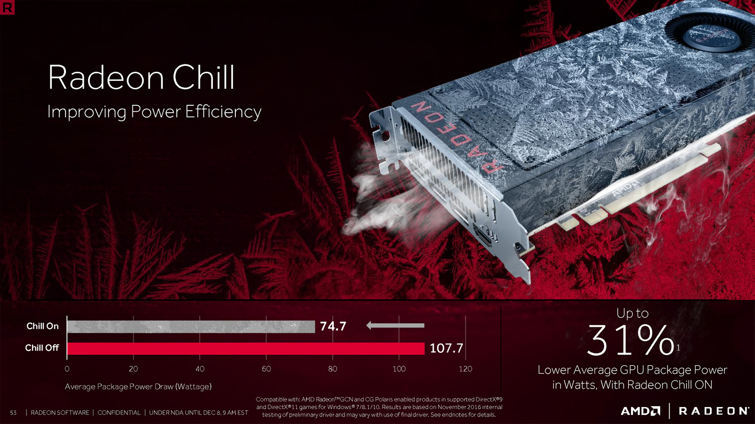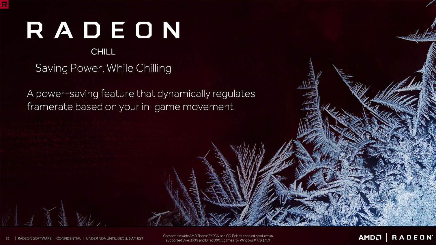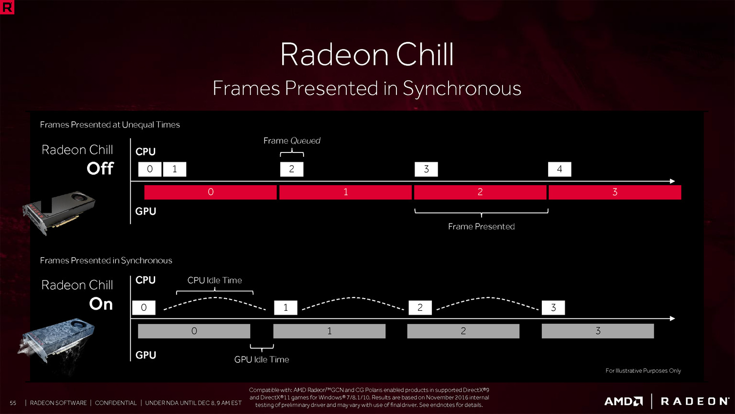 AMD indique que dans la plupart des cas le fonctionnement de Chill est imperceptible pour l'utiliser alors que les bénéfices sont bel et bien là avec moins de chauffe. Par ailleurs, puisque le but n'est plus de maximiser les performances, un compromis différent peut être mise en place au niveau de la file d'images en attente du rendu, de quoi améliorer dans certains cas le temps de réponse entre le click et l'affichage. Tout comme le multi-GPU, Chill est activé à travers un système de profils, pour les jeux pour lesquels il se comporte bien. Seuls des moteurs DirectX 9 et DirectX 11 sont actuellement supportés.