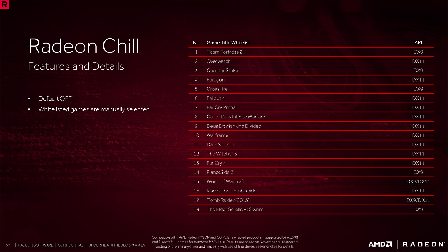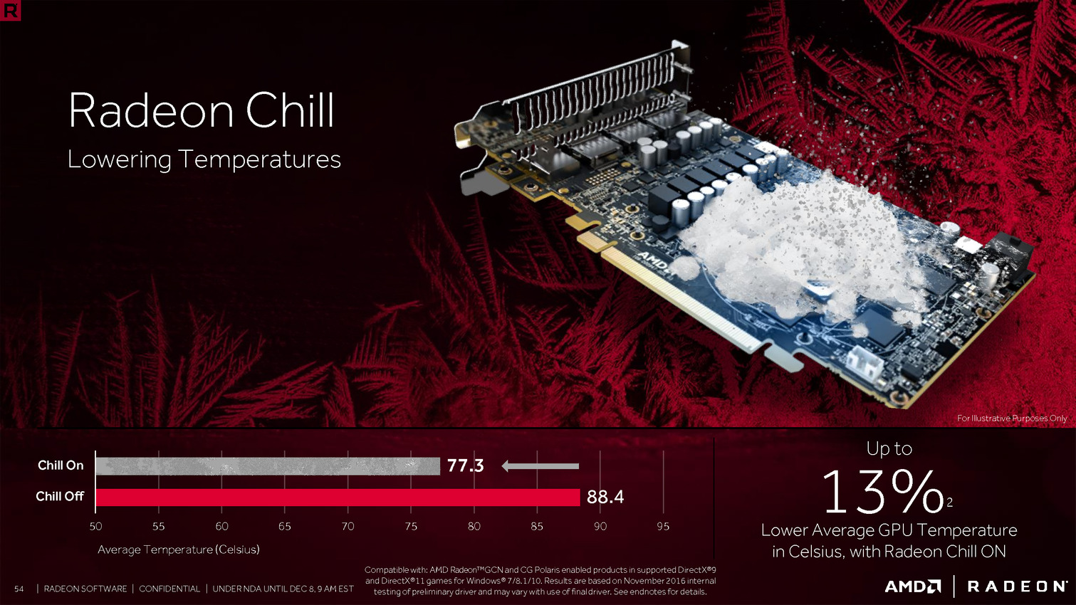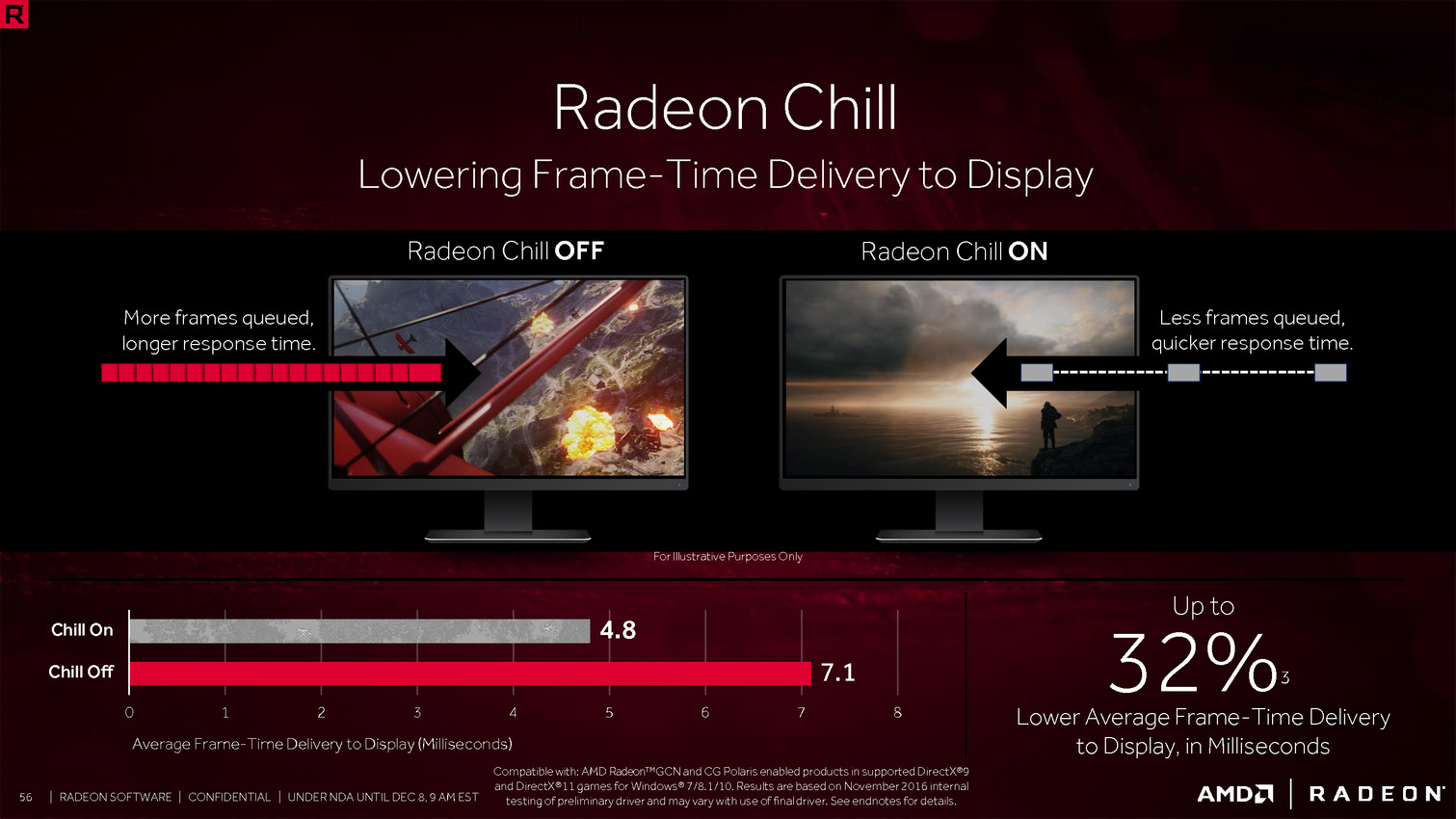 AMD indique que dans la plupart des cas le fonctionnement de Chill est imperceptible pour l'utiliser alors que les bénéfices sont bel et bien là avec moins de chauffe. Par ailleurs, puisque le but n'est plus de maximiser les performances, un compromis différent peut être mise en place au niveau de la file d'images en attente du rendu, de quoi améliorer dans certains cas le temps de réponse entre le click et l'affichage. Tout comme le multi-GPU, Chill est activé à travers un système de profils, pour les jeux pour lesquels il se comporte bien. Seuls des moteurs DirectX 9 et DirectX 11 sont actuellement supportés.