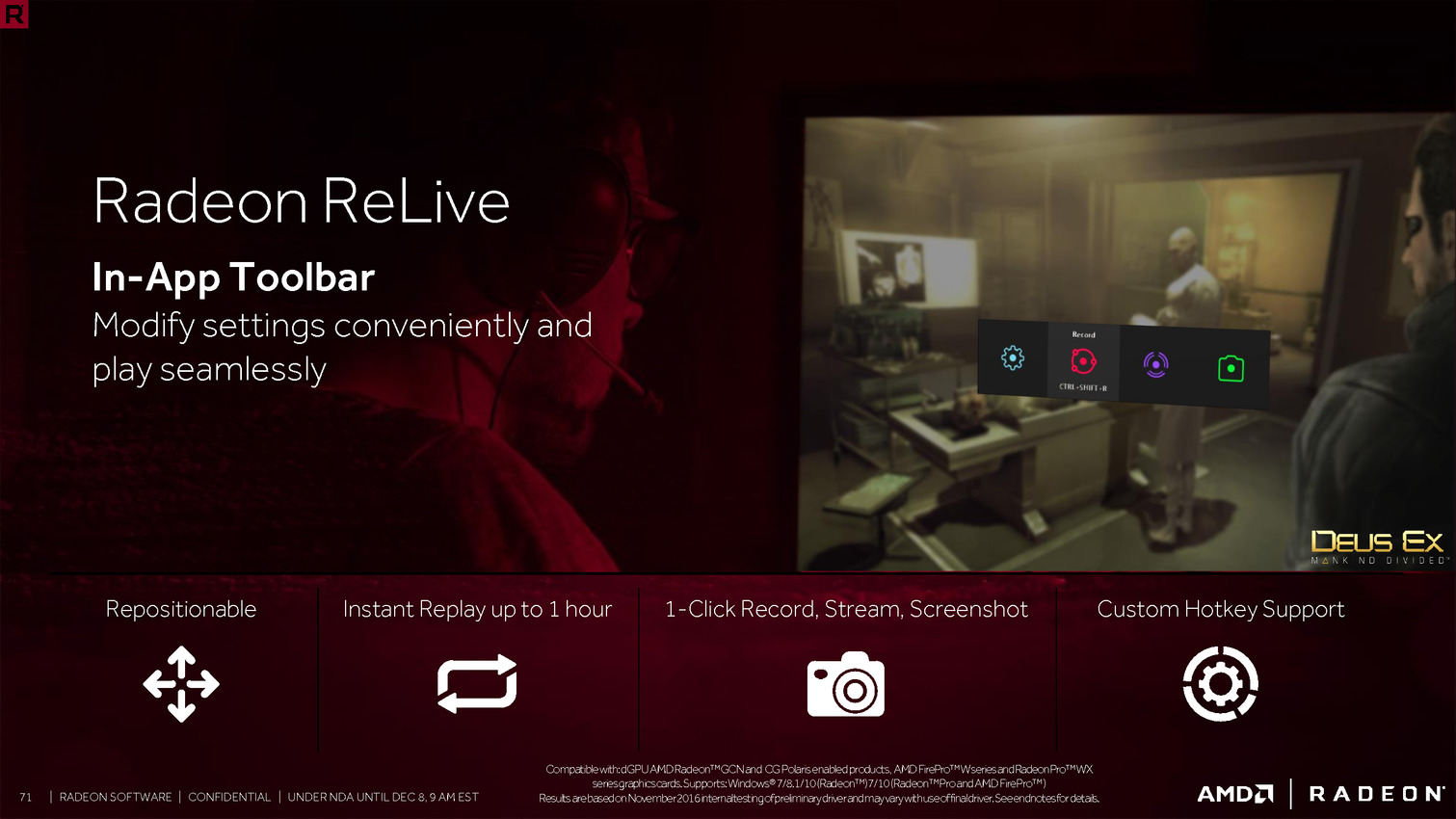 La plus grosse nouveauté pour AMD et la fonctionnalité ReLive qui permet l'enregistrement et le streaming en temps réel vers Twitch ou Youtube de ce qui est affiché par la carte graphique. C'est l'équivalent du ShadowPlay de Nvidia qui était jusqu'il y a peu proposé par AMD à travers une application externe plutôt peu appréciée : Gaming Evolved (basée sur Raptr).