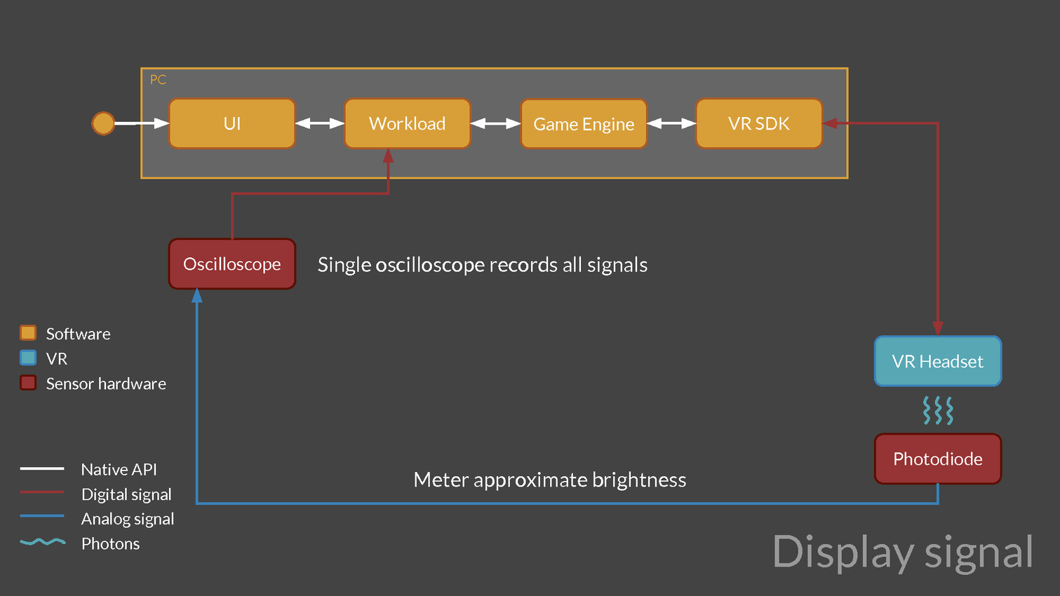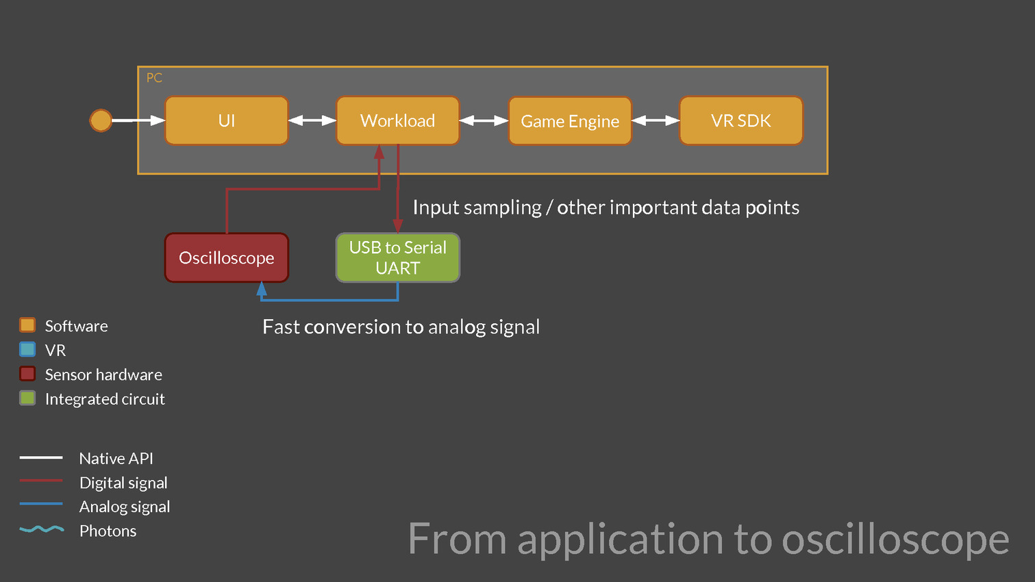 Une version preview de VRMark est proposée depuis quelques temps déjà, mais la version finale va aller beaucoup plus loin, c'est d'ailleurs déjà en partie le cas pour les versions beta que nous évaluons et qui sont fournies avec un équipement externe chargé d'observer la latence. Cet équipement est constitué d'un oscilloscope et d'une photodiode pilotés par VRMark pour mesurer la latence de l'application au photon, que ce soit pour un casque de réalité virtuelle (HMD - Head Mounted Display) ou pour un moniteur classique.