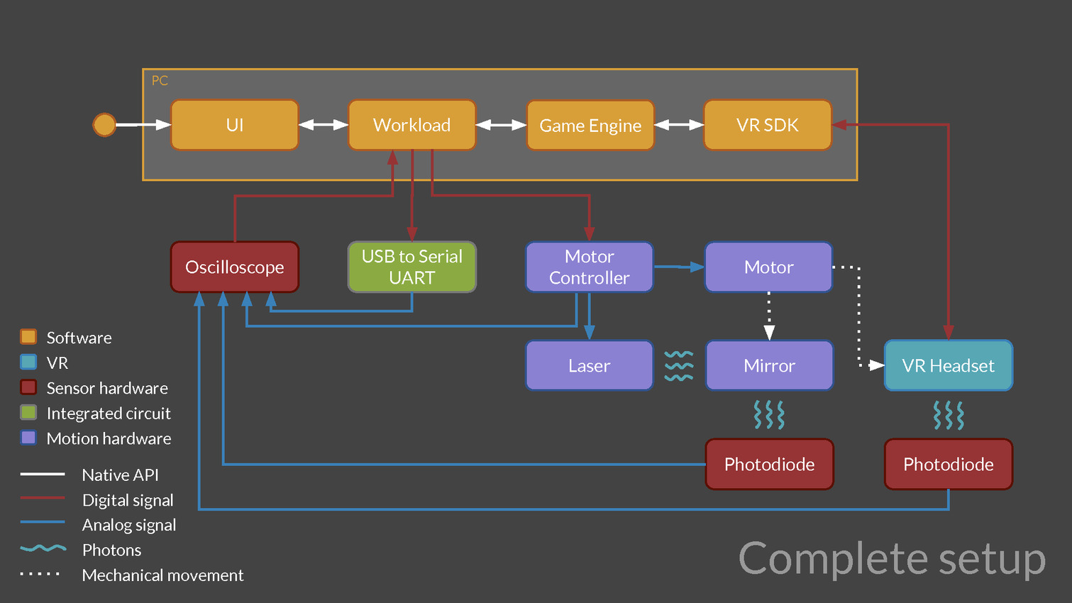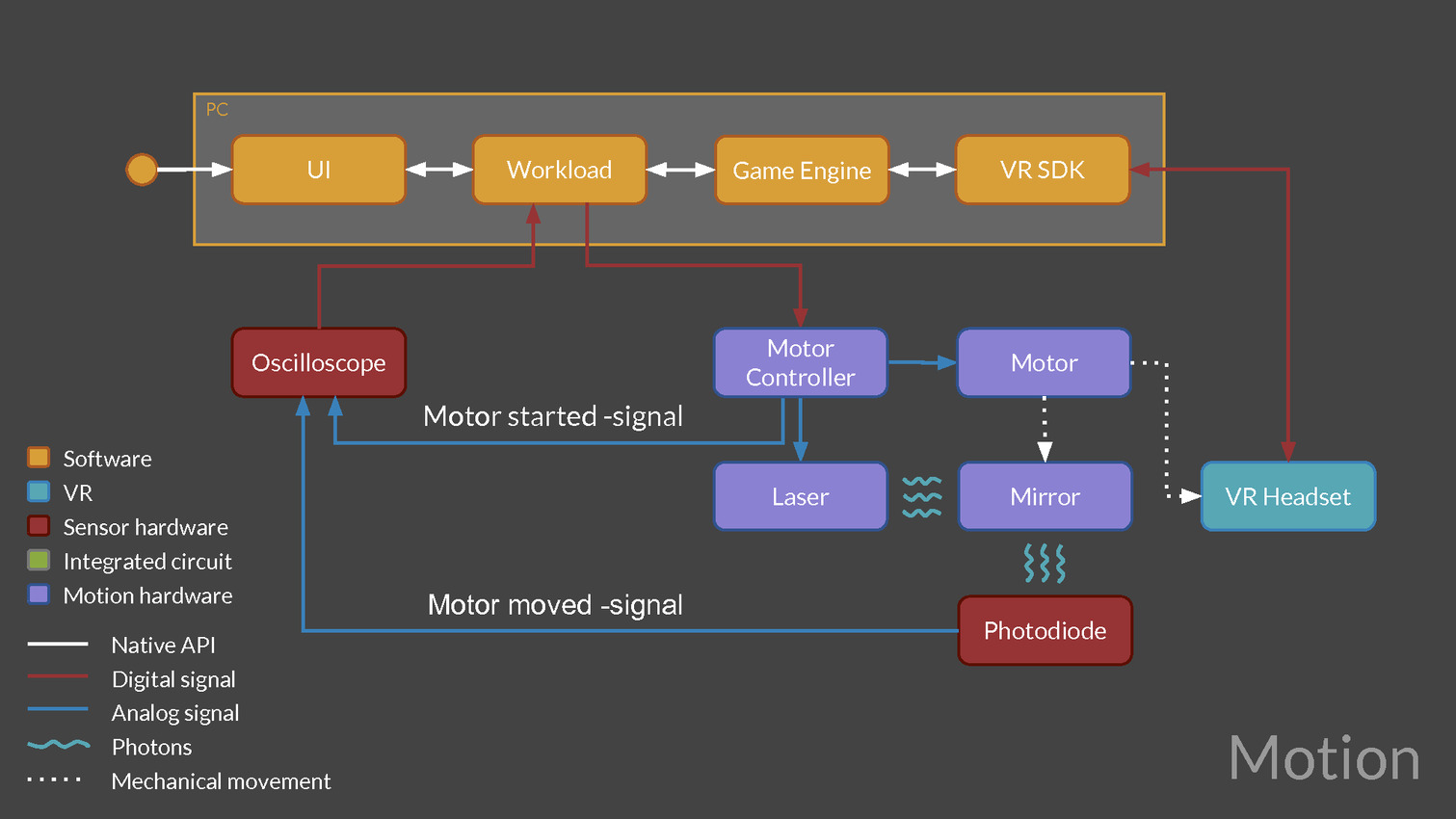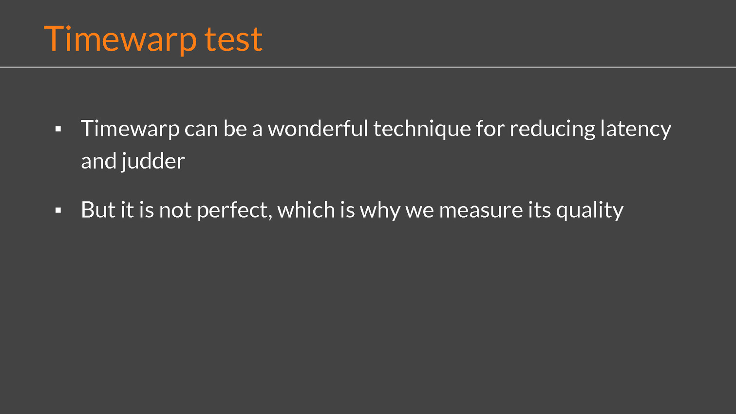Futuremark développe également un équipement supplémentaire équipé d'un moteur qui va faire bouger les HMD de manière contrôlée pour aller plus loin et mesurer la latence de la prise en compte du mouvement de la tête. D'autres tests sont prévus par exemple pour mesurer la précision du système de positionnement ou encore la qualité du time warping, cette technique qui consiste à reprojeter l'image rendue pour simuler un angle de vue légèrement différent. Abuser du time warping peut réduire la latence et améliorer les performances mais conduire à des défauts visuels importants.