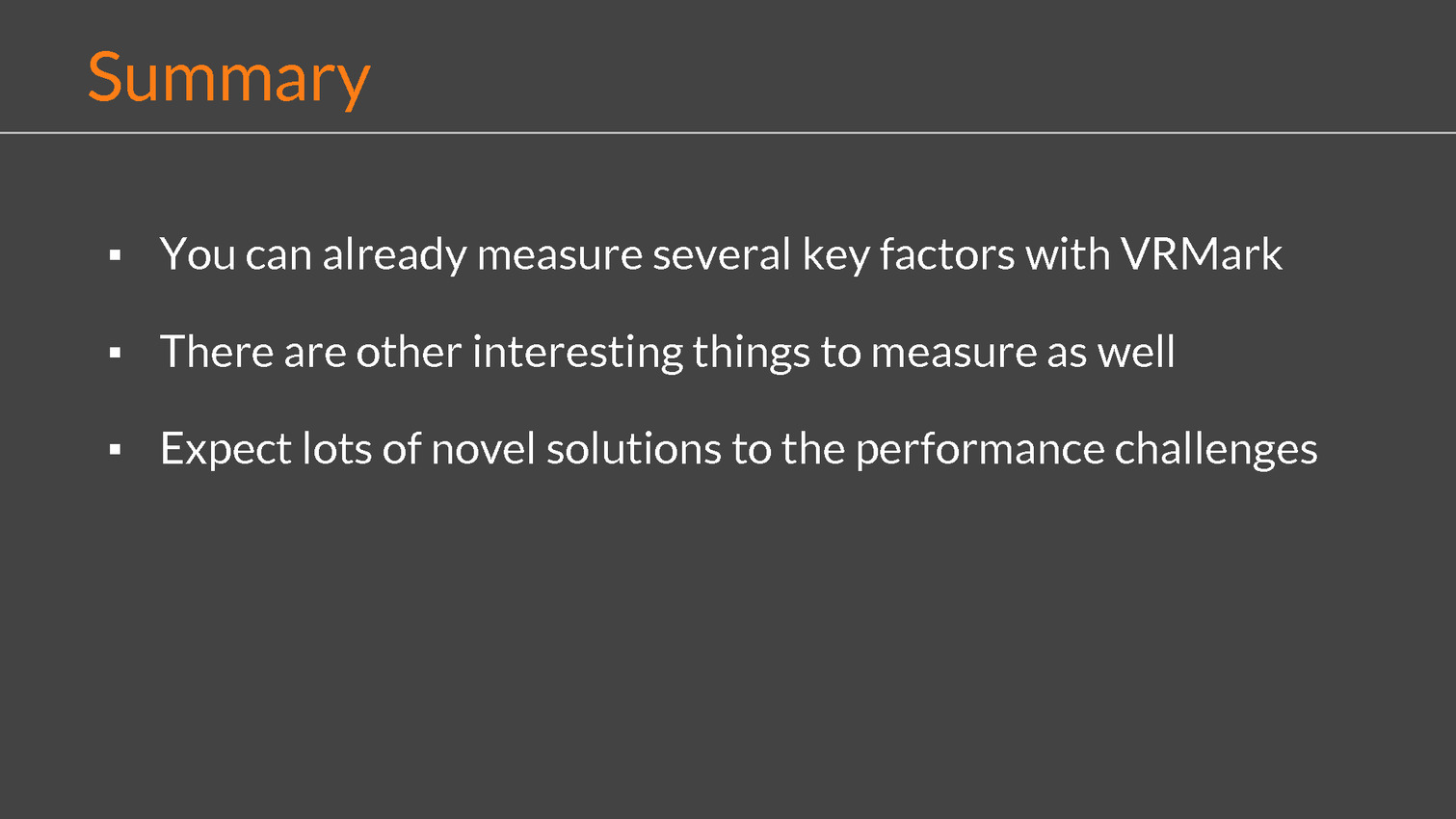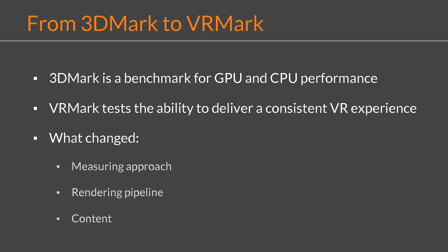 Tout comme Basemark, Futuremark travaille ainsi depuis quelques temps à la mise au point d'un benchmark dédié à la VR en essayant d'en prendre en compte un maximum d'éléments. Contrairement à la 3D temps réel classique, la VR n'a pas simplement besoin d'un certain niveau de performances, mais a également des exigences en termes de régularité et de latence. Des aspects qui en fait sont importants pour tout type d'affichage, même si dans une moindre mesure, mais c'est l'arrivée de la VR et du marché potentiellement énorme qu'elle représente qui pousse Futuremark et Basemark à aller plus loin que précédemment.