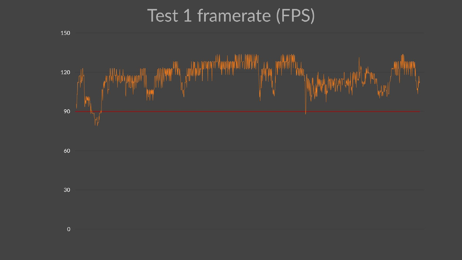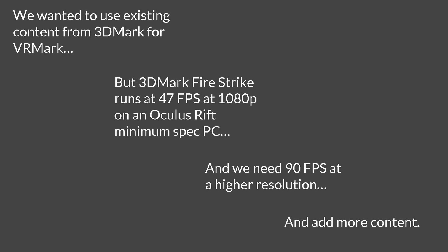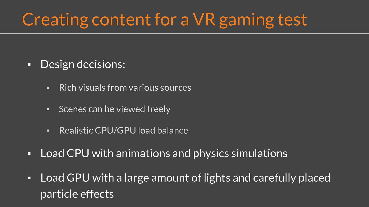 La modification principale concerne cependant le niveau de performances visé. Traditionnellement un 3DMark va chercher à pousser les cartes graphiques dans leurs derniers retranchements quitte à faire appel à des effets graphiques au coût disproportionné. Pour VRMark le but est d'obtenir une expérience réaliste. Deux niveaux de qualité sont proposés. Le premier cherche à obtenir au moins 90 fps en permanence sur les systèmes recommandés par Oculus et HTC (GTX 970 ou R9 290, alors que le second augmente quelque peu la charge et a plutôt besoin d'une GTX 980 Ti pour maintenir les 90 fps. Pour atteindre ce niveau de performances avec un contenu relativement riche, Futuremark a simplifié la géométrie ou encore réduit le nombre de particules. Deux aspects qui permettent des gains conséquents sans trop nuire au résultat final.