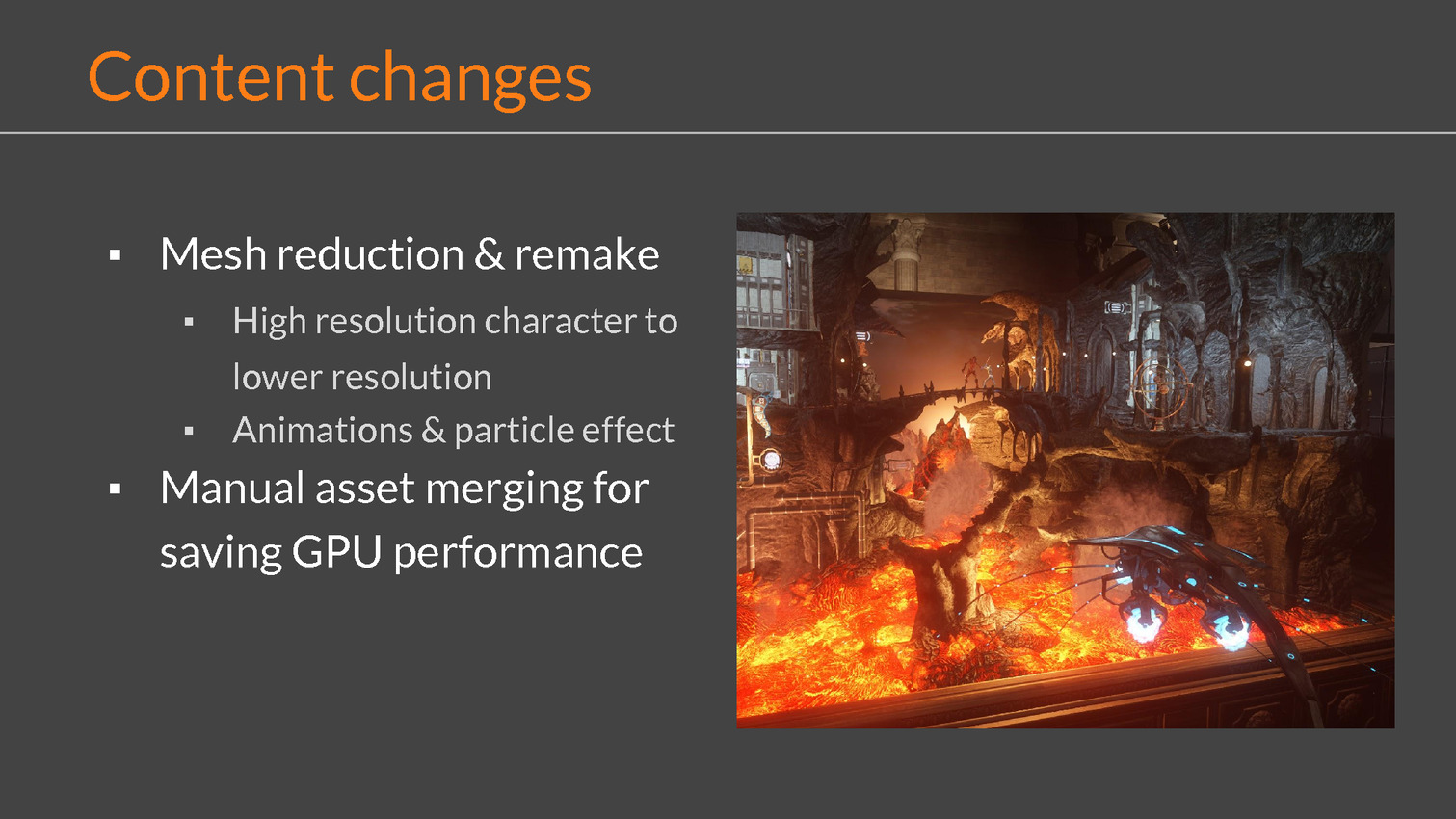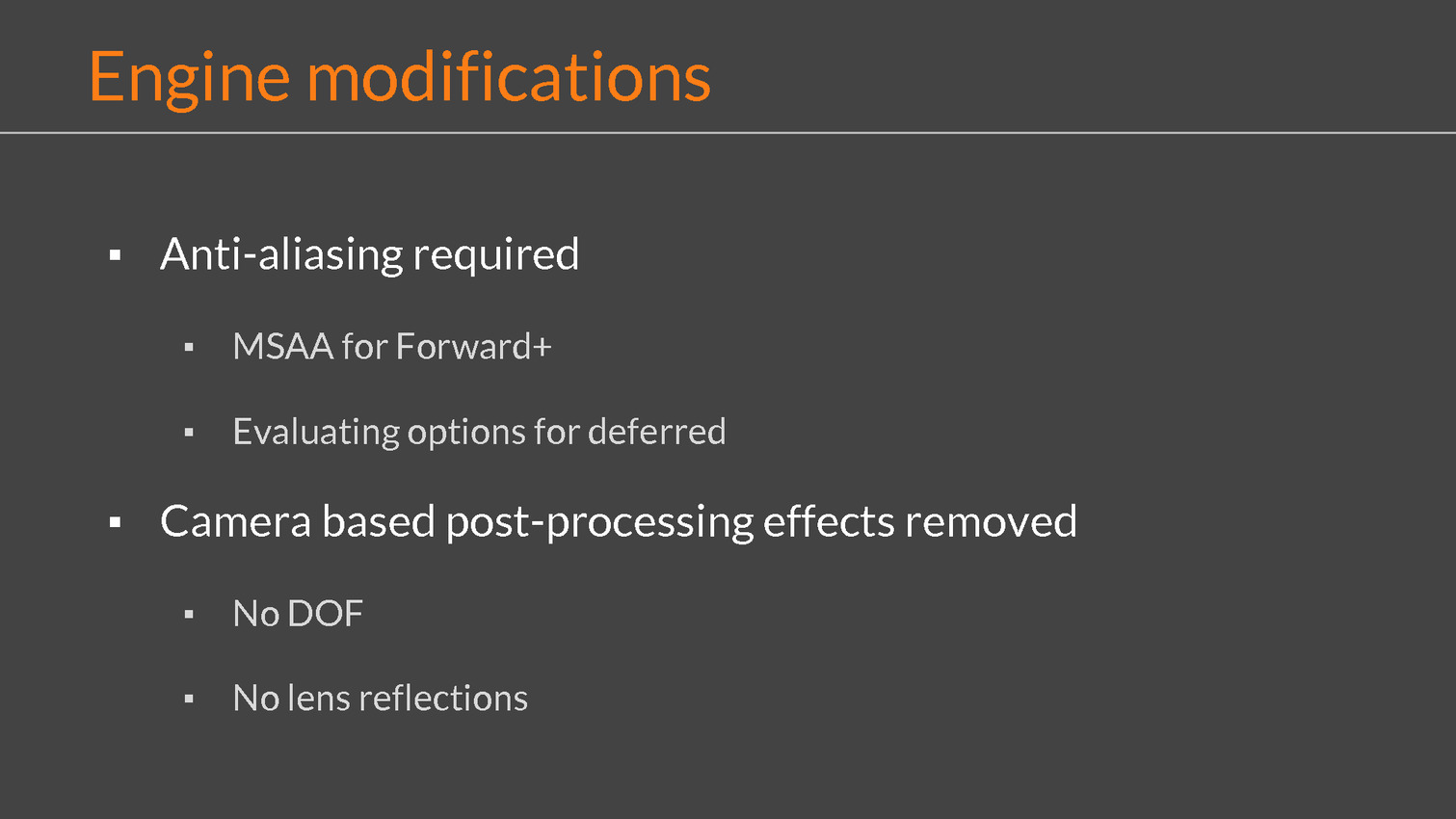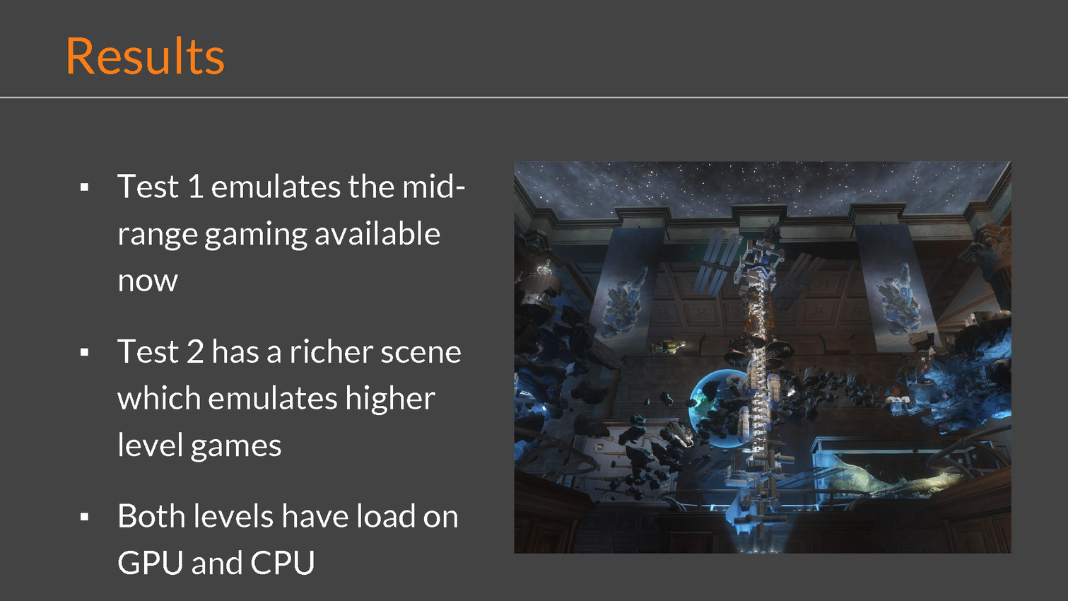 La modification principale concerne cependant le niveau de performances visé. Traditionnellement un 3DMark va chercher à pousser les cartes graphiques dans leurs derniers retranchements quitte à faire appel à des effets graphiques au coût disproportionné. Pour VRMark le but est d'obtenir une expérience réaliste. Deux niveaux de qualité sont proposés. Le premier cherche à obtenir au moins 90 fps en permanence sur les systèmes recommandés par Oculus et HTC (GTX 970 ou R9 290, alors que le second augmente quelque peu la charge et a plutôt besoin d'une GTX 980 Ti pour maintenir les 90 fps. Pour atteindre ce niveau de performances avec un contenu relativement riche, Futuremark a simplifié la géométrie ou encore réduit le nombre de particules. Deux aspects qui permettent des gains conséquents sans trop nuire au résultat final.