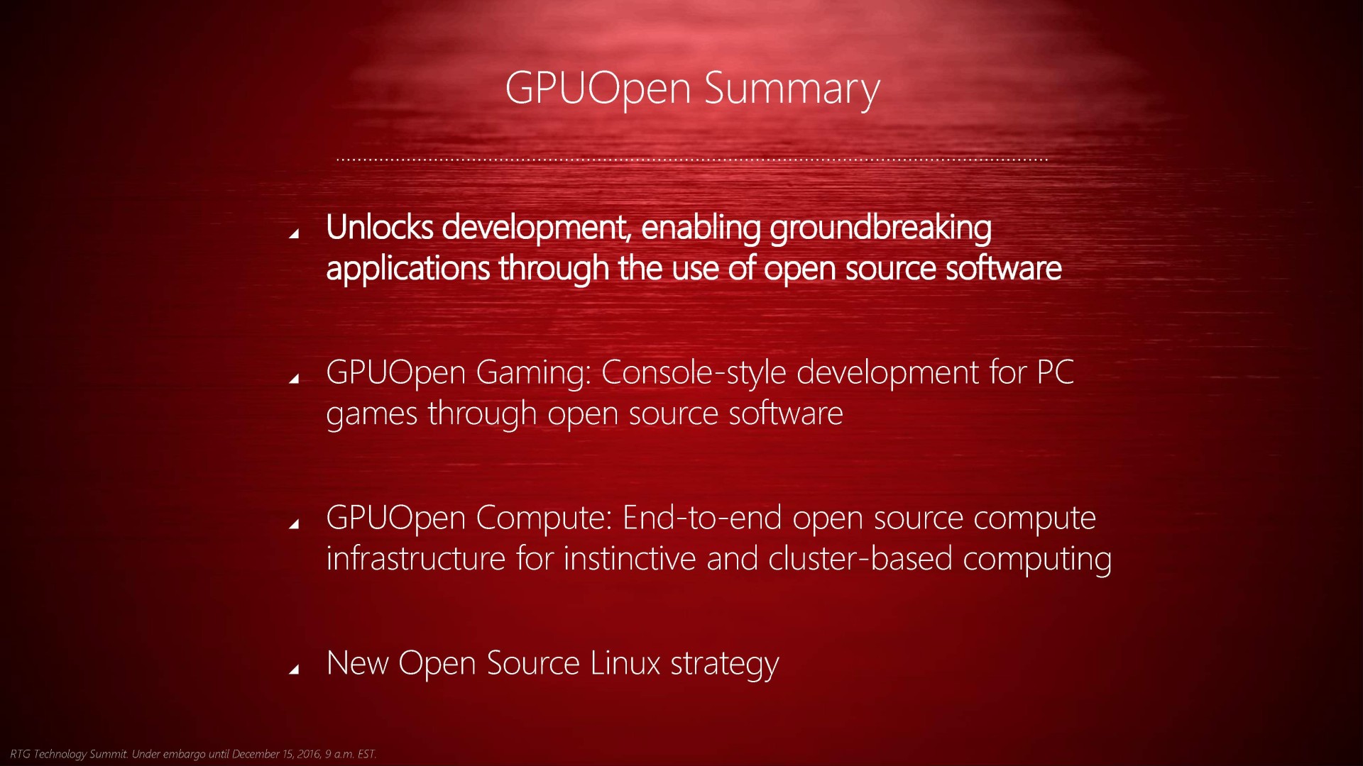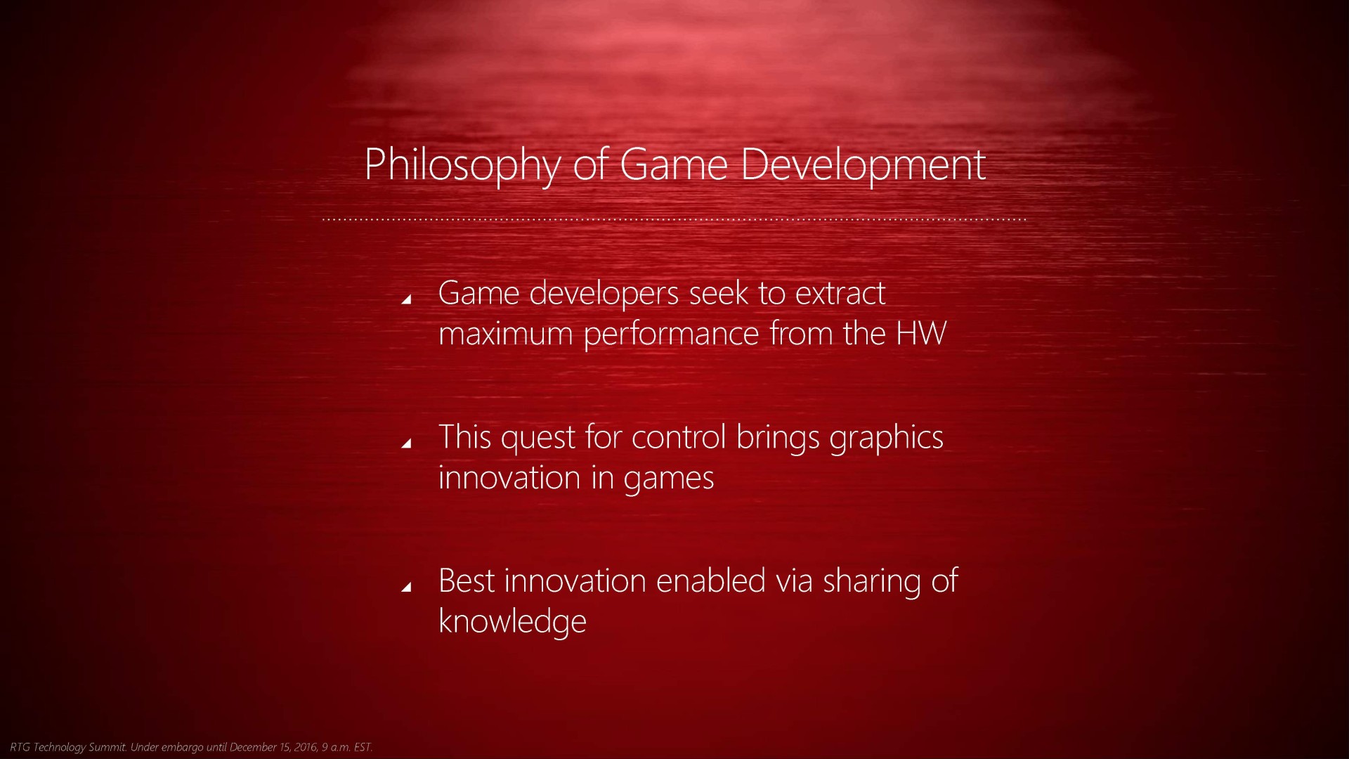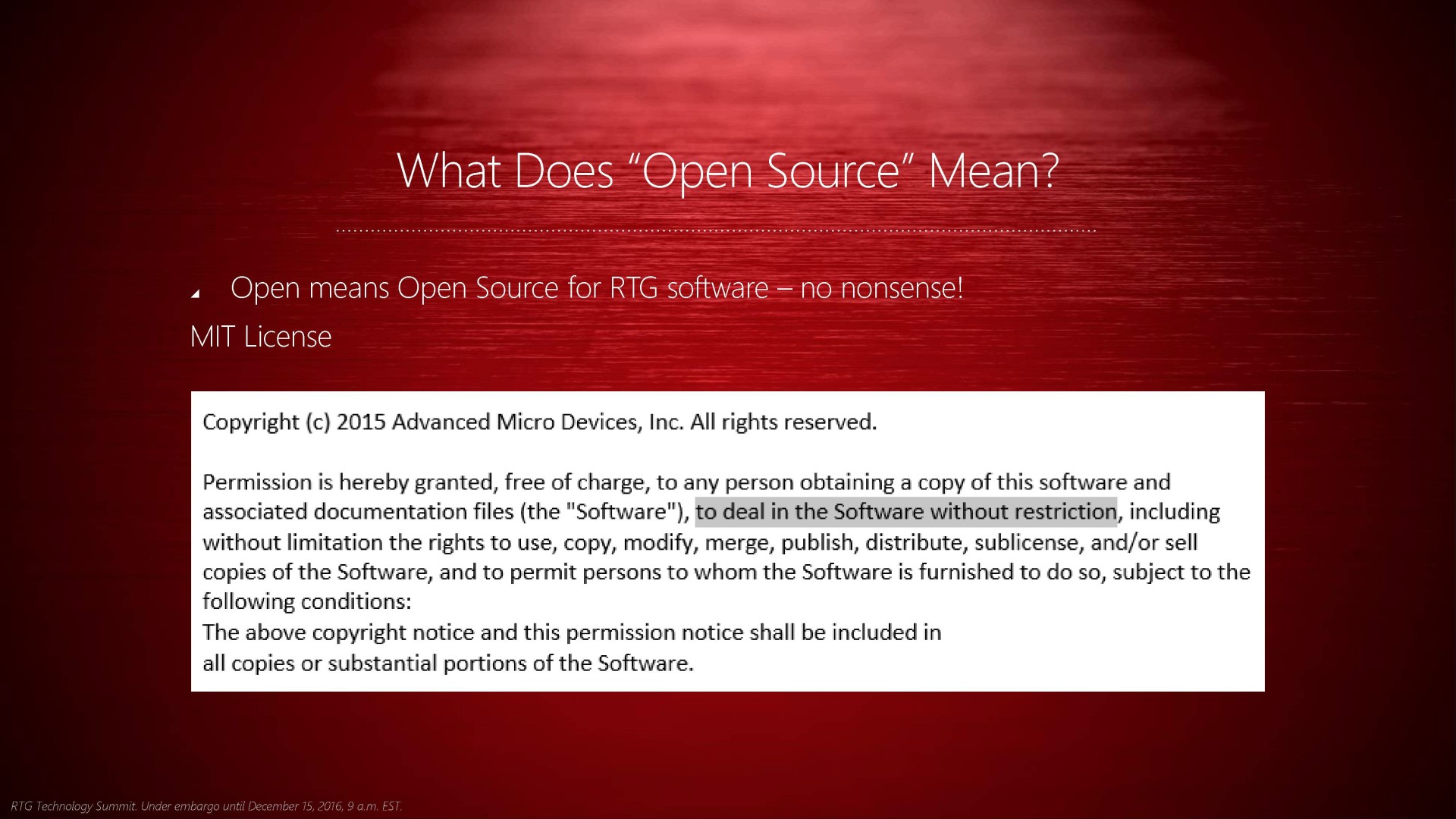 A la base de GPUOpen se trouve une philosophie relativement simple : les meilleures innovations découlent du partage des connaissances. L'évolution du rendu graphique dans les jeux est progressive et se fait par petites améliorations successives apportées par différents développeurs. AMD entend donc faire en sorte que sa contribution ne puisse pas entraver cette évolution et pour cela le passage par l'open source est évidemment préférable aux boîtes noires que peuvent représenter certaines librairies concurrentes.