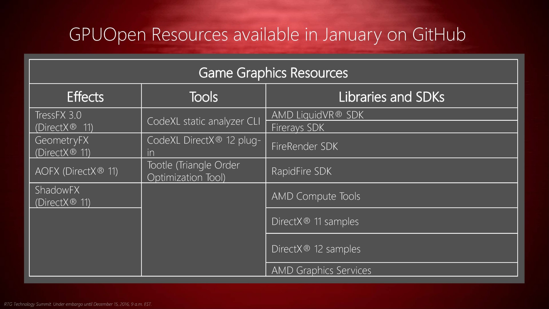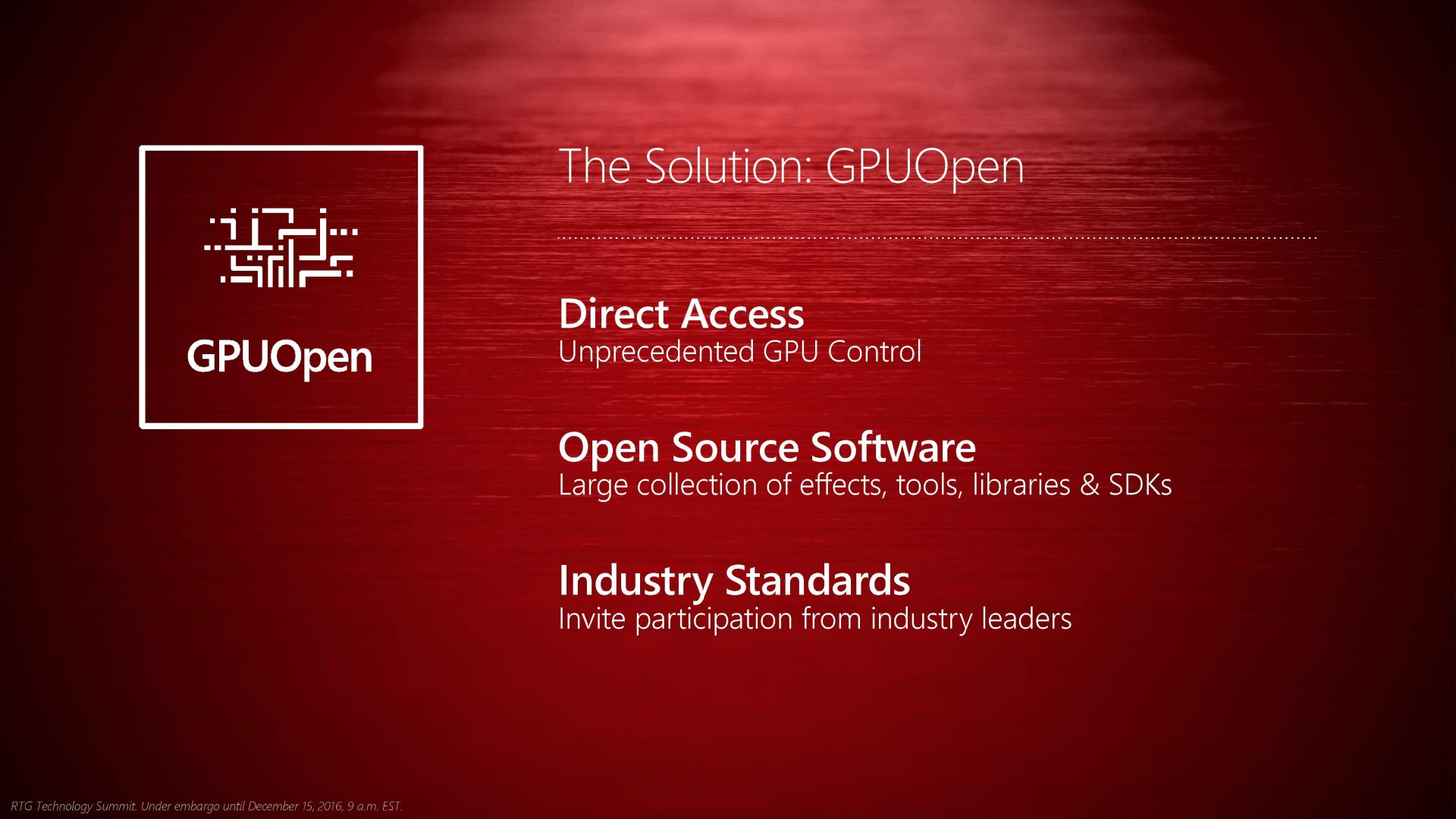 Lors de l'introduction de ses nouveaux pilotes, Radeon Software Crimson Edition, le Radeon Technology Group d'AMD avait annoncé que ceux-ci ne représentaient qu'un pan de sa stratégie au niveau software et que d'autres éléments suivraient. C'est le cas aujourd'hui avec GPUOpen, une remise en forme de sa stratégie à destination des développeurs. Comme le nom de cette initiative l'indique, AMD mise sur l'open source, tout d'abord dans le monde du jeu vidéo pour lequel les spécialistes du GPU fournissent samples, librairies et autres outils destinés à aider les développeurs à améliorer le rendu graphique et/ou les performances.