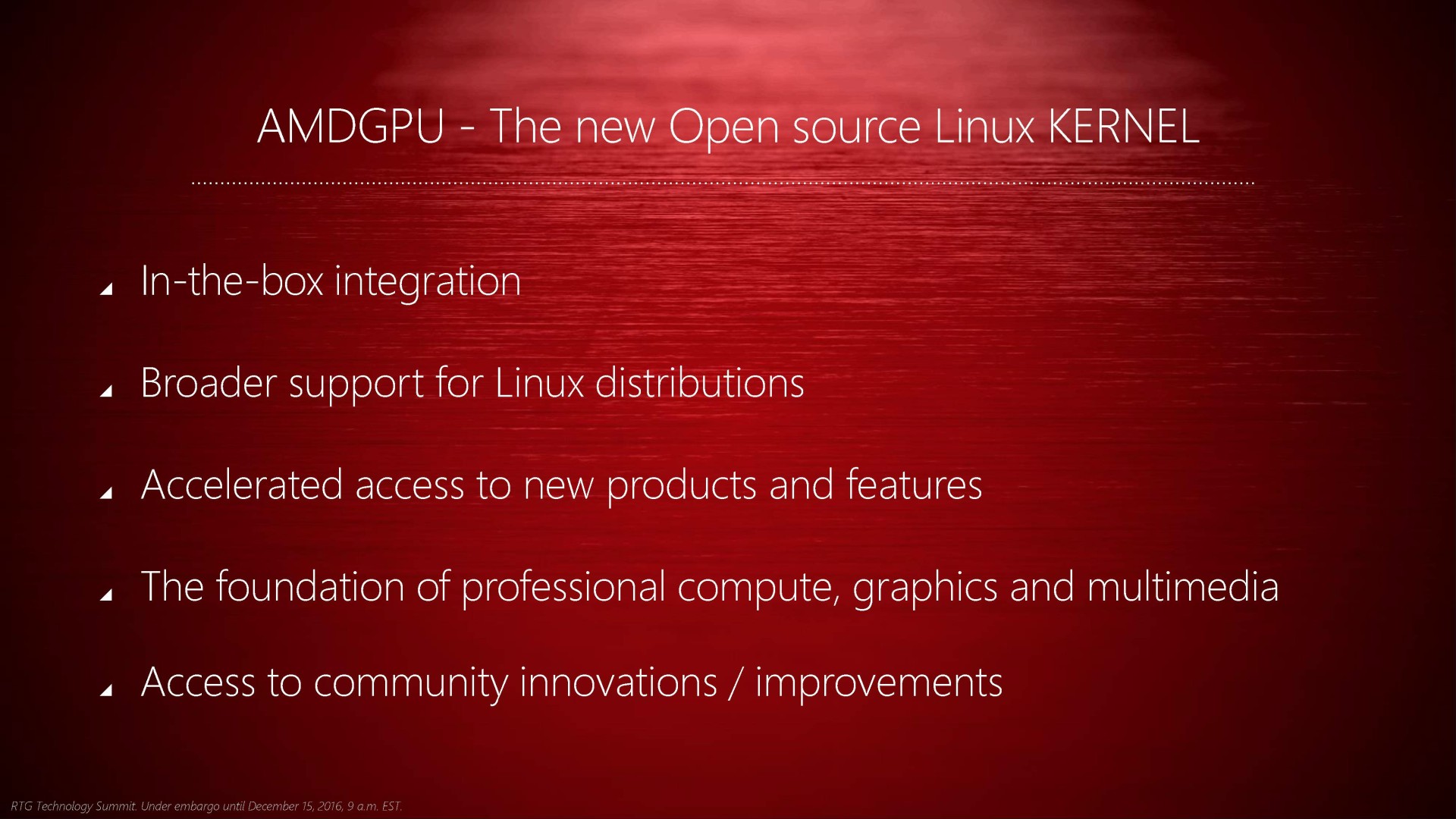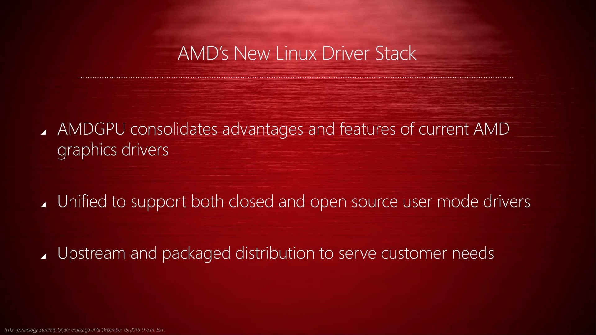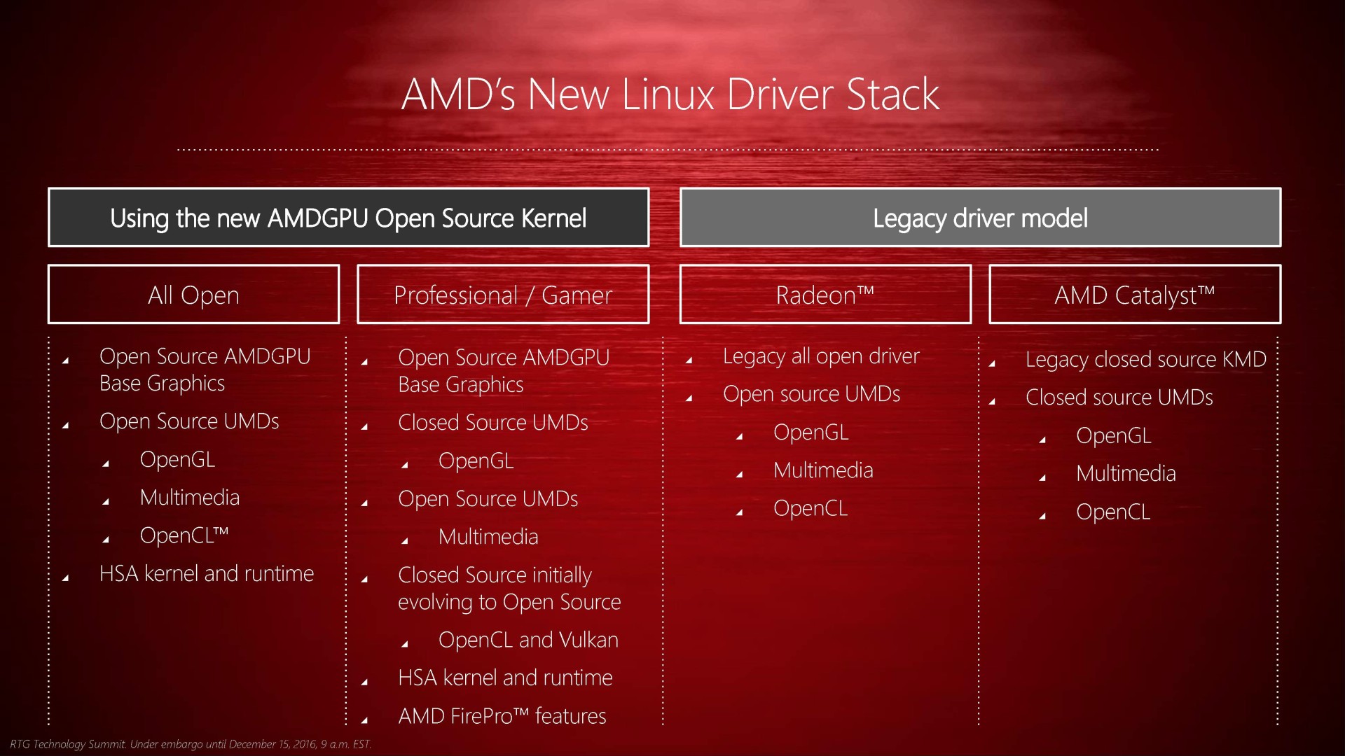 Parallèlement, AMD rappelle que Linux profite depuis quelques temps d'efforts supplémentaires avec AMDGPU, un pilote qui unifie des pans ouverts et fermés/propriétaires avec une même structure, ce qui facilite leur exploitation et leur évolution. A la base d'AMDGPU se trouve un pilote open source (en kernel space) qui peut recevoir des modules ouverts ou fermés suivant les besoins. De quoi permettre à AMD de proposer, sur une même base, un pilote full open source et un autre optimisé pour les performances dans le cadre du jeu et des applications professionnelles. Typiquement, le module OpenGL fermé reste plus performant par exemple mais AMD a pour objectif de passer en open source dès que possible le module OpenCL/Vulkan du pilote "fermé".