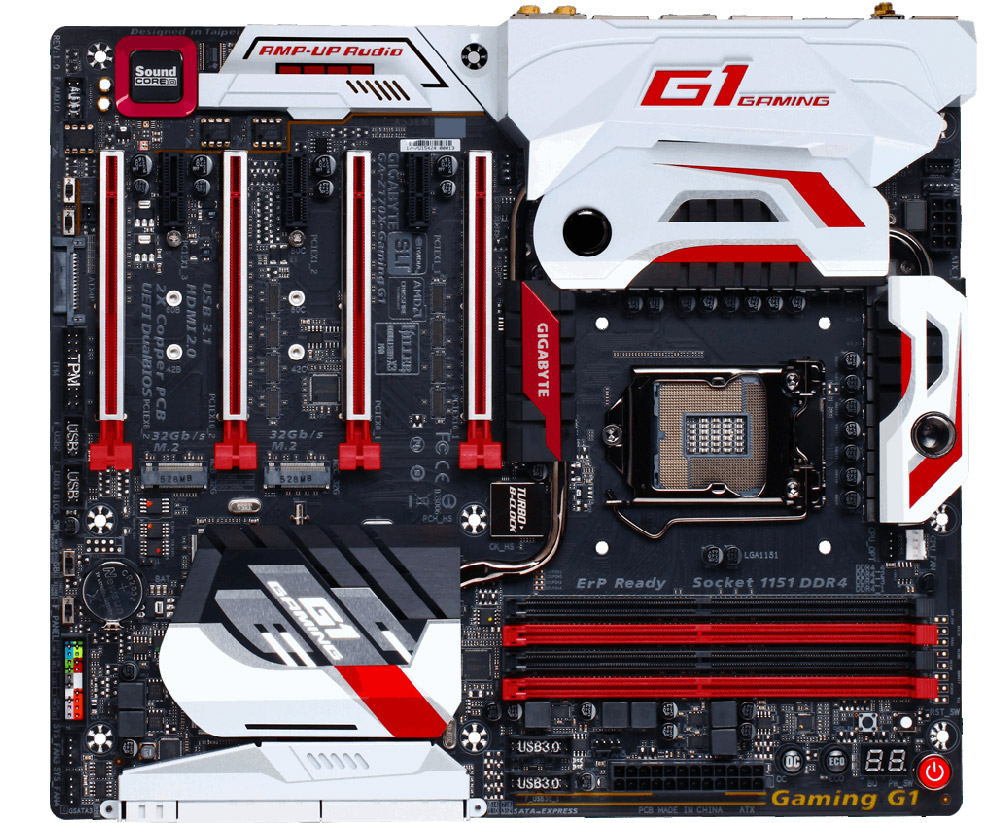 On commence par la gamme Gaming avec quatre références. La G1 est la plus haut de gamme, elle détonne du lot par son format E-ATX. Sa particularité principale tient dans l'utilisation d'un pont PCI Express (non précisé) pour proposer quatre ports reliés au processeur. On y retrouve aussi deux Killer E2400 ainsi qu'un contrôleur 802.11ac Killer également. Côté son c'est le Creative Sound Core 3D qui officie et l'on notera que la seule sortie vidéo est l'HDMI géré par la puce MDCP mentionnée plus haut.