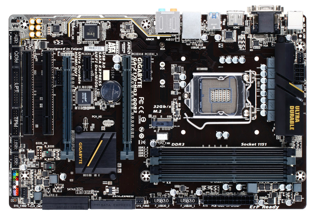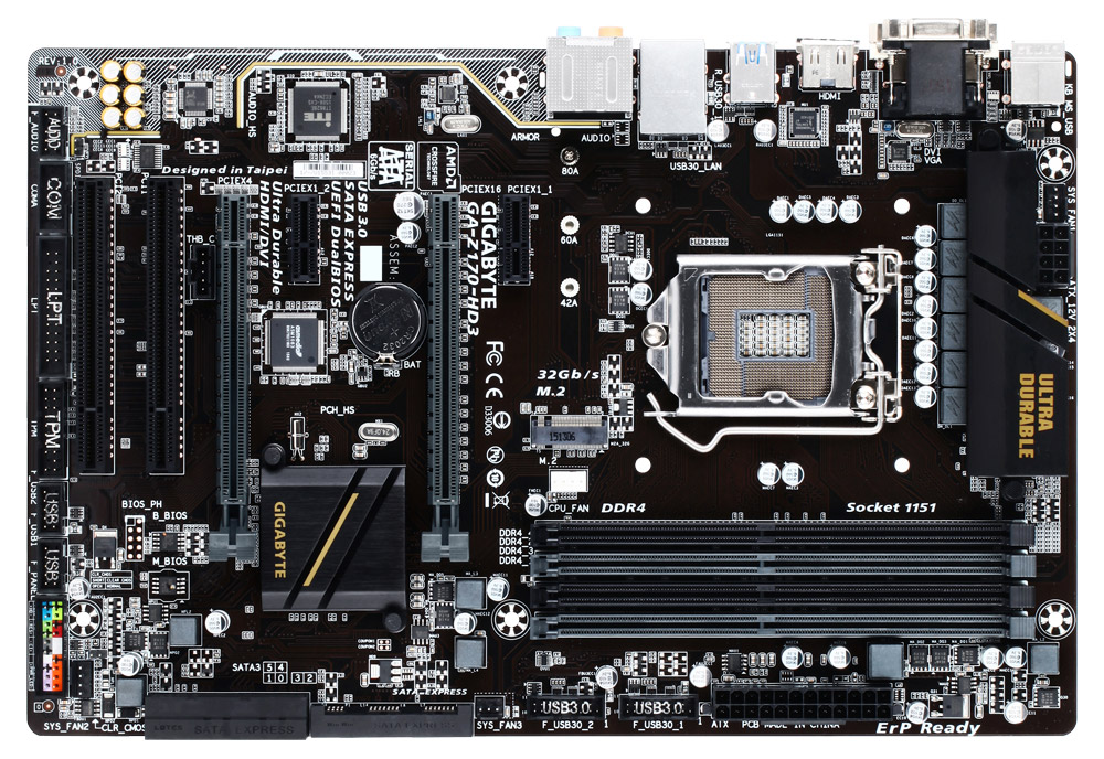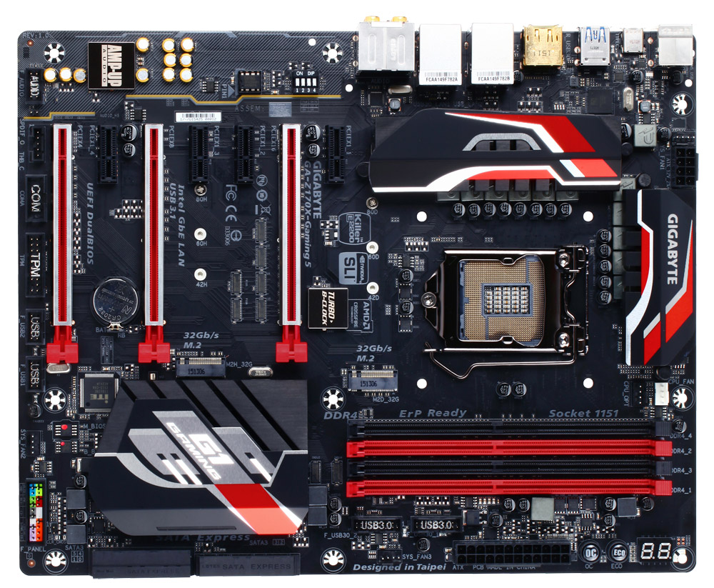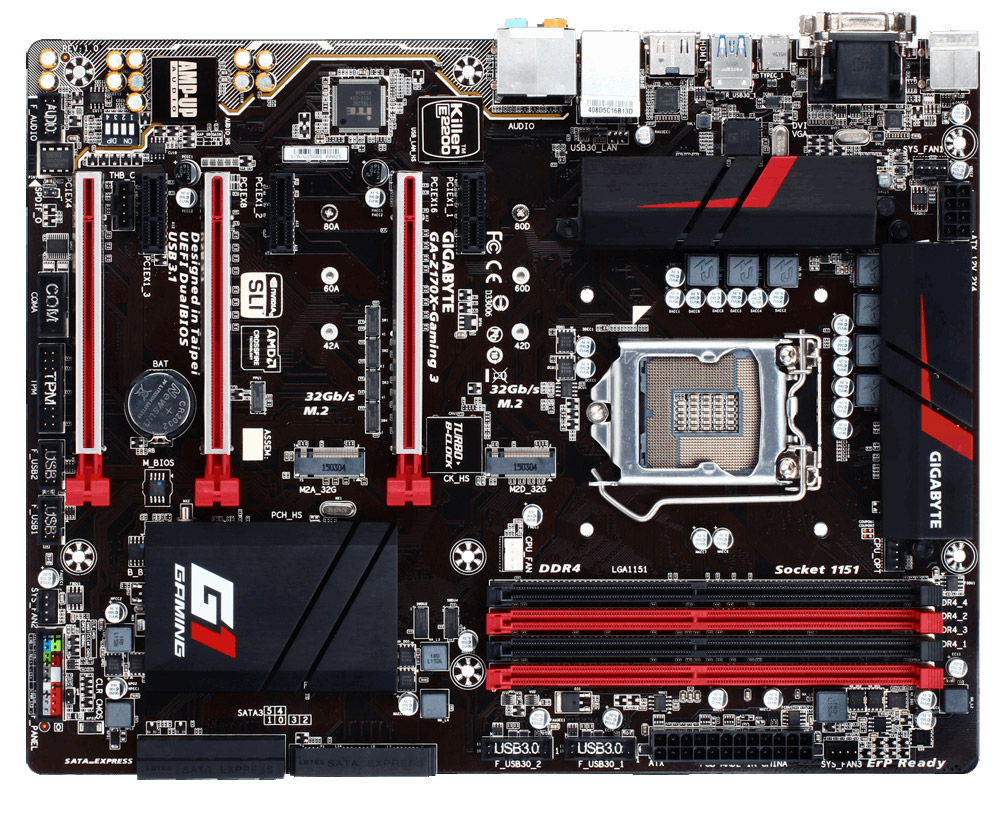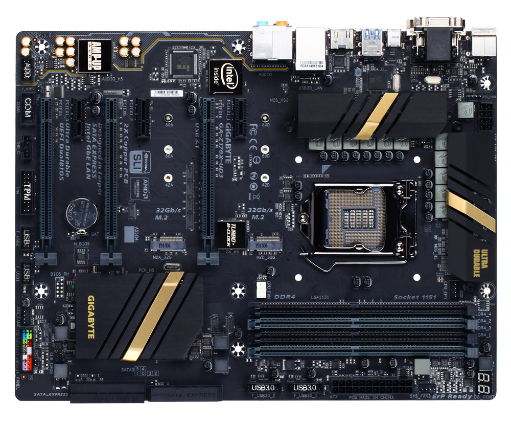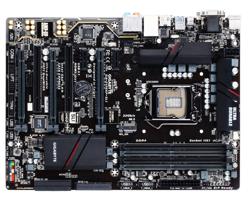 La Z170XP-SLI est assez différente visuellement mais nous l'avons groupé ici car elle conserve des composants similaires. Elle perd sa sortie S/PDIF optique ainsi qu'un connecteur M.2, et le contrôleur USB 3.1 Intel y est remplacé par de l'ASM1142. Côté prix il faudrait compter environ 170 euros pour l'UD3 et 155 pour la XP-SLI.
