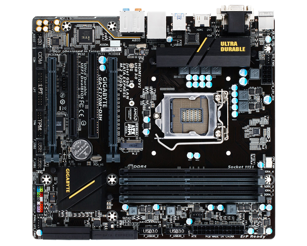 La D3H est disponible également en version microATX avec des caractéristiques légèrement différentes, le son migrant vers de l'ALC892 tandis que l'on perd aussi le port Type-C. On notera que le manuel de la Z170M-D3H évoque une version DDR3 qui n'apparait pas encore sur le site de Gigabyte. Comptez moins de 140 euros pour la Z170M-D3H