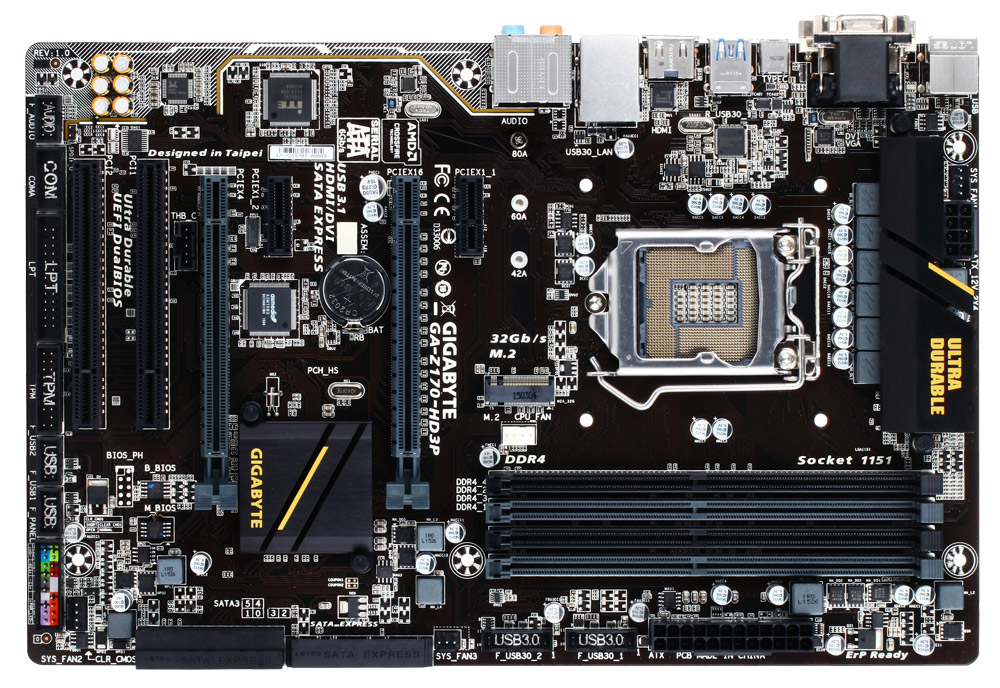 En dessous de ces modèles on retrouve l'entrée de gamme qui se caractérise par un seul port PCI Express connecté au processeur. Tout en haut de cette gamme on retrouve la Z170-D3H qui conserve avec bonheur l'ALC1150 côté son, même si elle ne dispose plus de sortie optique. Le réseau est Intel, mais l'on n'aura pas d'USB 3.1. Comme chez les autres constructeurs, on trouve sur cette carte un port USB Type-C qui est relié au chipset Intel. Mieux que rien, mais trompeur.