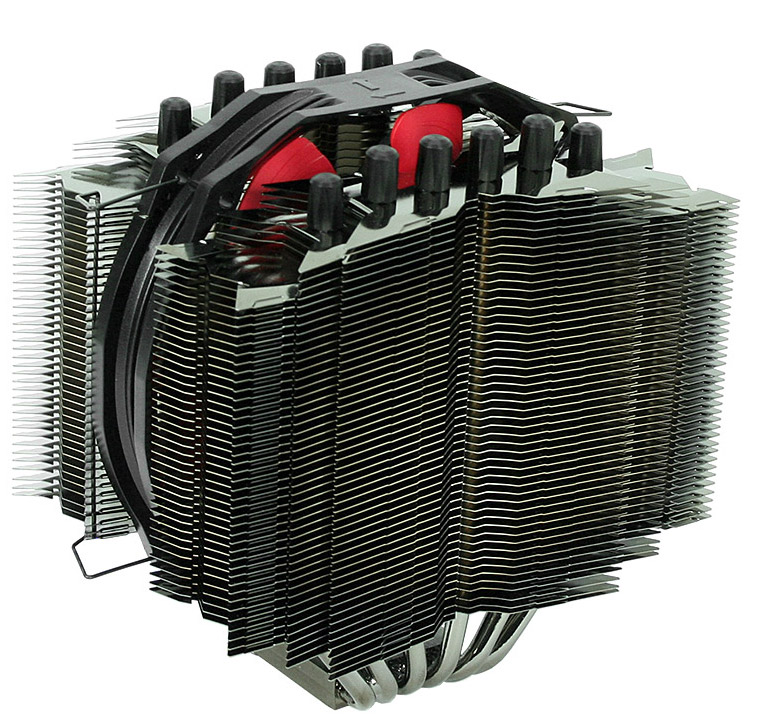 La différence se situe côté ventilateur puisqu'au lieu d'un TY-147 de 140mm fonctionnant entre 300 et 1300 tpm si régulé par PWM, on a cette fois droit à 2 ventilateurs TY-142 de 140mm fonctionnant à 800 tpm au maximum et alimentés par des prises 3 broches, la vitesse minimale en cas de régulation DC n'étant pas précisée. Avec les deux ventilateurs le Macho X fait 150x155x162mm.