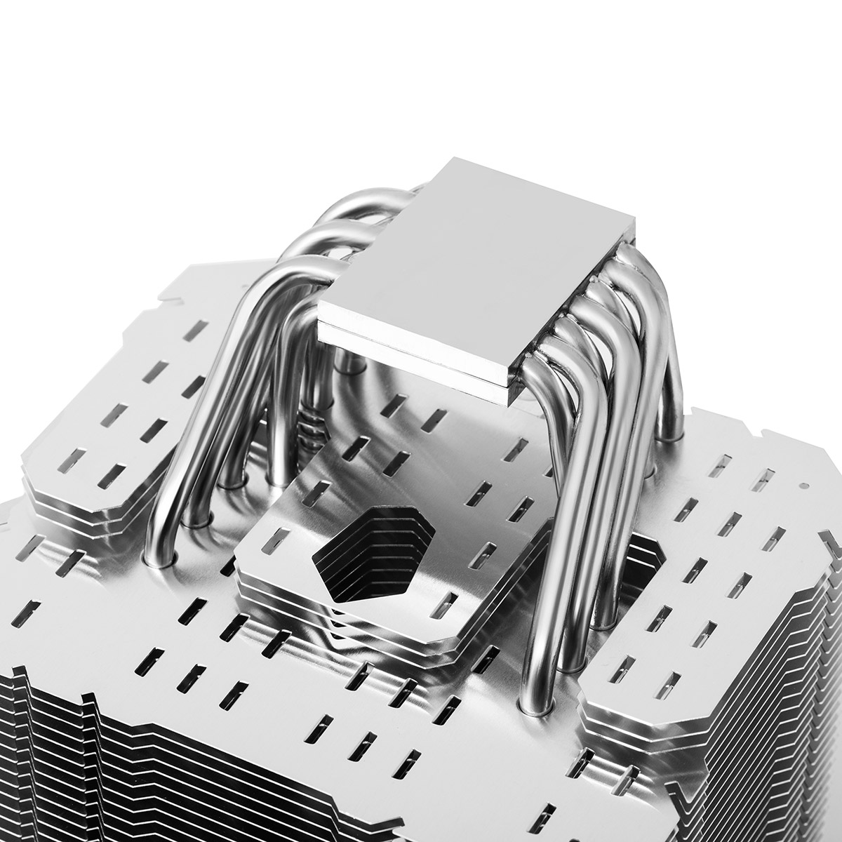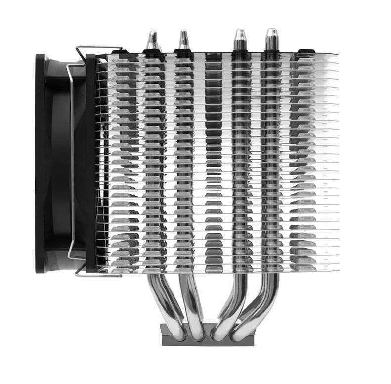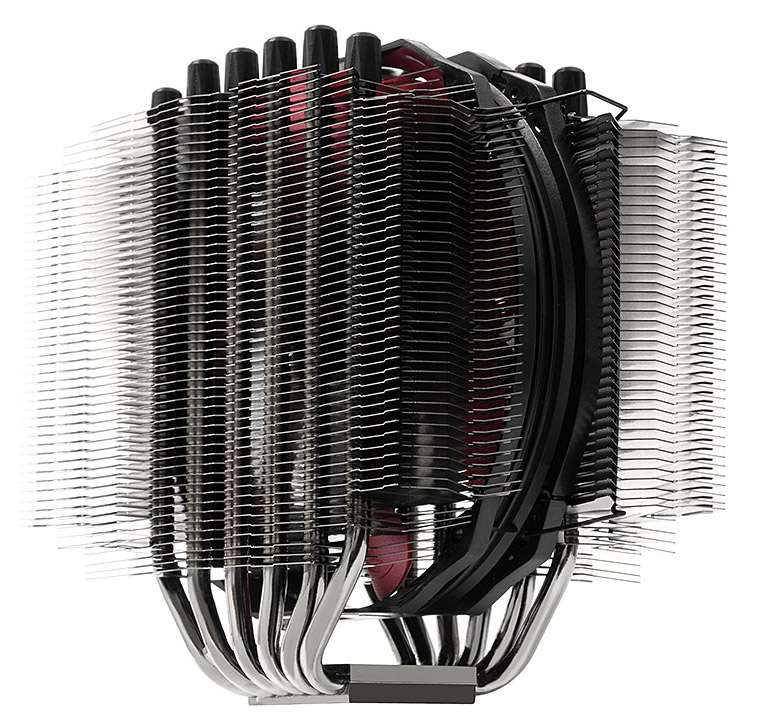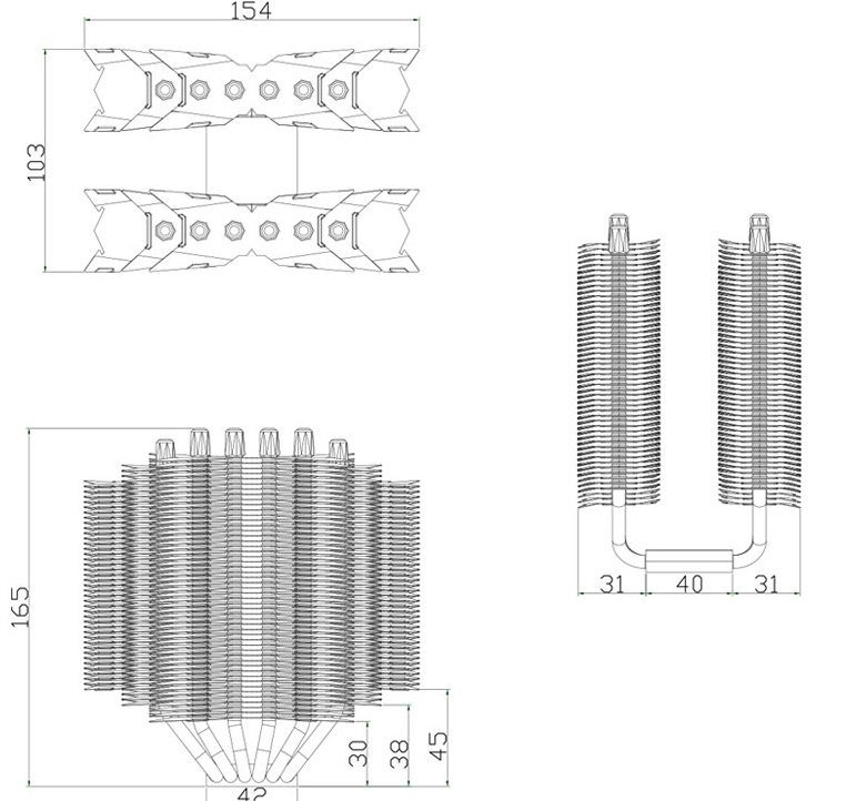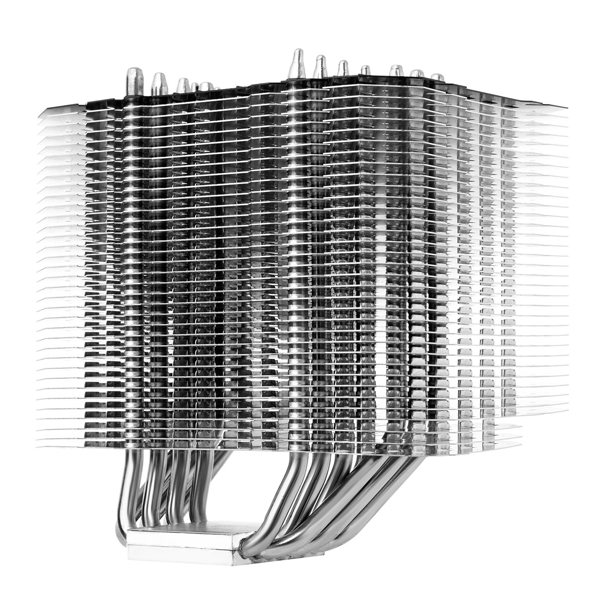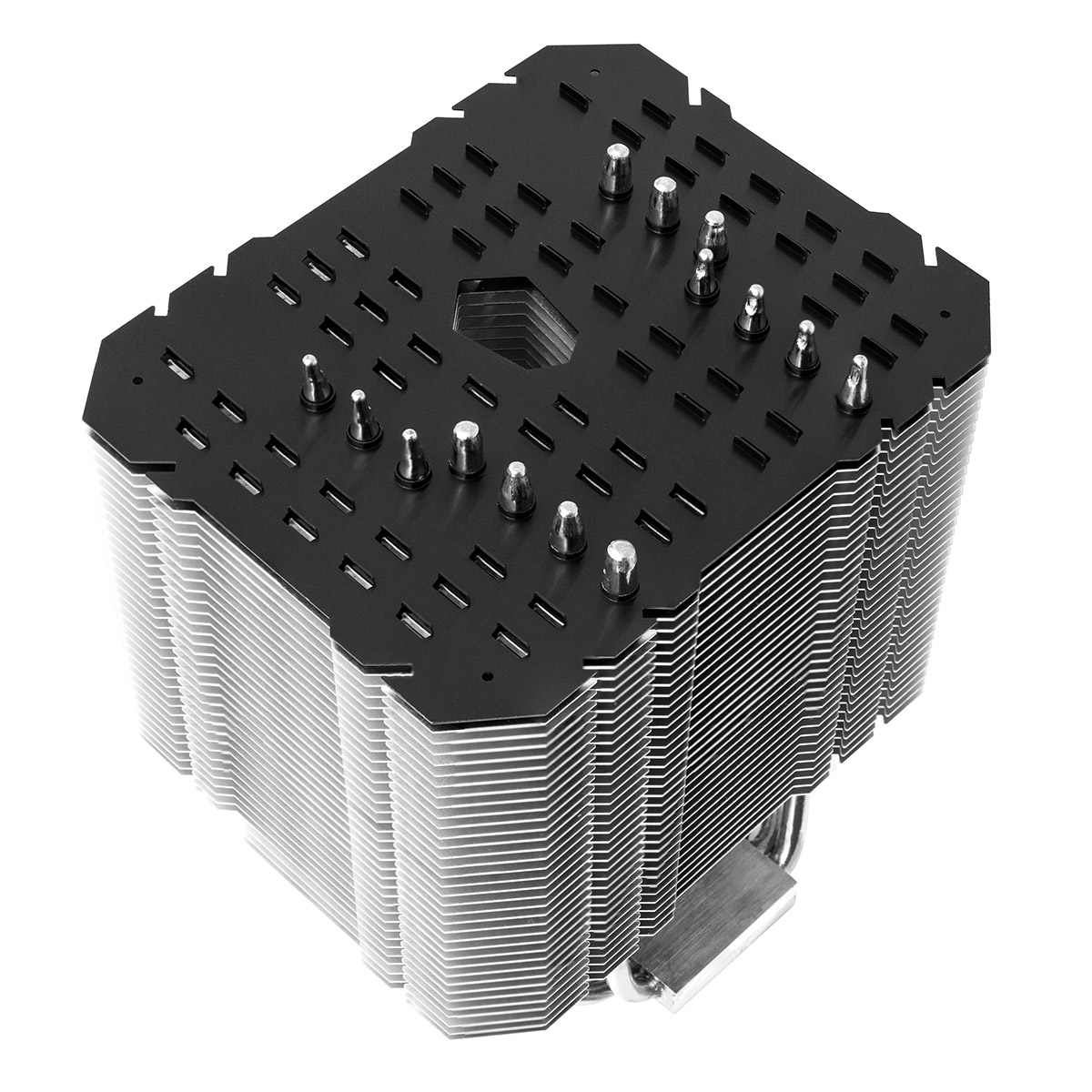 Vous noterez que si la largeur et la profondeur augmentent, la hauteur diminue légèrement ce qui améliorera la compatibilité avec les boîtiers. Côté taille on est donc au-dessus du HR-22 (150x120x159mm) mais ce dernier dispose de 8 caloducs et d'ailettes plus resserrées (une tout les 2.8mm au lieu de 3.1mm) d'où un poids qui atteint 1120g.