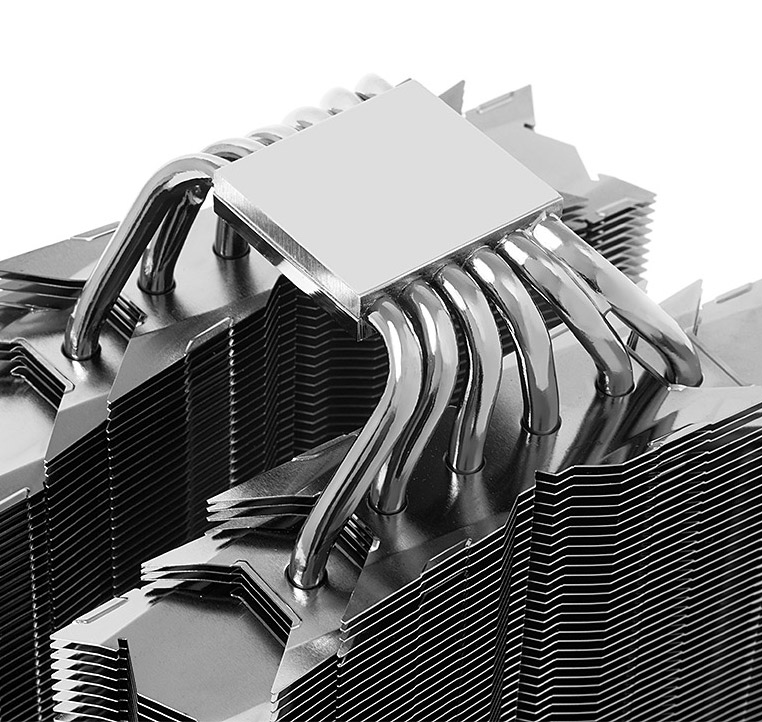 Thermalright lance une nouvelle version de son HR-02 Macho, le Zero. Par rapport à la version classique (Rev.A (BW)), on conserve une base en cuivre, des ailettes en aluminium et 6 caloducs en cuivre de 6mm de diamètre mais le tout est plaqué nickel et coloré en noir.