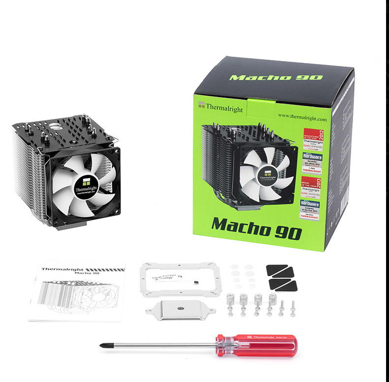 Thermalright décline son célèbre Macho dans une version accompagnée d'un ventilateur 92mm, le Macho 90. Le radiateur intègre 4 caloducs de 6mm de diamètre et mesure 102x102mm pour une hauteur de 135mm, il faut bien entendu ajouter à la profondeur les 25mm du ventilateur. Le ventilateur se positionnera donc au-dessus des slots mémoire, avec une hauteur de 30mm n'autorisant que les barrettes de hauteur classique soit 30mm.