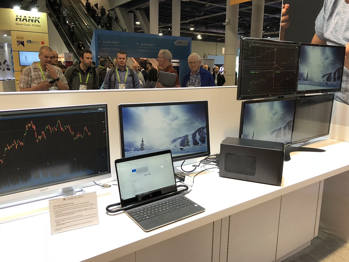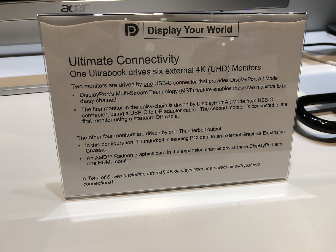Peu loin du stand du HDMI Forum, on retrouvait celui de VESA, le consortium qui développe les standards libres comme le DisplayPort. On pouvait voir sur leur stand une démonstration originale avec un portable pilotant six écrans externes en simultanée à partir de deux câbles USB Type-C.