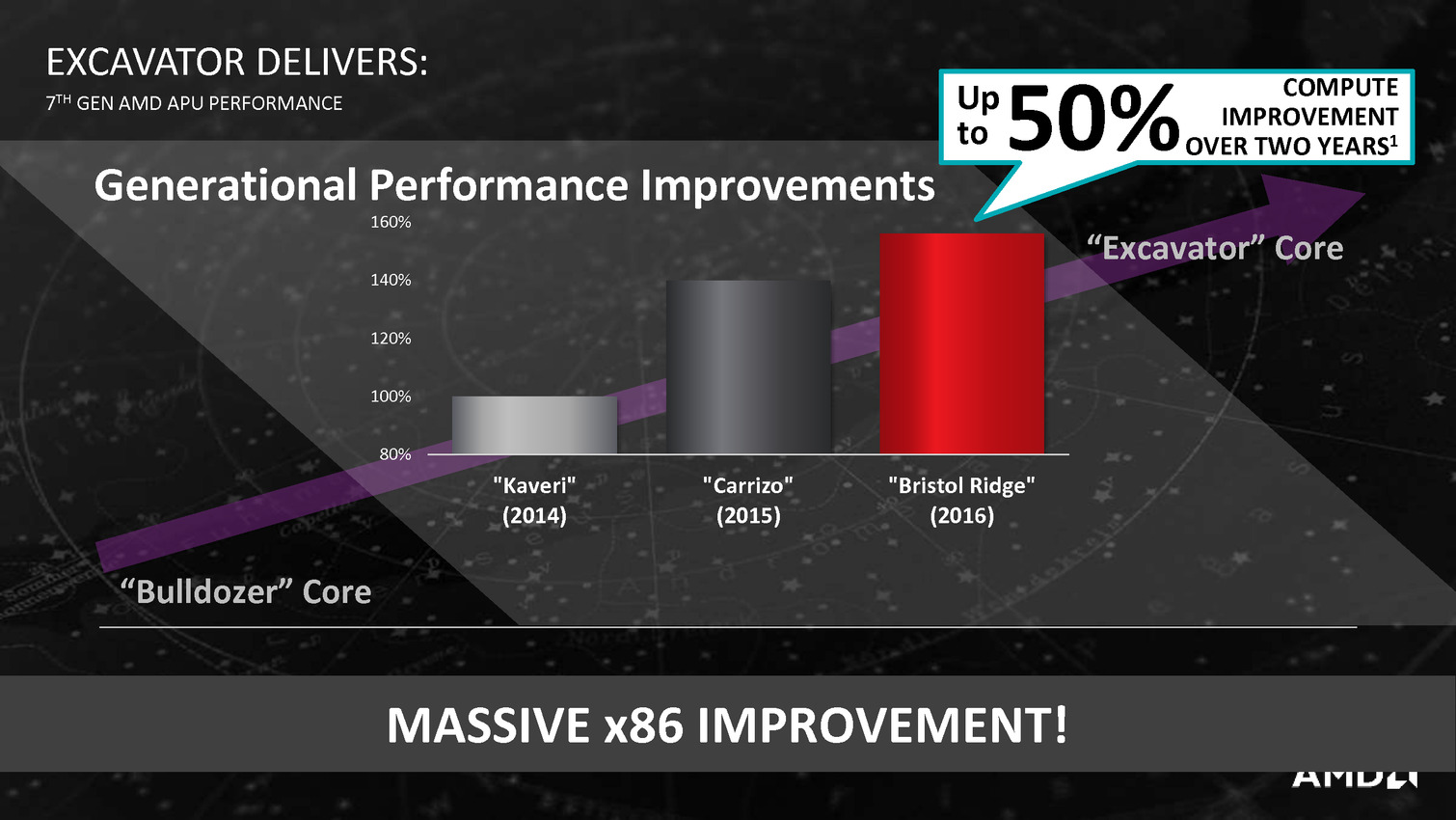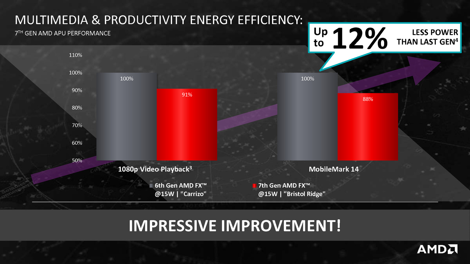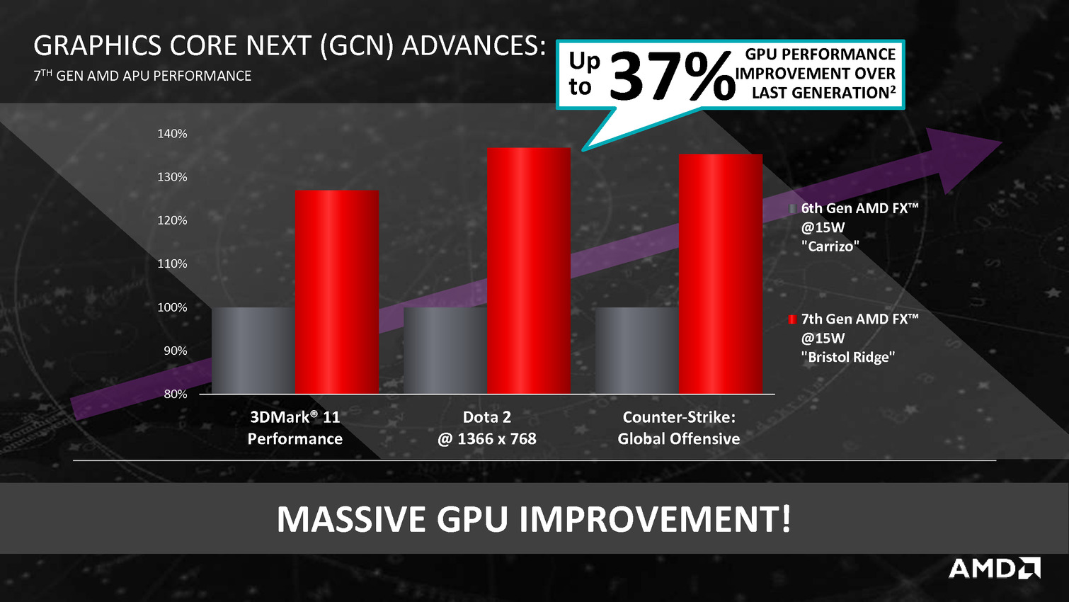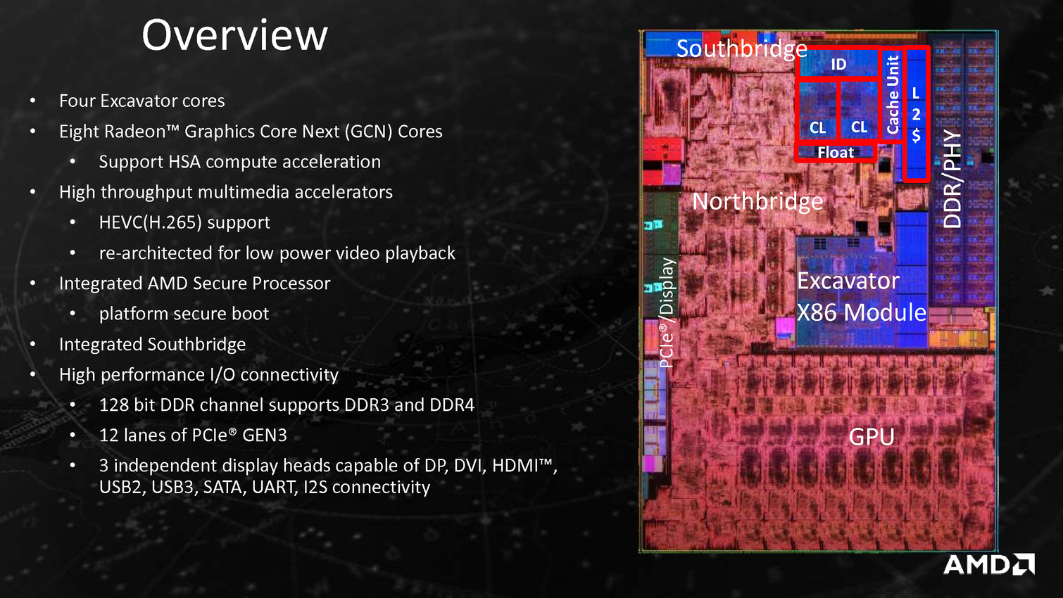 Derrière ces puces se cache en fait la combinaison Excavator et GCN 1.2 déjà utilisée sur Carrizo, avec de menues améliorations destinées à tirer encore plus de ces puces malgré une gravure toujours en 28nm. La moitié des gains viendraient ainsi de modification de l'architecture des transistors chez GlobalFoundries, l'autre de modification permettant de mieux coller aux capacités individuelles de chaque puce ainsi que de la gestion, comme chez Intel depuis les Core M, de la température du système en sus de la température processeur afin d'allonger si possible la durée pendant laquelle l'APU peut aller au-delà de sa consommation de base.