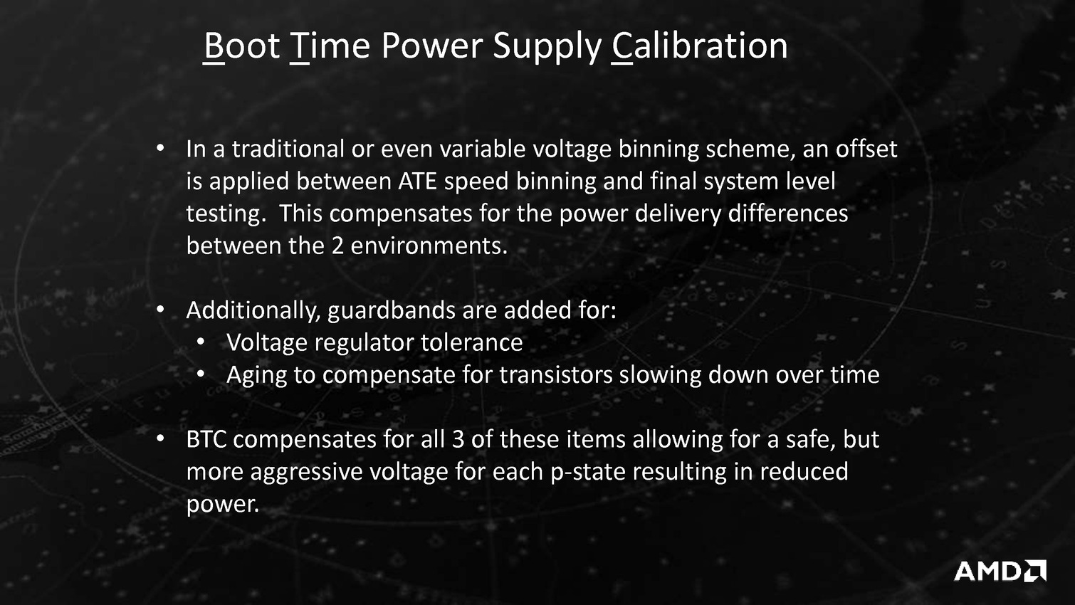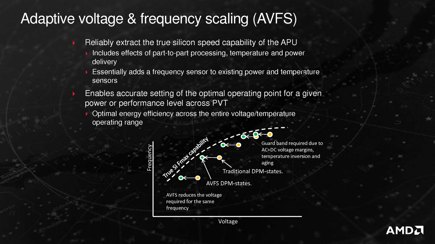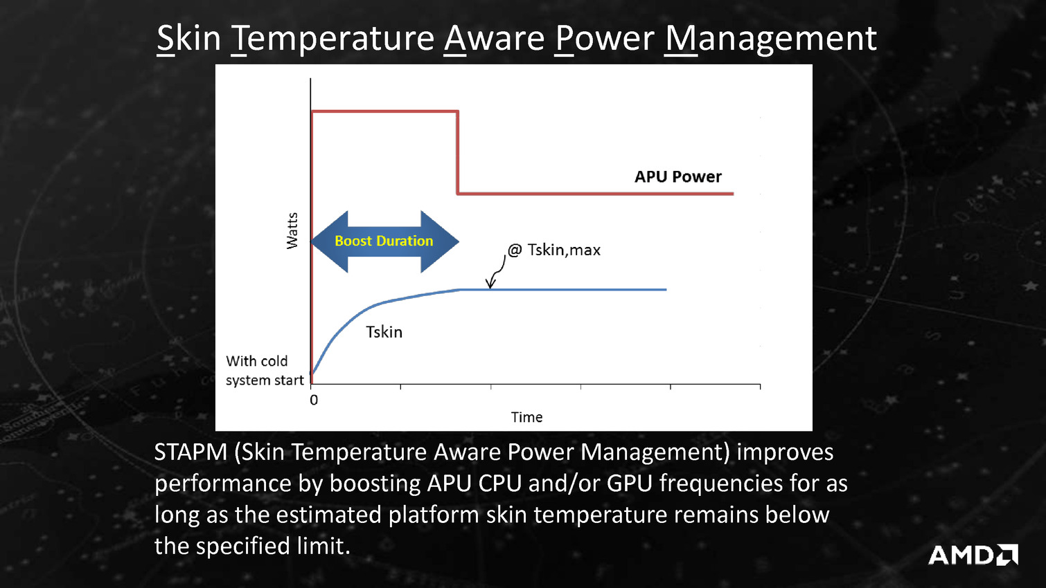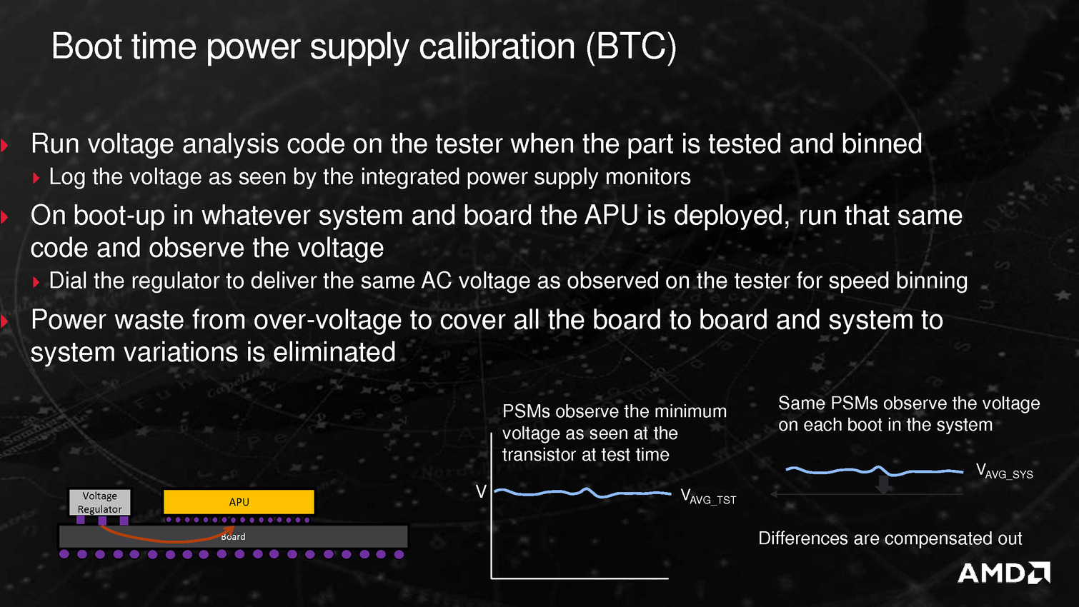 Derrière ces puces se cache en fait la combinaison Excavator et GCN 1.2 déjà utilisée sur Carrizo, avec de menues améliorations destinées à tirer encore plus de ces puces malgré une gravure toujours en 28nm. La moitié des gains viendraient ainsi de modification de l'architecture des transistors chez GlobalFoundries, l'autre de modification permettant de mieux coller aux capacités individuelles de chaque puce ainsi que de la gestion, comme chez Intel depuis les Core M, de la température du système en sus de la température processeur afin d'allonger si possible la durée pendant laquelle l'APU peut aller au-delà de sa consommation de base.
