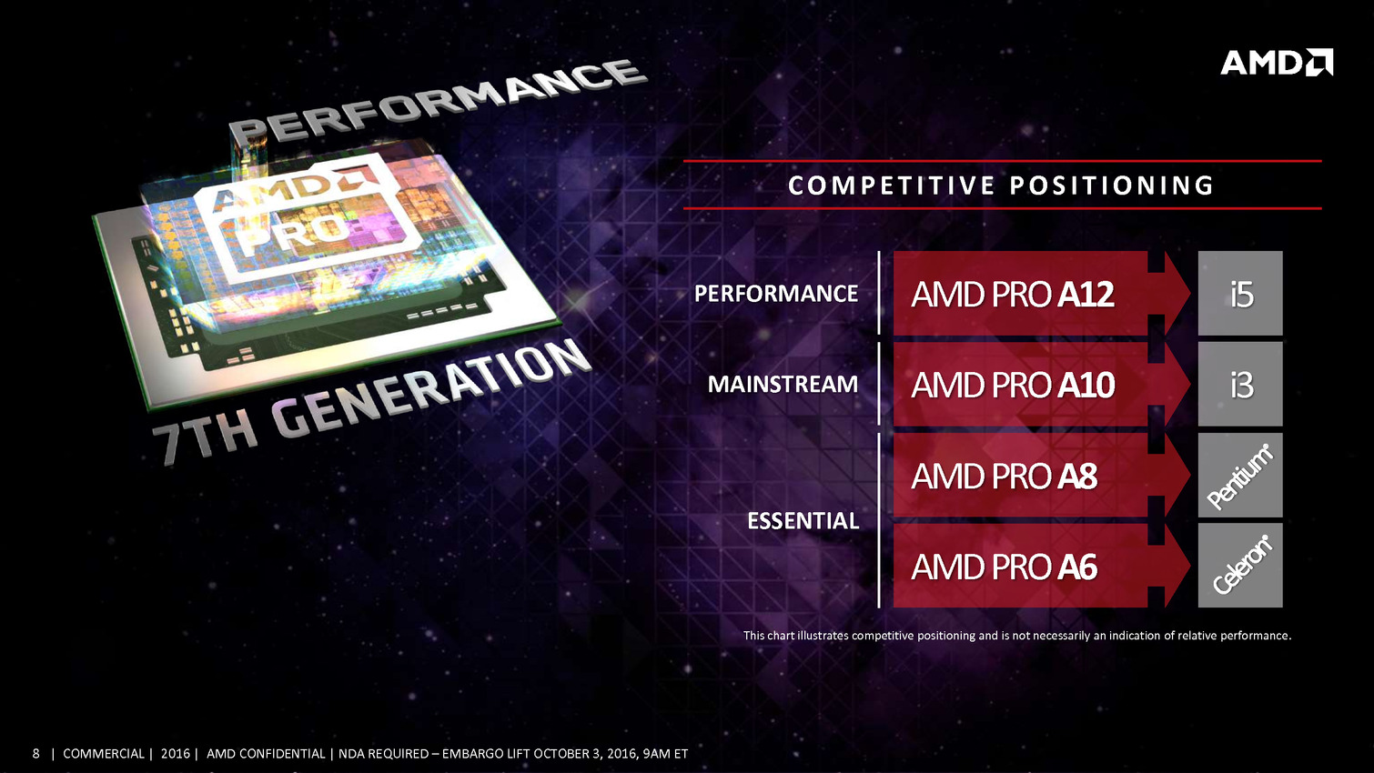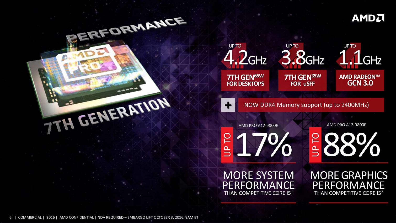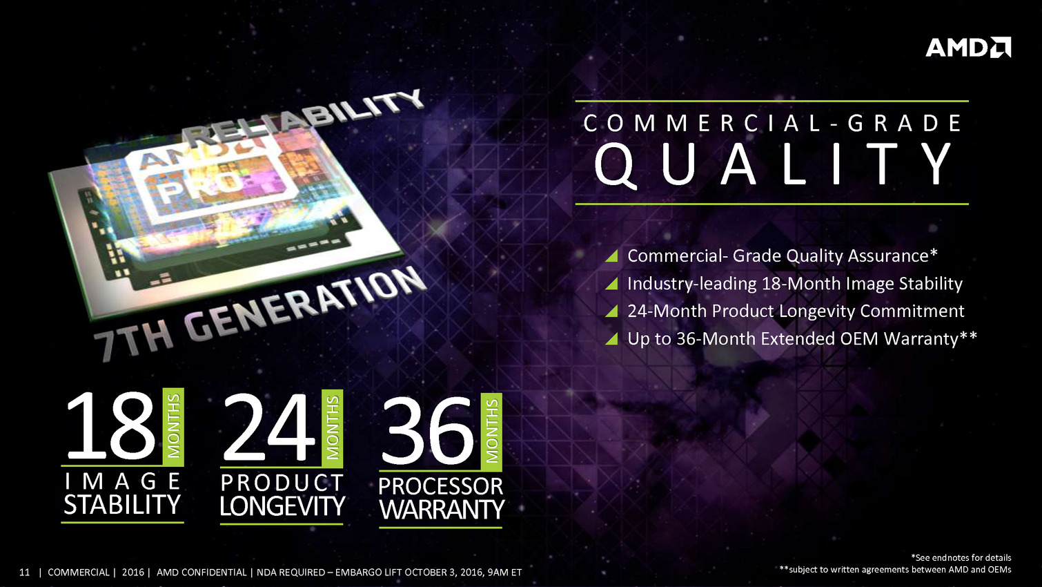 Commercial Grade Quality: Building on exceptional AMD product dependability, identifying manufacturing variability and sourcing AMD PRO products from wafers with the highest yields ensures fewer defective parts and commercial-grade quality for AMD PRO products.