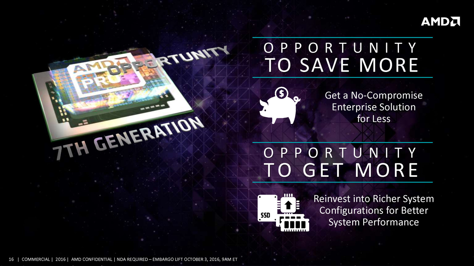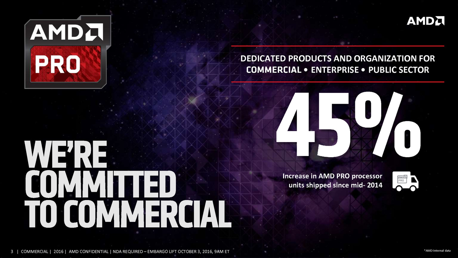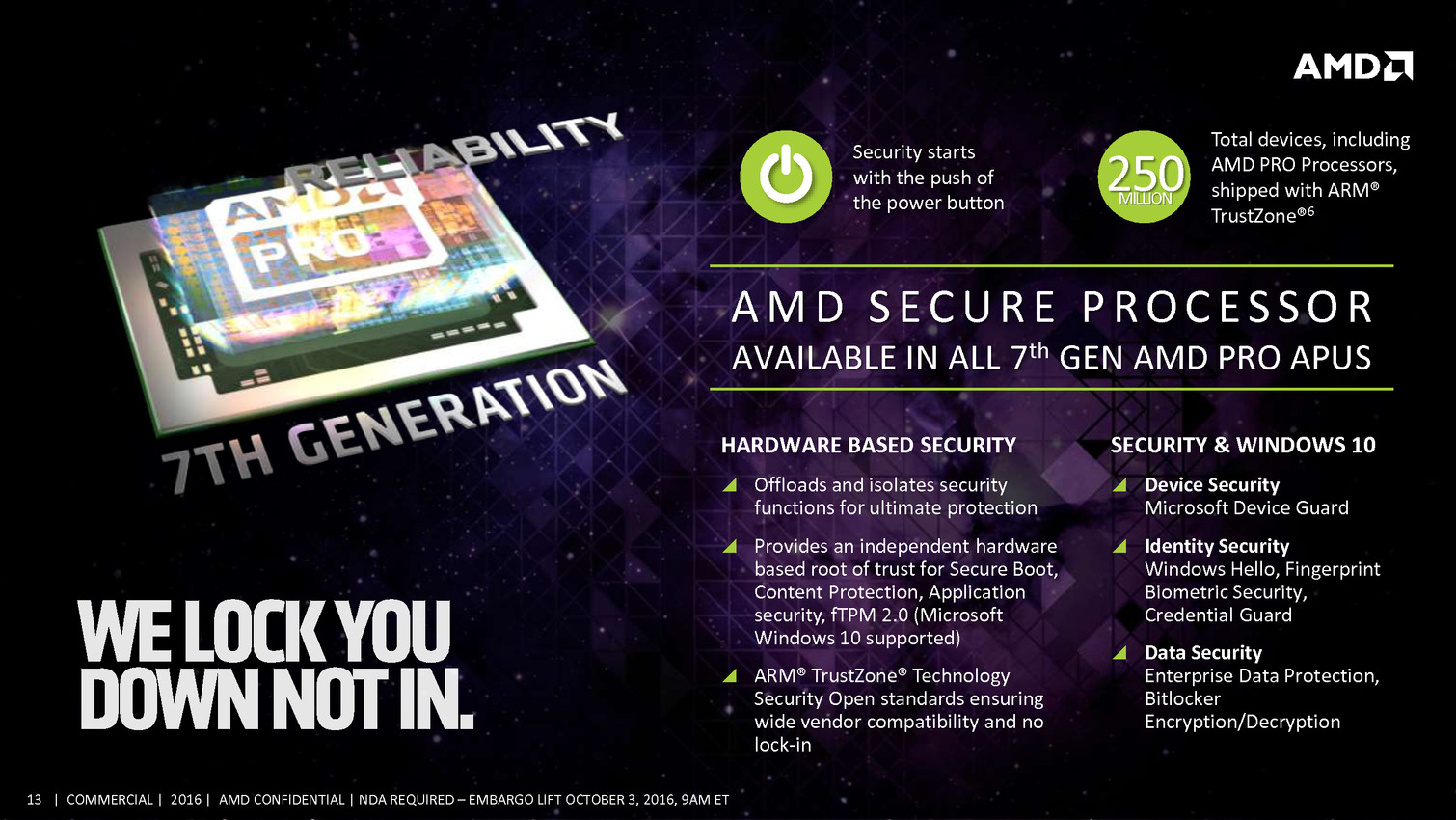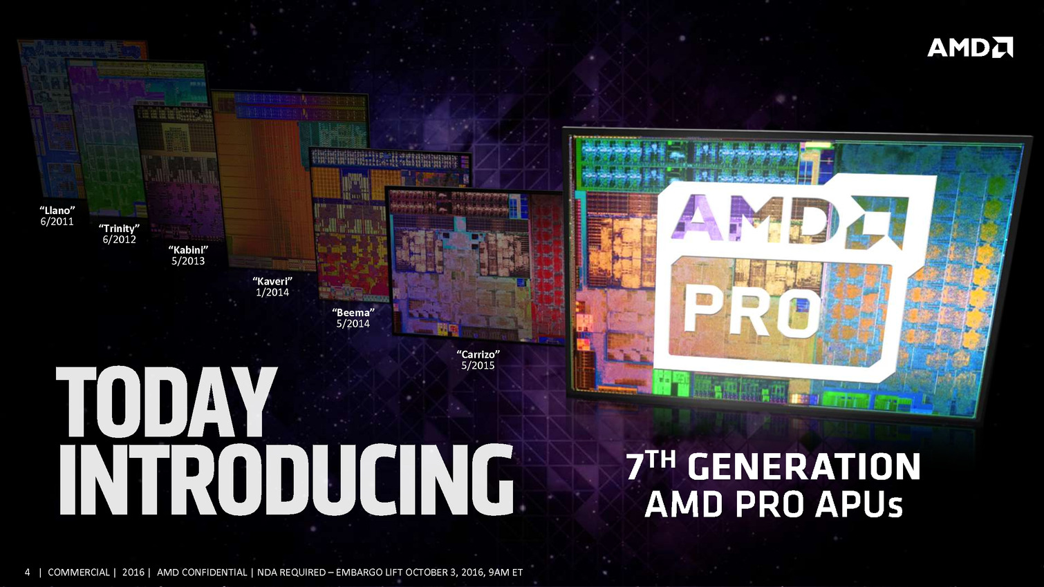 Commercial Grade Quality: Building on exceptional AMD product dependability, identifying manufacturing variability and sourcing AMD PRO products from wafers with the highest yields ensures fewer defective parts and commercial-grade quality for AMD PRO products.