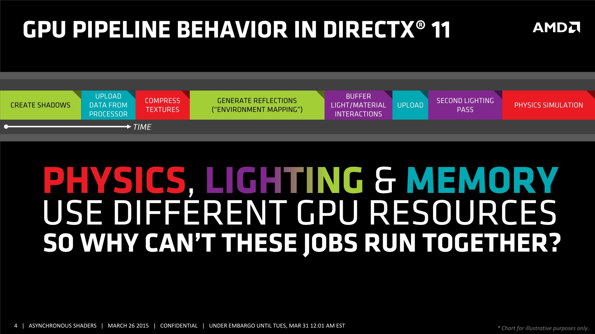 Mais il y a d'autres possibilités au potentiel important. AMD a ainsi mis en avant l'opportunité d'améliorer les performances GPU en profitant du traitement concomitant de certaines tâches. Avec les API classiques, toutes les étapes du rendu sont traitées en série par le GPU. Par exemple, le calcul de la physique, la préparation des ombres dynamiques, le remplissage du G-Buffer, l'éclairage et le post processing sont traités l'un après l'autre, aussi vite que possible par les GPU, mais en série.