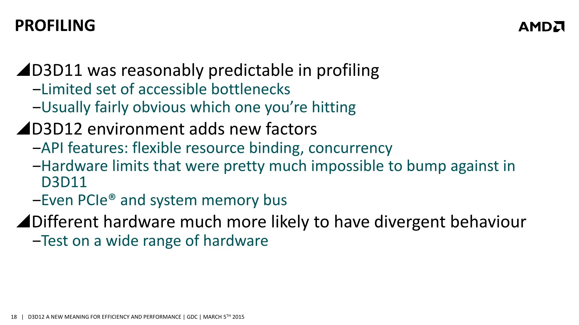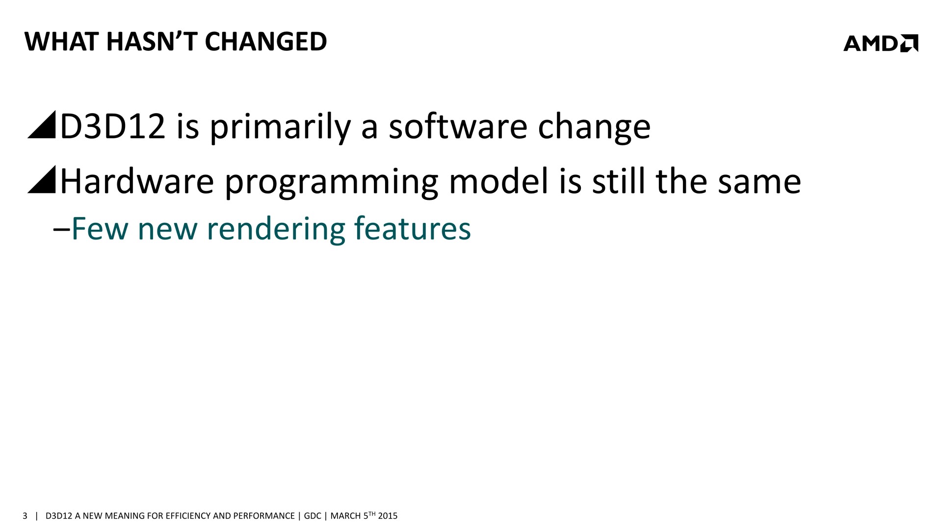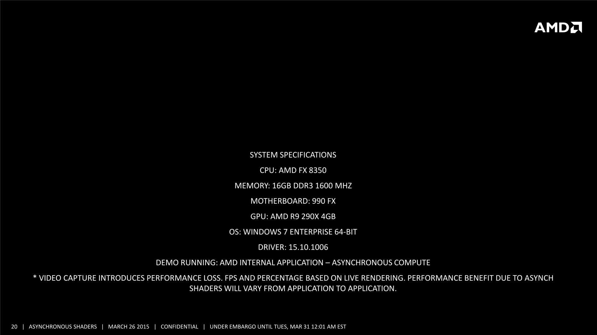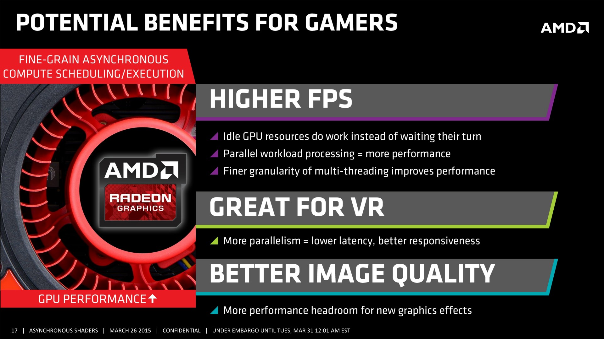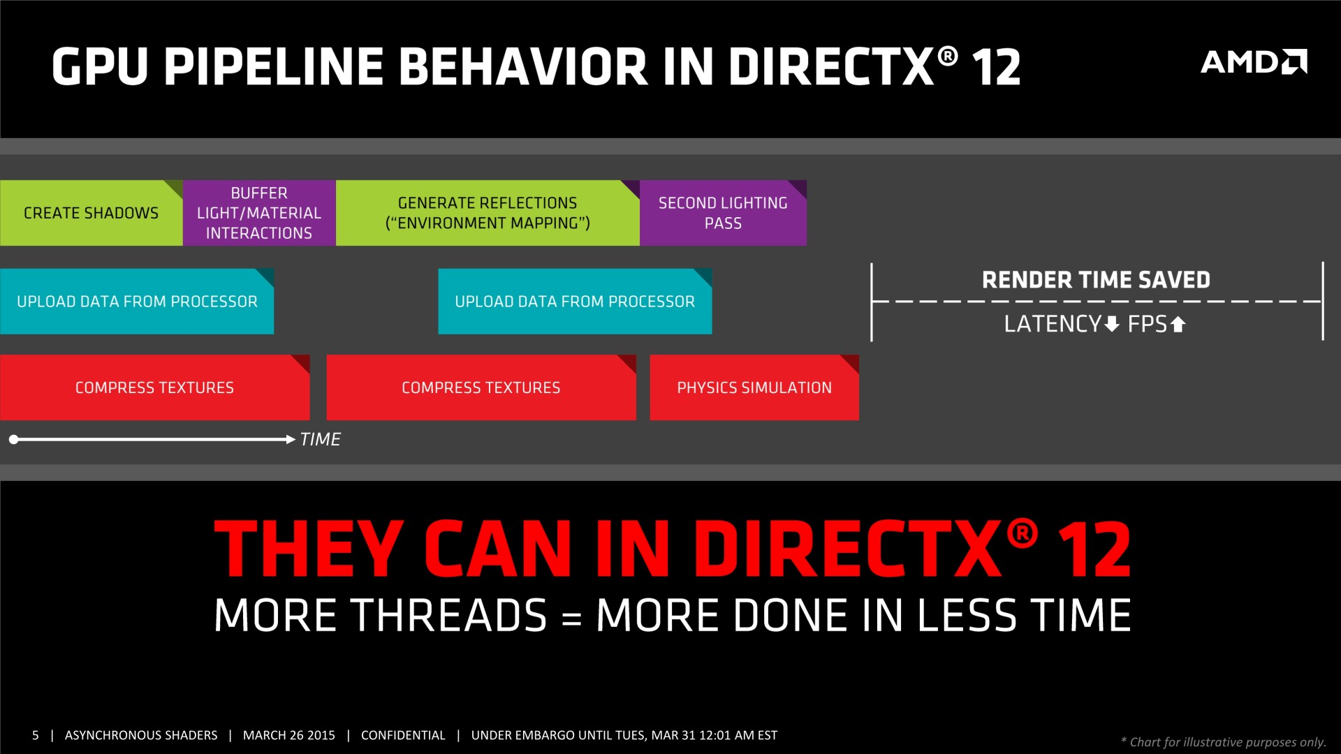 Quelques semaines après la GDC, AMD a décidé de mettre en avant ces possibilités d'optimisations auprès de la presse technique. Une présentation simplifiée nous a ainsi été distribuée il y a quelques jours. A noter que, bizarrement, elle était par contre accompagnée d'un embargo qui prenait fin ce matin… alors même que la présentation plus complète, dont nous vous avions parlé ci-dessus, est publique depuis la GDC. Peu de médias s'y étaient cependant intéressés et le département de marketing technique d'AMD a probablement voulu mettre en place une communication synchronisée sur le sujet.