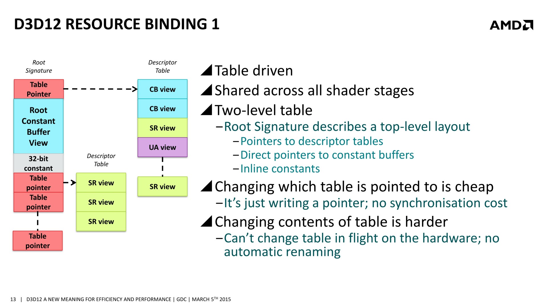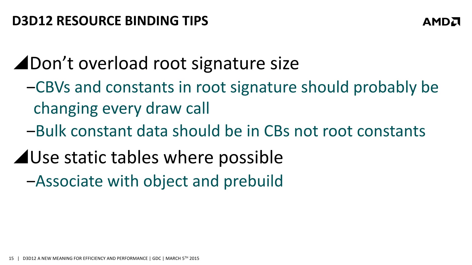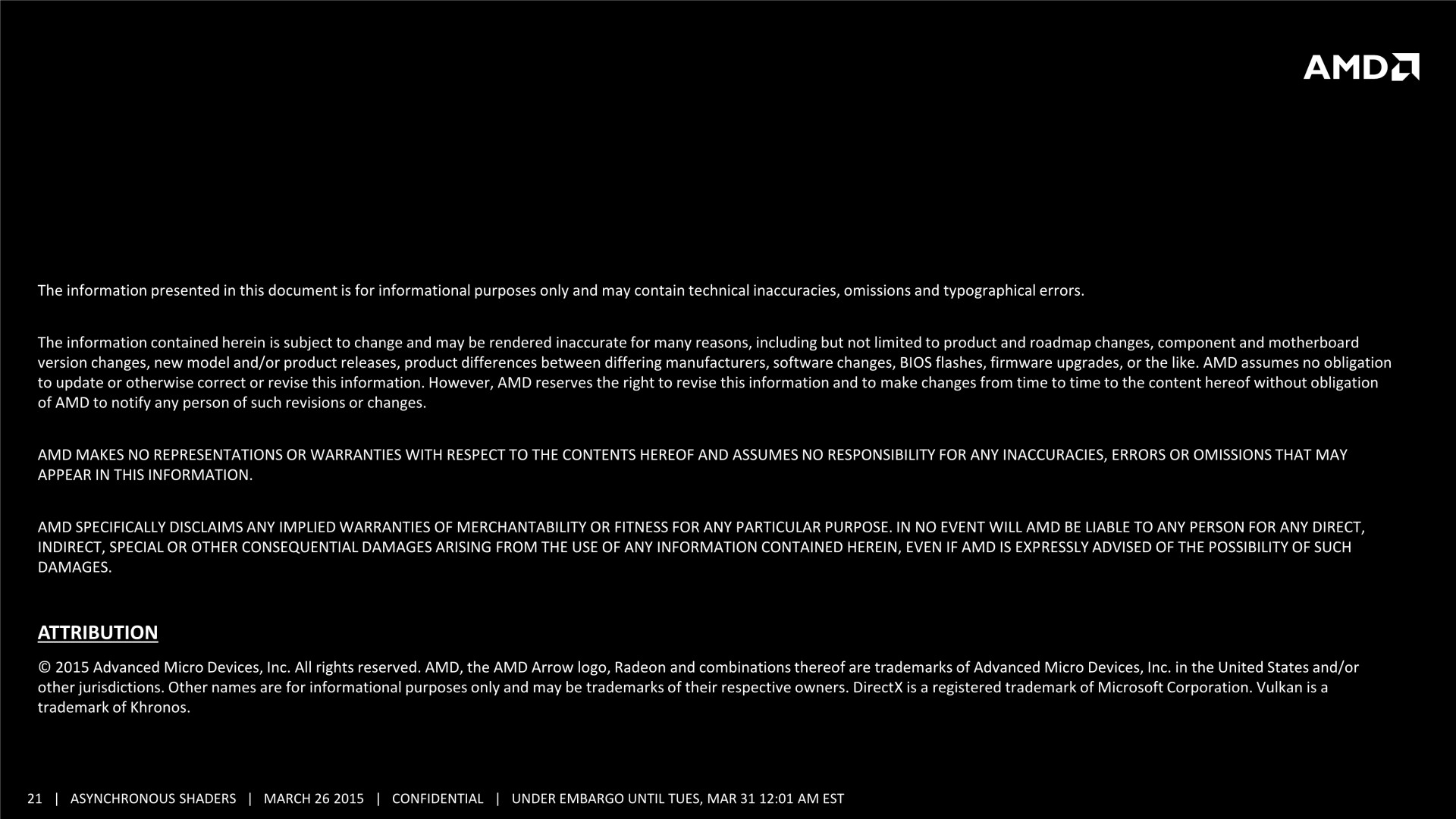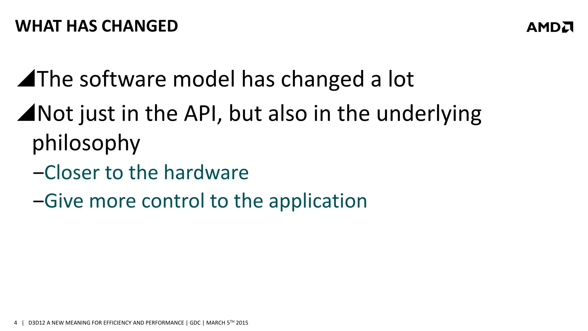 Quelques semaines après la GDC, AMD a décidé de mettre en avant ces possibilités d'optimisations auprès de la presse technique. Une présentation simplifiée nous a ainsi été distribuée il y a quelques jours. A noter que, bizarrement, elle était par contre accompagnée d'un embargo qui prenait fin ce matin… alors même que la présentation plus complète, dont nous vous avions parlé ci-dessus, est publique depuis la GDC. Peu de médias s'y étaient cependant intéressés et le département de marketing technique d'AMD a probablement voulu mettre en place une communication synchronisée sur le sujet.