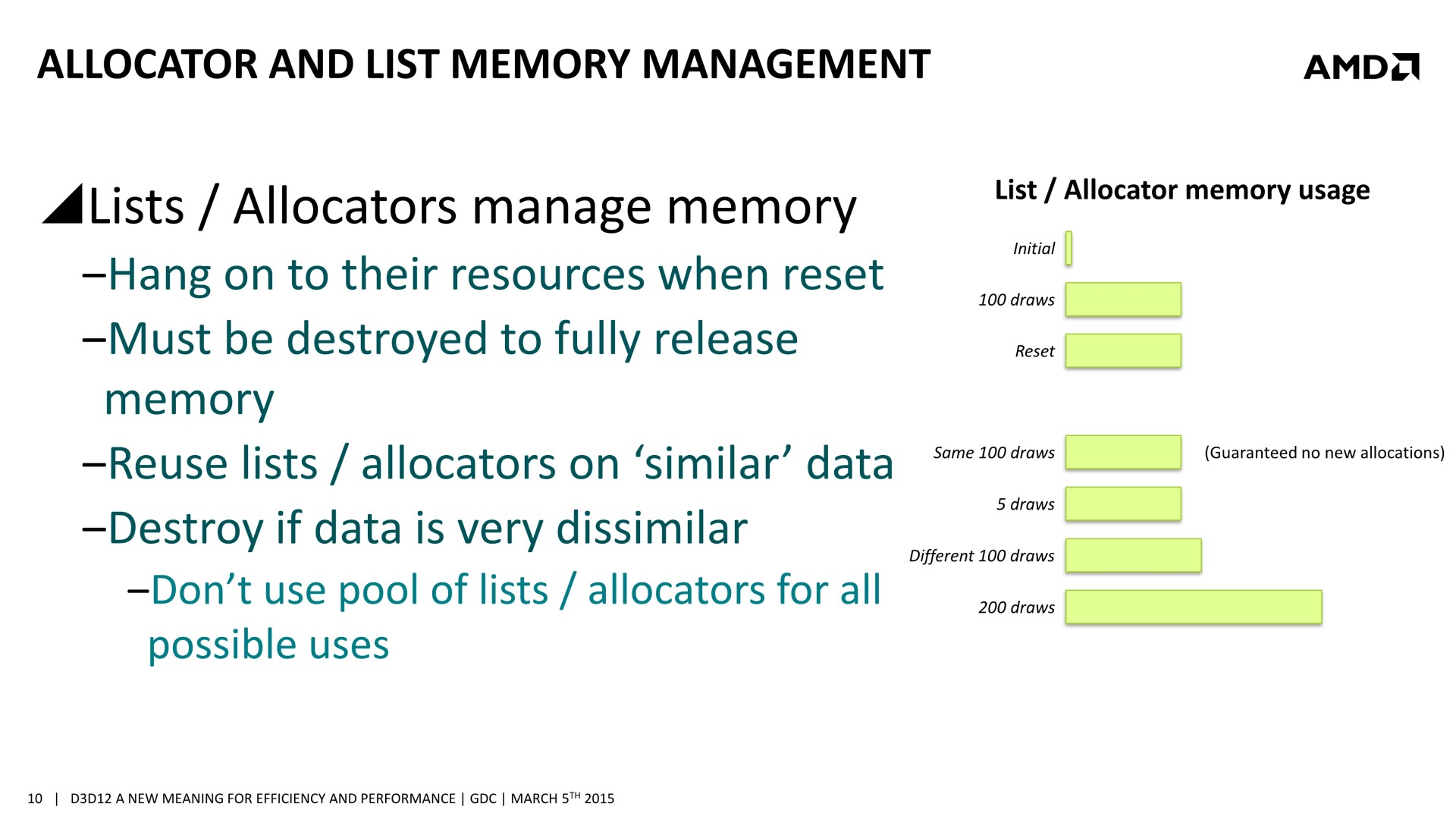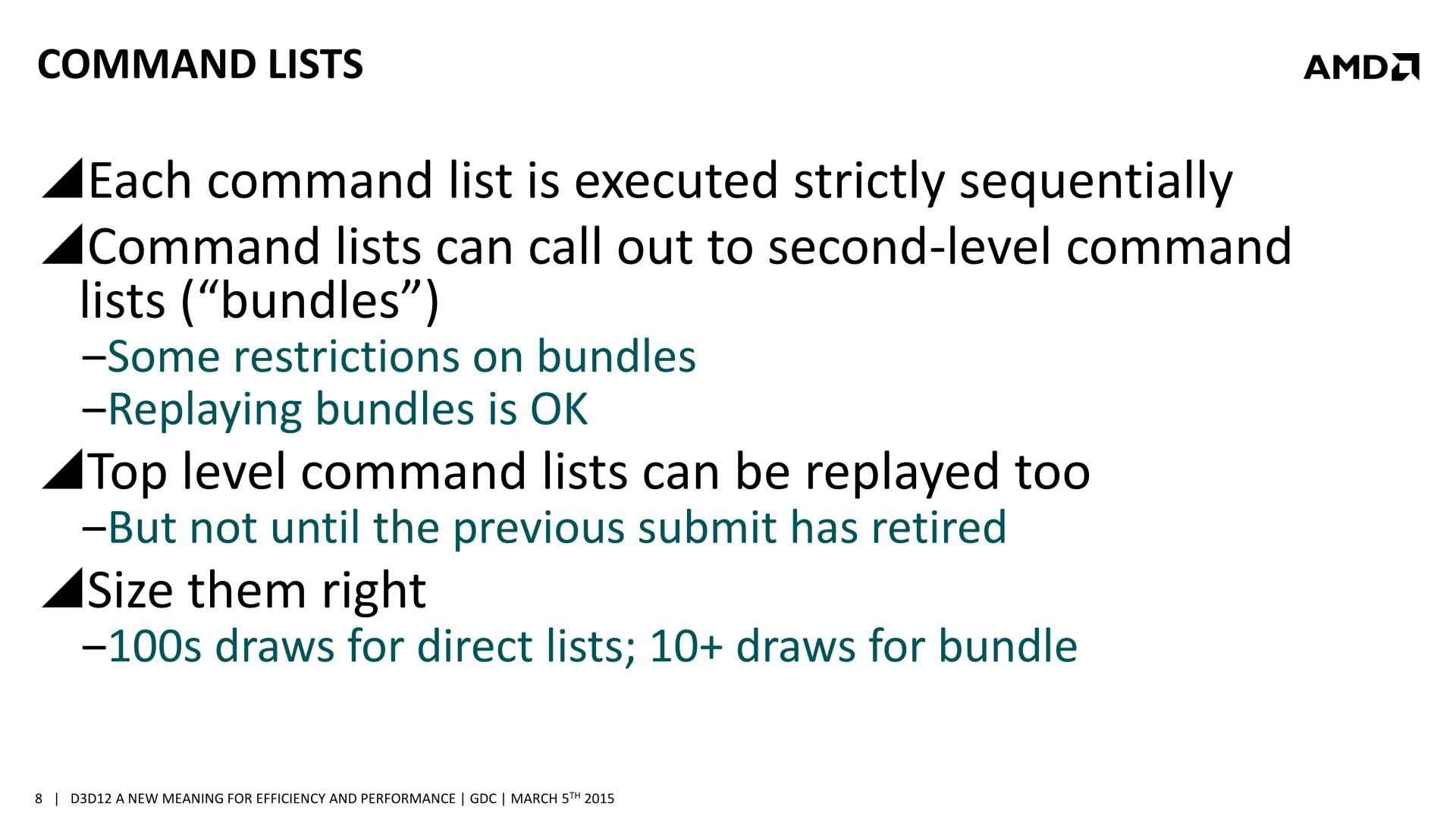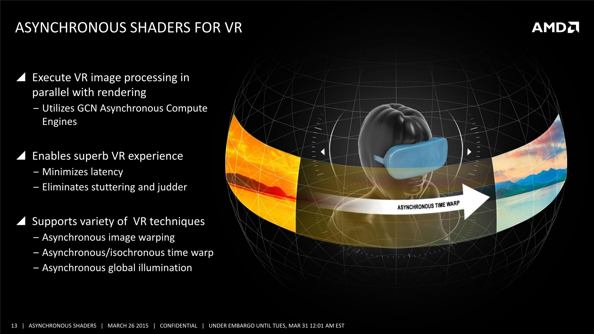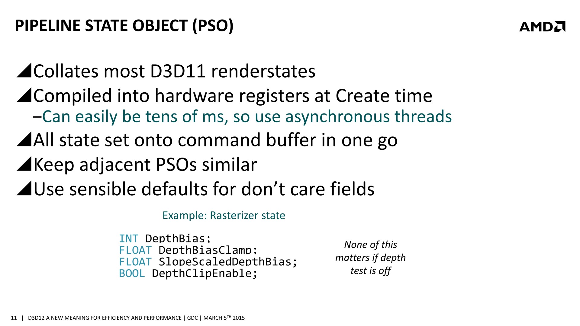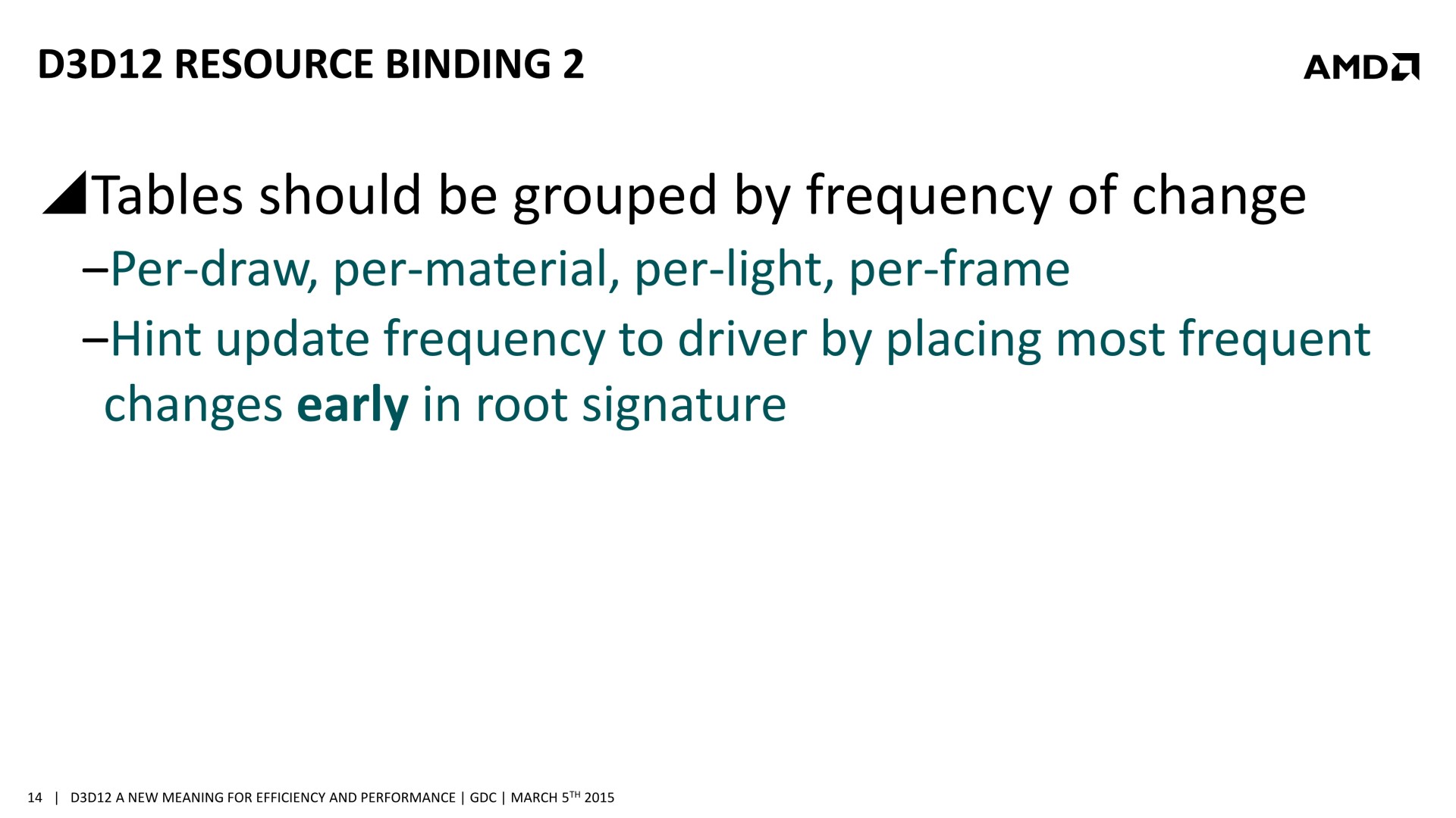 Quelques semaines après la GDC, AMD a décidé de mettre en avant ces possibilités d'optimisations auprès de la presse technique. Une présentation simplifiée nous a ainsi été distribuée il y a quelques jours. A noter que, bizarrement, elle était par contre accompagnée d'un embargo qui prenait fin ce matin… alors même que la présentation plus complète, dont nous vous avions parlé ci-dessus, est publique depuis la GDC. Peu de médias s'y étaient cependant intéressés et le département de marketing technique d'AMD a probablement voulu mettre en place une communication synchronisée sur le sujet.