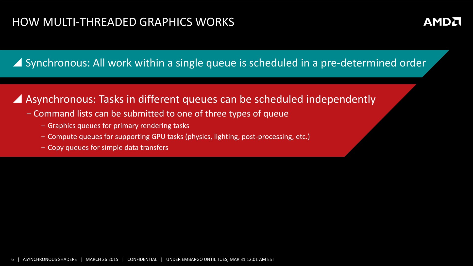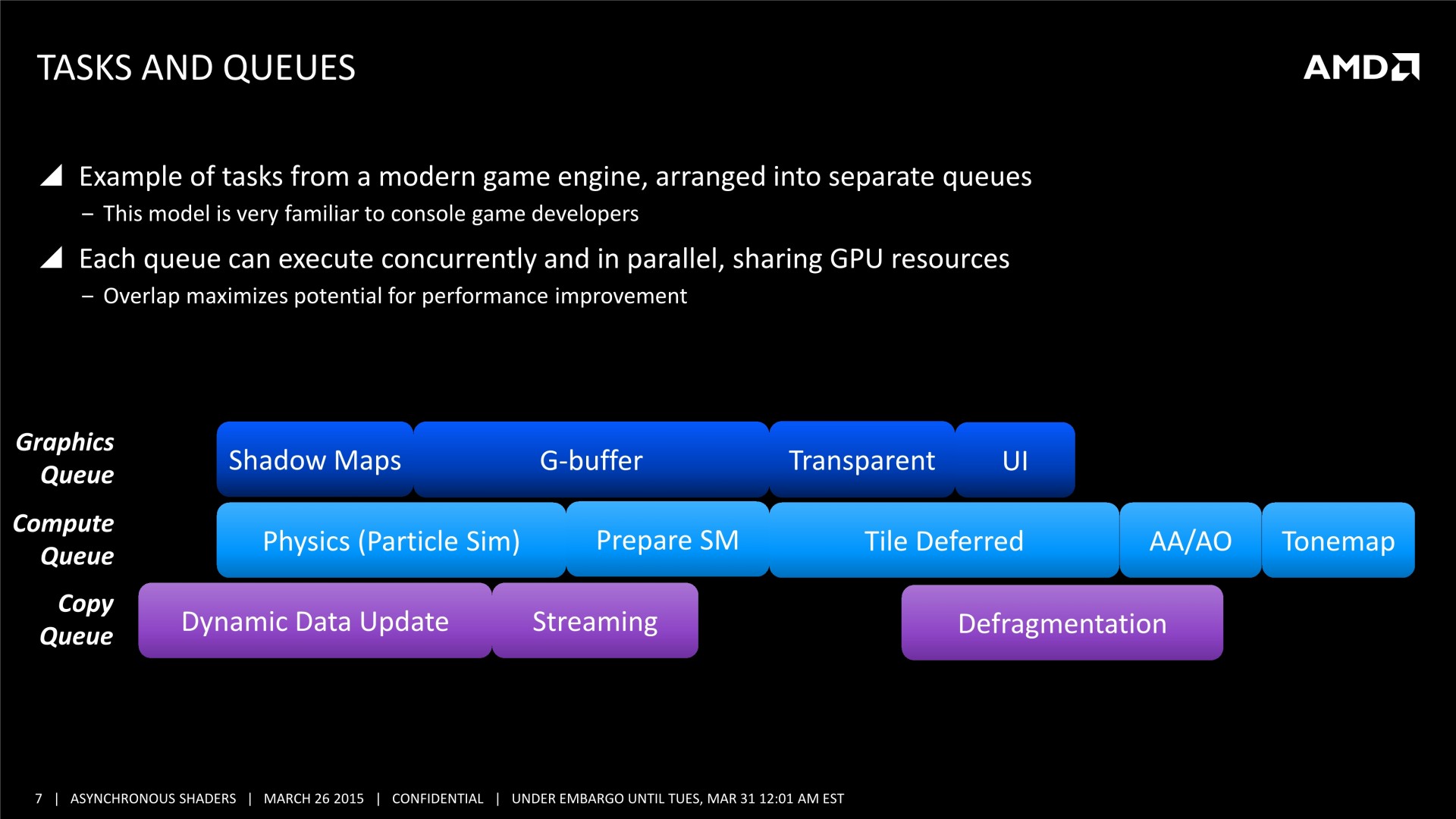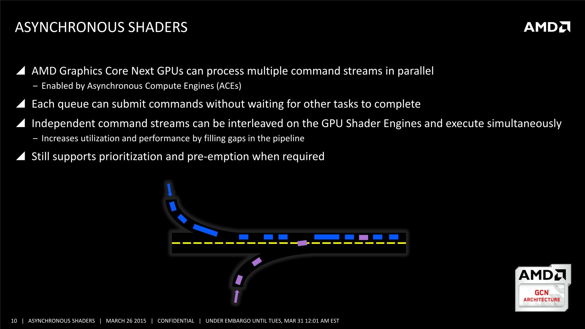 En bas de page, nous avons mis à jour cette actualité initialement publiée le 16 mars. AMD nous a transmis une nouvelle présentation sur le sujet et Nvidia nous a précisé ce dont étaient également capables ses GPU en terme de traitement simultané des tâches.