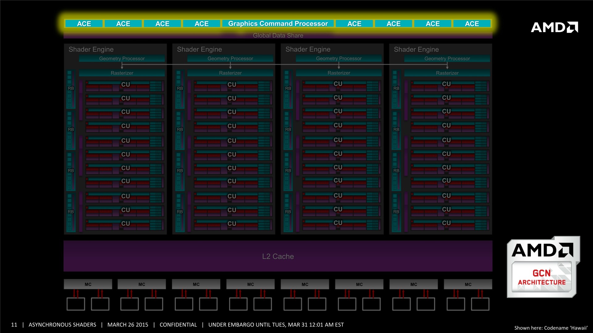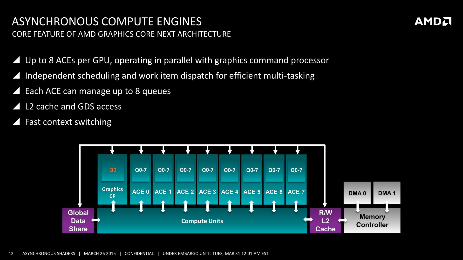 Tous les GPU de type GCN supportent le traitement concomitant des tâches Graphics/Compute/Copy. En plus d'un processeur de commande principal polyvalent, ils disposent au moins de 2 ACE (Asynchronous Compute Engine), dédiés aux tâches de type Compute, et de 2 DMA Engines dédiés aux tâches de type Copy.