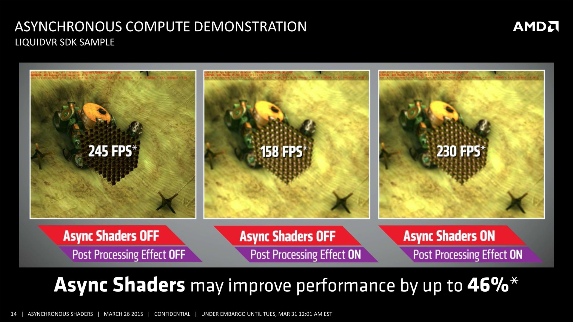 Il n'y pas pas d'information supplémentaire dans cette présentation, mais elle est plus simple à comprendre et mieux finie que celle adressée aux développeurs, nous l'avons donc ajoutée à cette longue actualité. A noter que le marketing technique d'AMD parle d'Asynchronous Shaders pour faire référence à l'exécution concomitante de différentes tâches (même si les opérations de type Copy ne sont pas des shaders). Vous pourrez également observer le résultat obtenu sous une autre démo, que nous avions pu observer également pendant la GDC durant la présentation de LiquidVR. L'utilisation du traitement concomitant du rendu (Graphics) et du post processing (Compute) y permet un gain de performances de 46%.