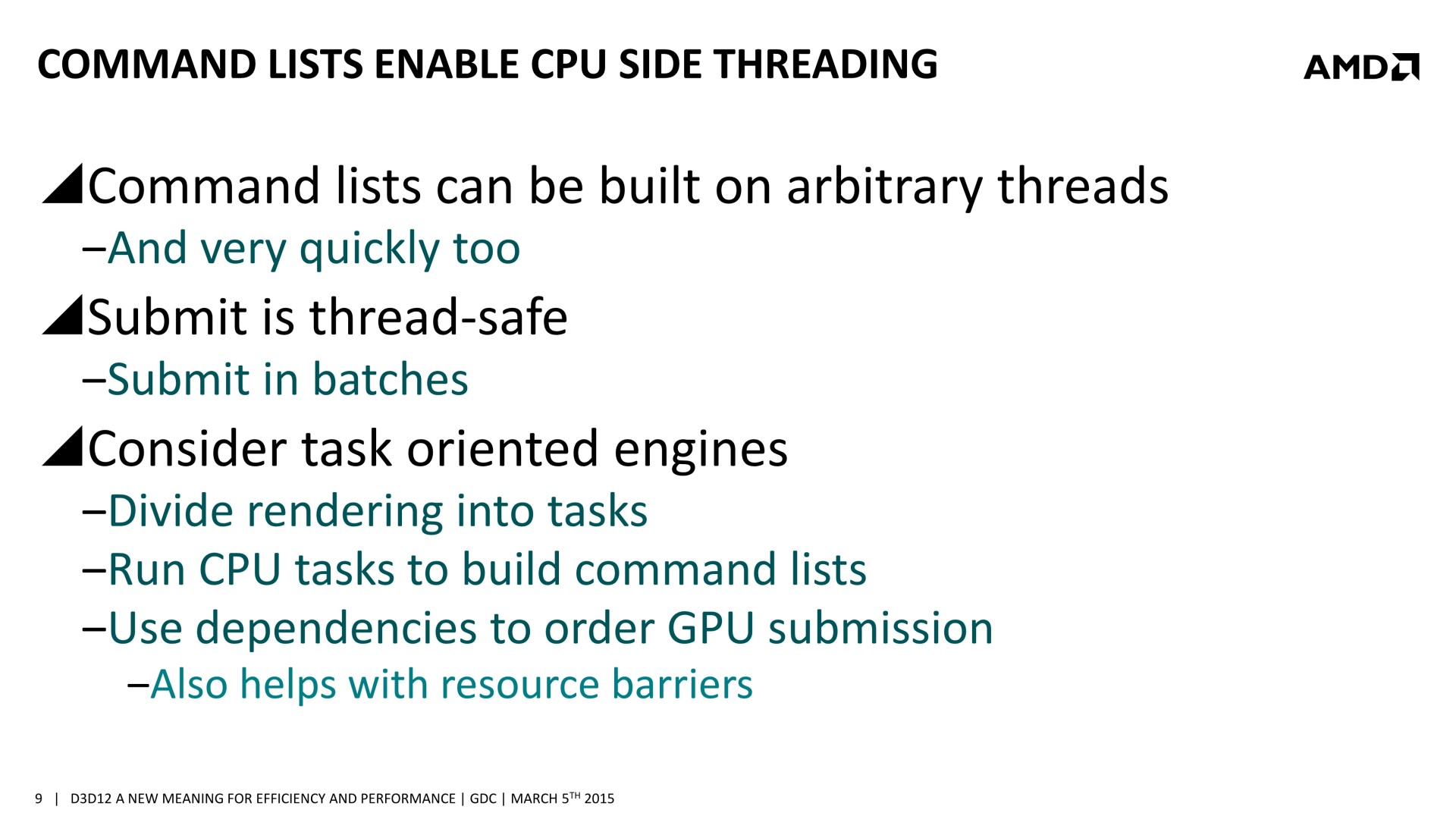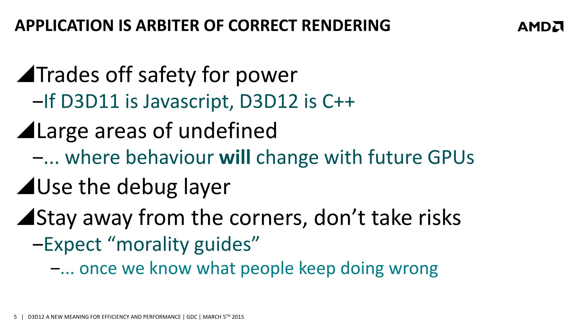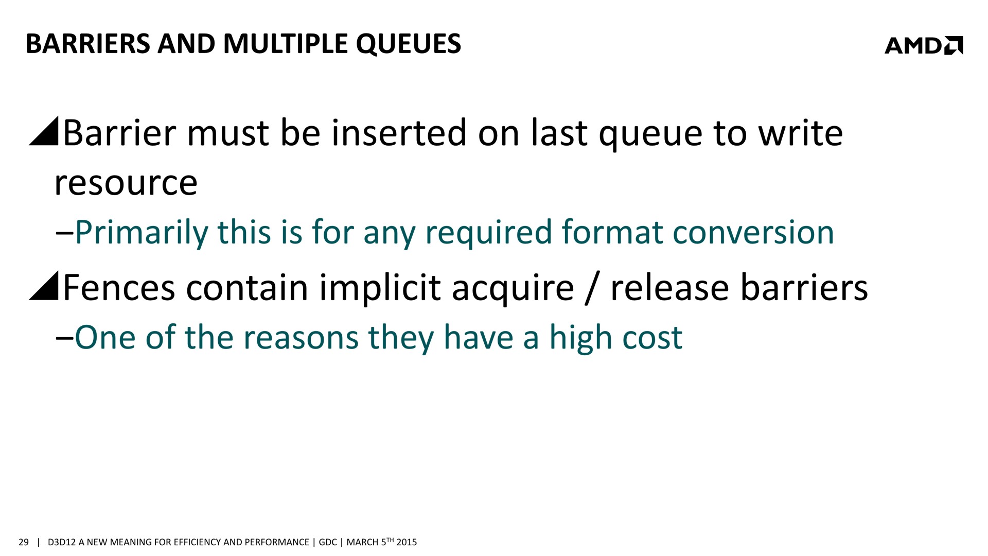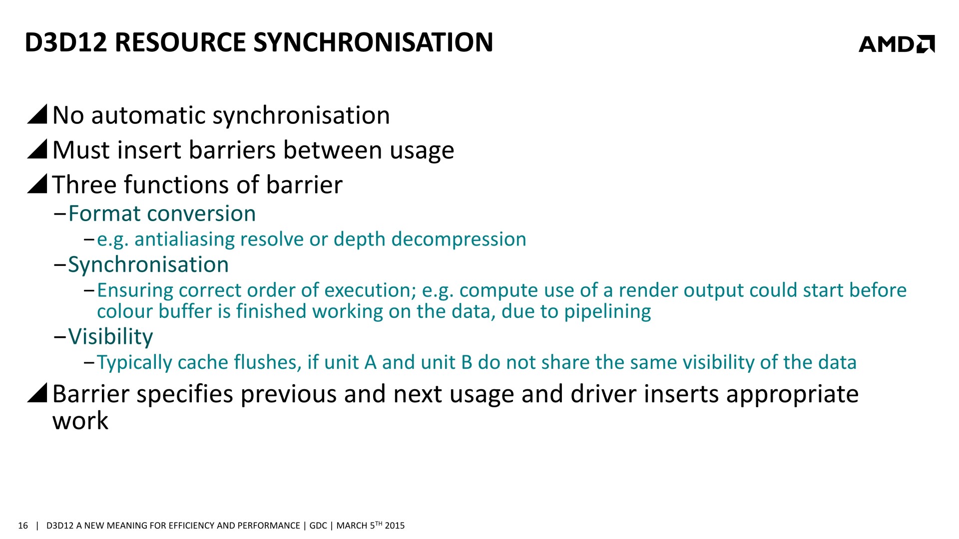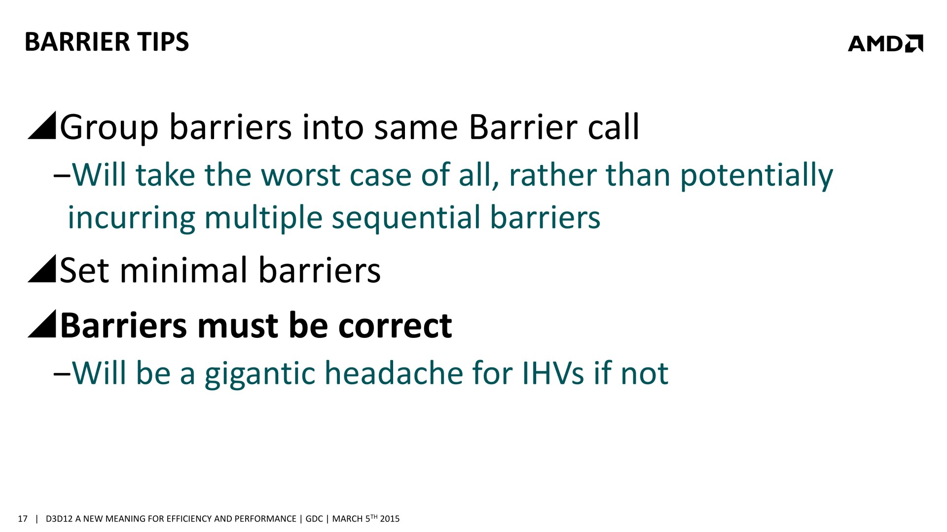 Une bonne compréhension des architectures GPU et un profilage avancé des demandes de chaque tâche sont nécessaires. Il est également crucial de mettre en place correctement les barrières de synchronisation nécessaires, sans quoi des tâches dépendantes l'une de l'autre pourraient être exécutées en parallèle et causer des problèmes. AMD a insisté lourdement sur ce point, précisant que l'absence de barrières de synchronisation adéquates pourra passer inaperçue dans l'immédiat, sans bug visible, mais être source de gros problèmes avec de futurs GPU dont l'augmentation des performances profitera plus à certaines tâches qu'à d'autres. Comme le sait très bien AMD, les développeurs seront peu enclins à proposer un patch 2 ou 3 ans après la sortie d'un jeu, et appliquer un correctif au niveau des pilotes sera alors un véritable casse-tête, voire impossible dans certains cas.