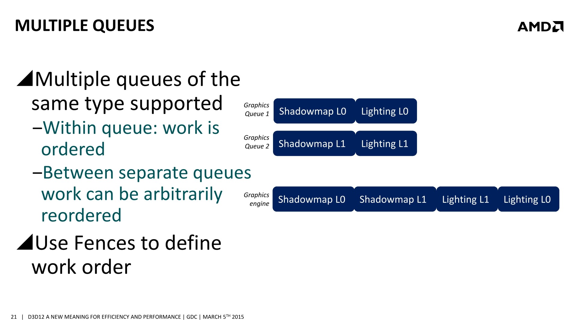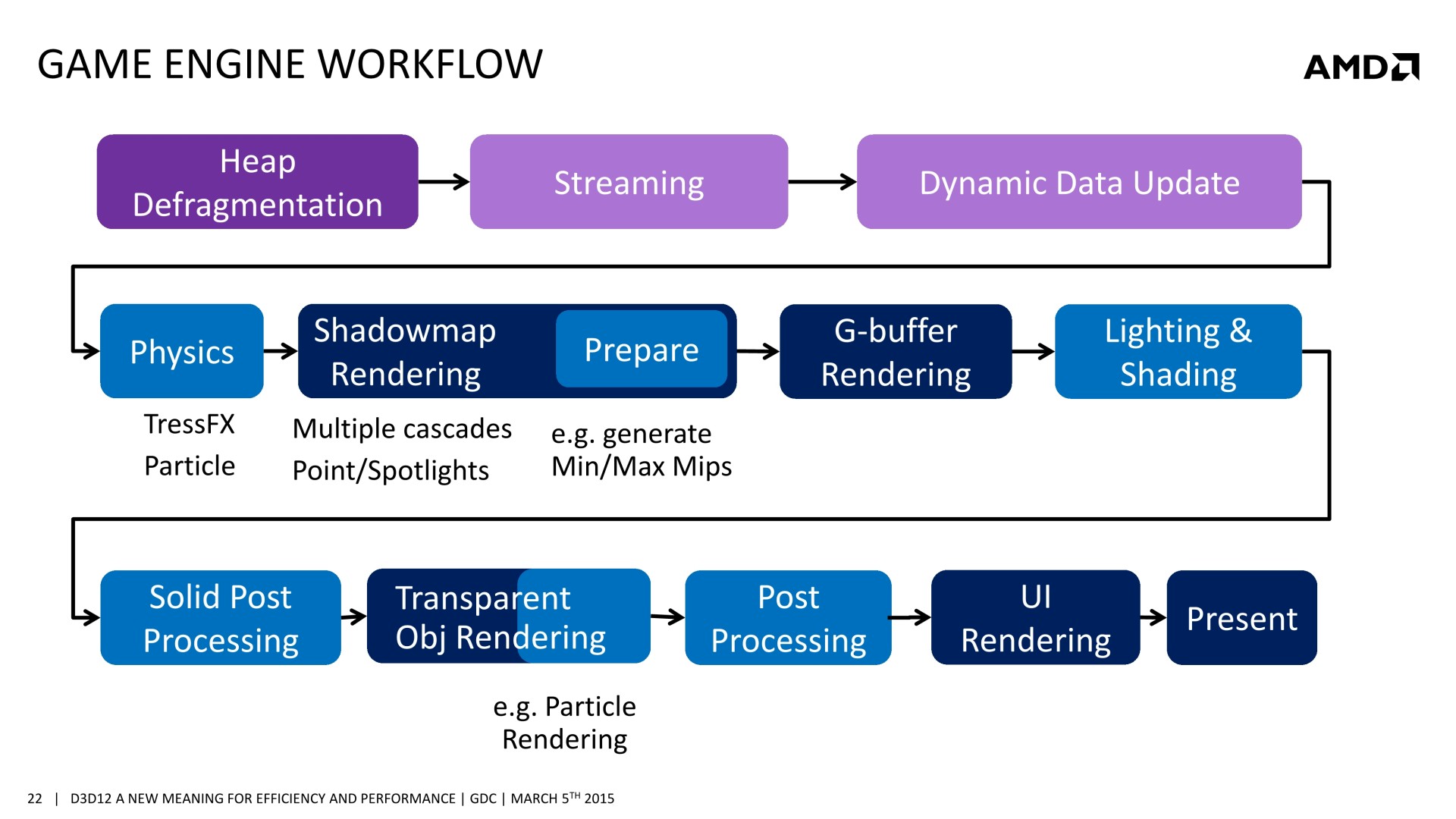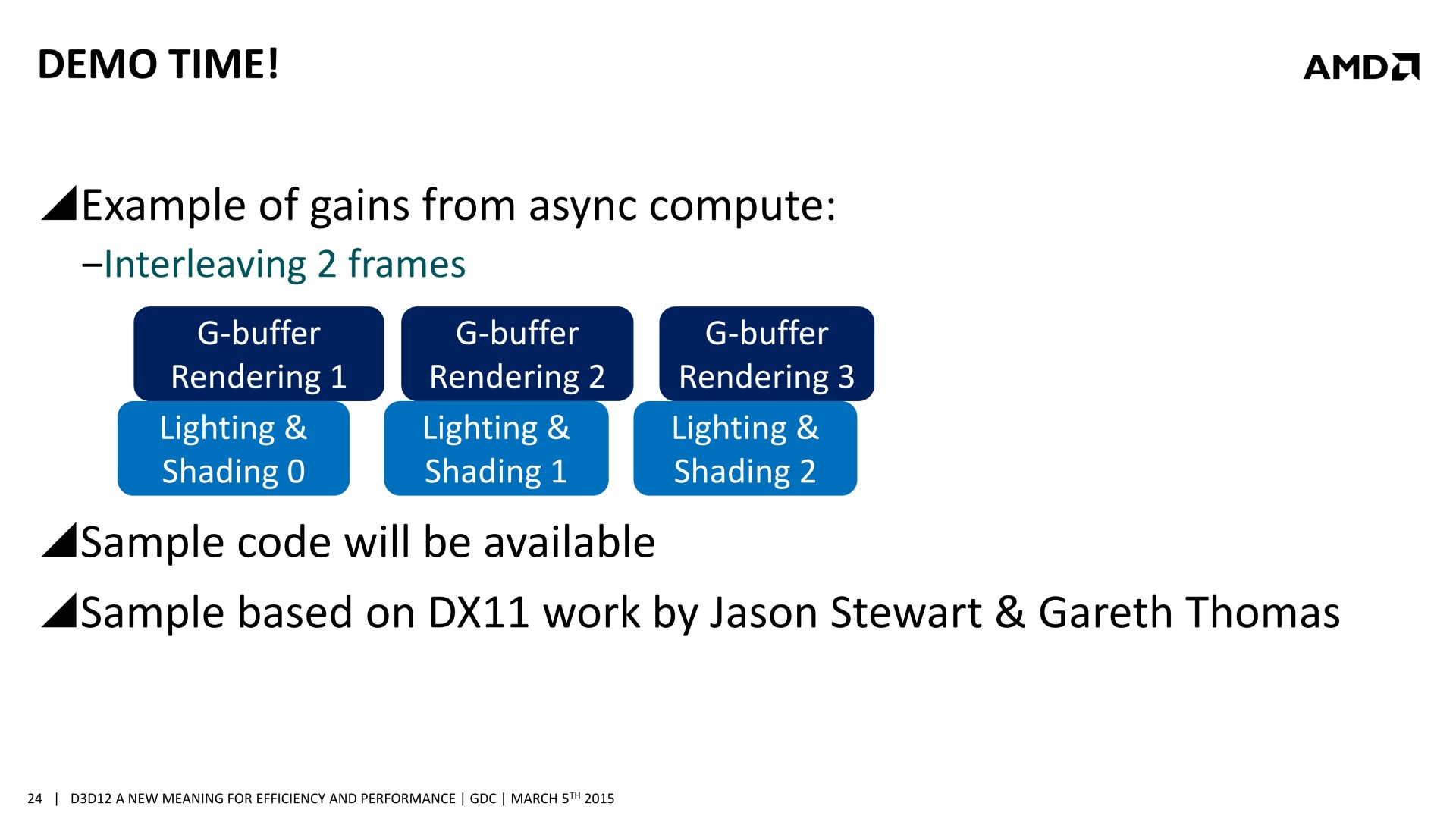De nombreuses sessions dédiées à Direct3D 12 étaient organisées à la GDC. Après celle de Microsoft consacrée à Direct3D, lors de laquelle les niveaux de fonctionnalités ont été mentionnés et des démonstrations ont été faites sur du matériel Nvidia, nous avons assisté à la session d'AMD. Lors de celle-ci, il a été question d'une nouvelle opportunité d'optimisation : améliorer les performances GPU en profitant du traitement simultané de certaines tâches liées au rendu 3D.