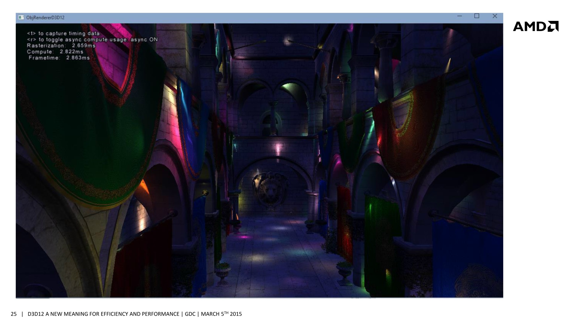 Sans traitement concomitant des tâches Graphics et Compute, le temps de rendu total prend 3.346ms (299 fps), ce qui est la somme des 2.551ms de la partie Graphics (remplissage du G-Buffer) et des 0.747ms de la partie Compute (calcul de l'éclairage). En activant le traitement concomitant dans cette démonstration, le remplissage du G-Buffer prend 2.659ms, et le calcul de l'éclairage 2.822ms. Ces deux tâches prennent plus de temps à être traitées, mais elles le sont en même temps et le rendu total ne prend plus que 2.863ms (349 fps), ce qui représente un gain de 17%. La latence peut par contre être légèrement plus élevée.
