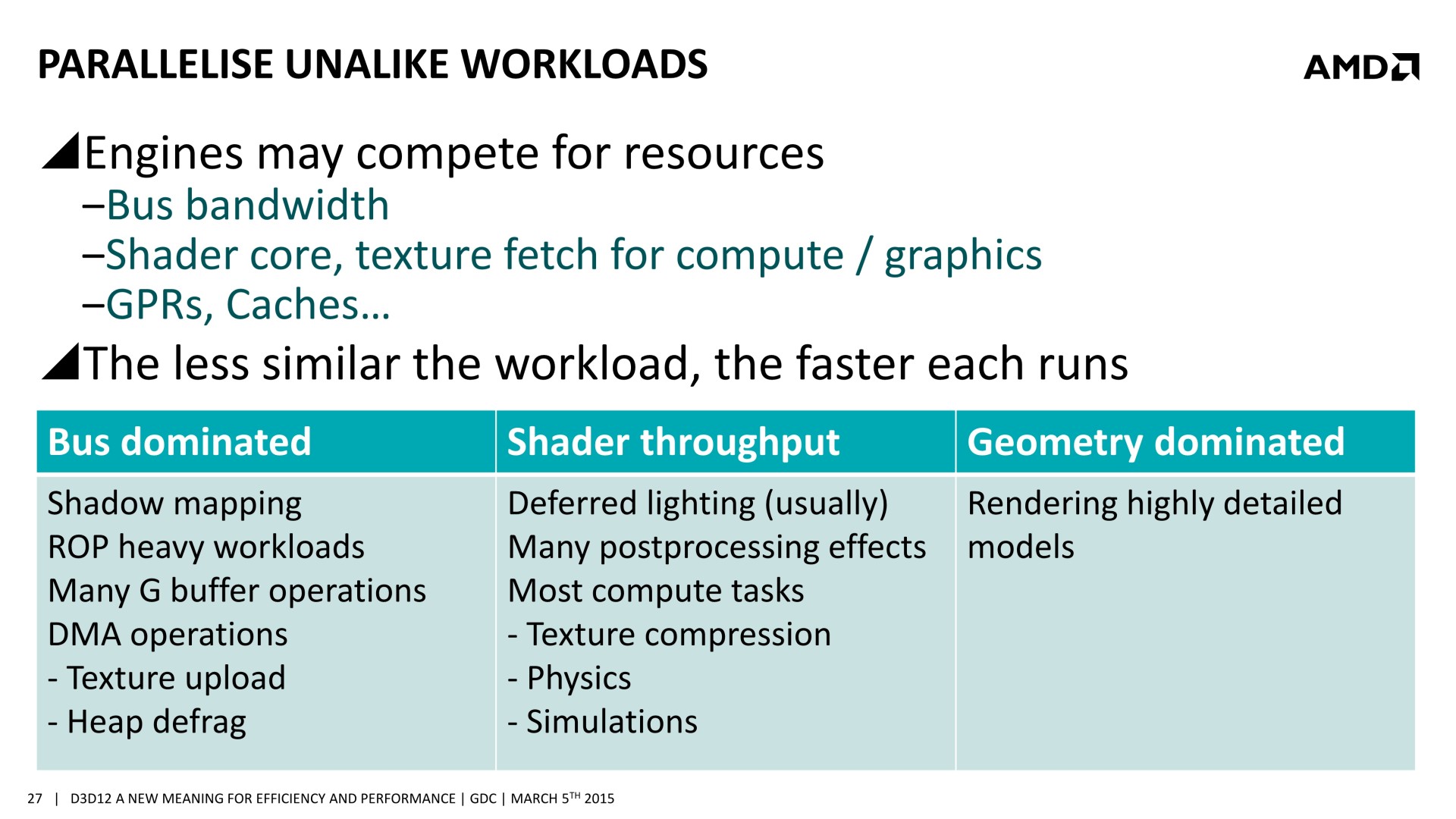 Chacune de ces tâches n'exploite cependant pas la totalité des capacités d'un GPU. Par exemple, la préparation des ombres et le remplissage du G-Buffer vont plutôt saturer le sous-système mémoire alors que la physique, l'éclairage et le post processing ont plutôt tendance à saturer les unités de calcul. Il semble ainsi logique que traiter en même temps certaines de ces tâches représente une optimisation intéressante pour mieux exploiter les GPU.